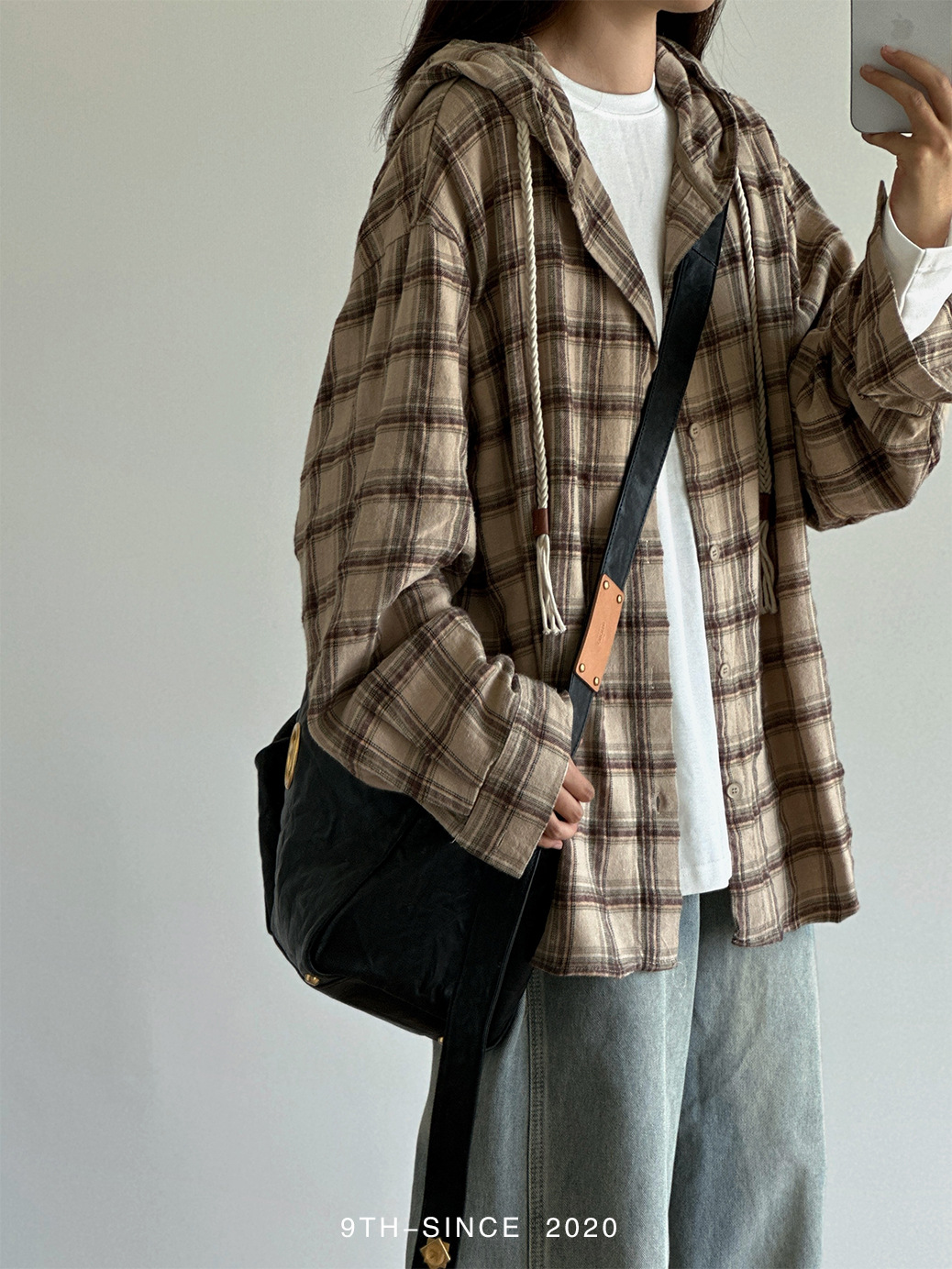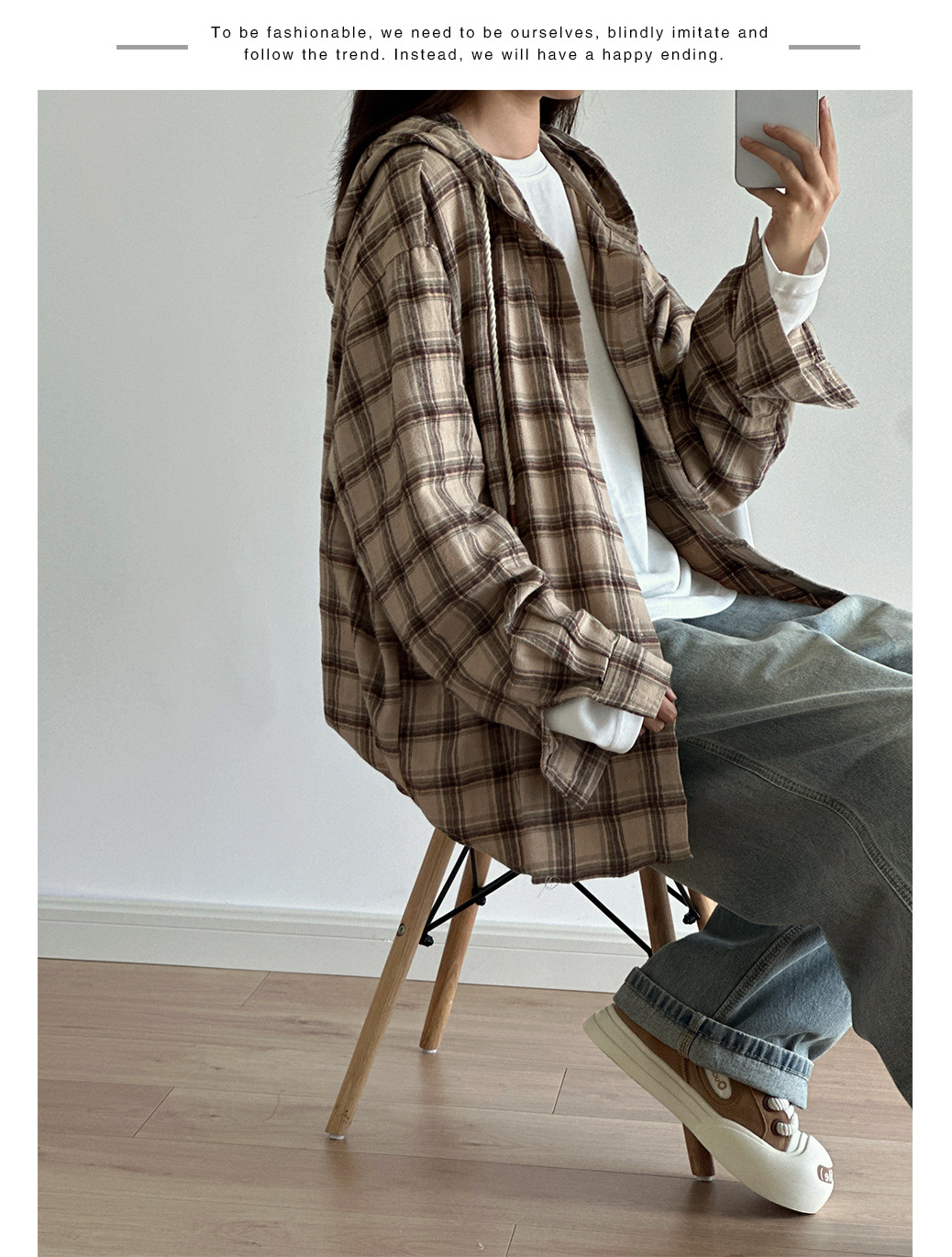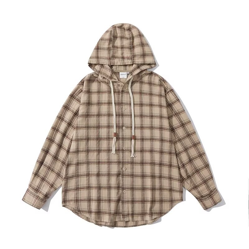 후드가 달린 스크럽 격자 무늬 셔츠 일본 스타일 빈티지 커피 컬러 매칭 카키 느슨한 남성과 여성을위한 올 매치 캐주얼 스웨트 셔츠 재킷 봄과 가을