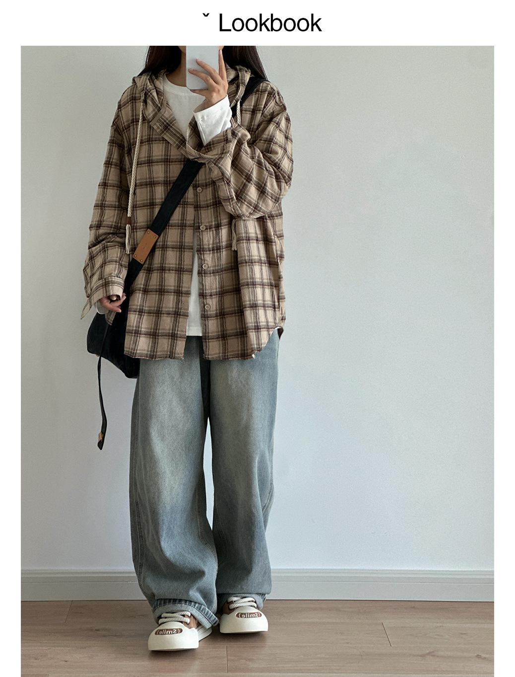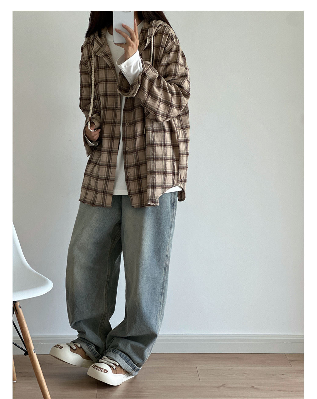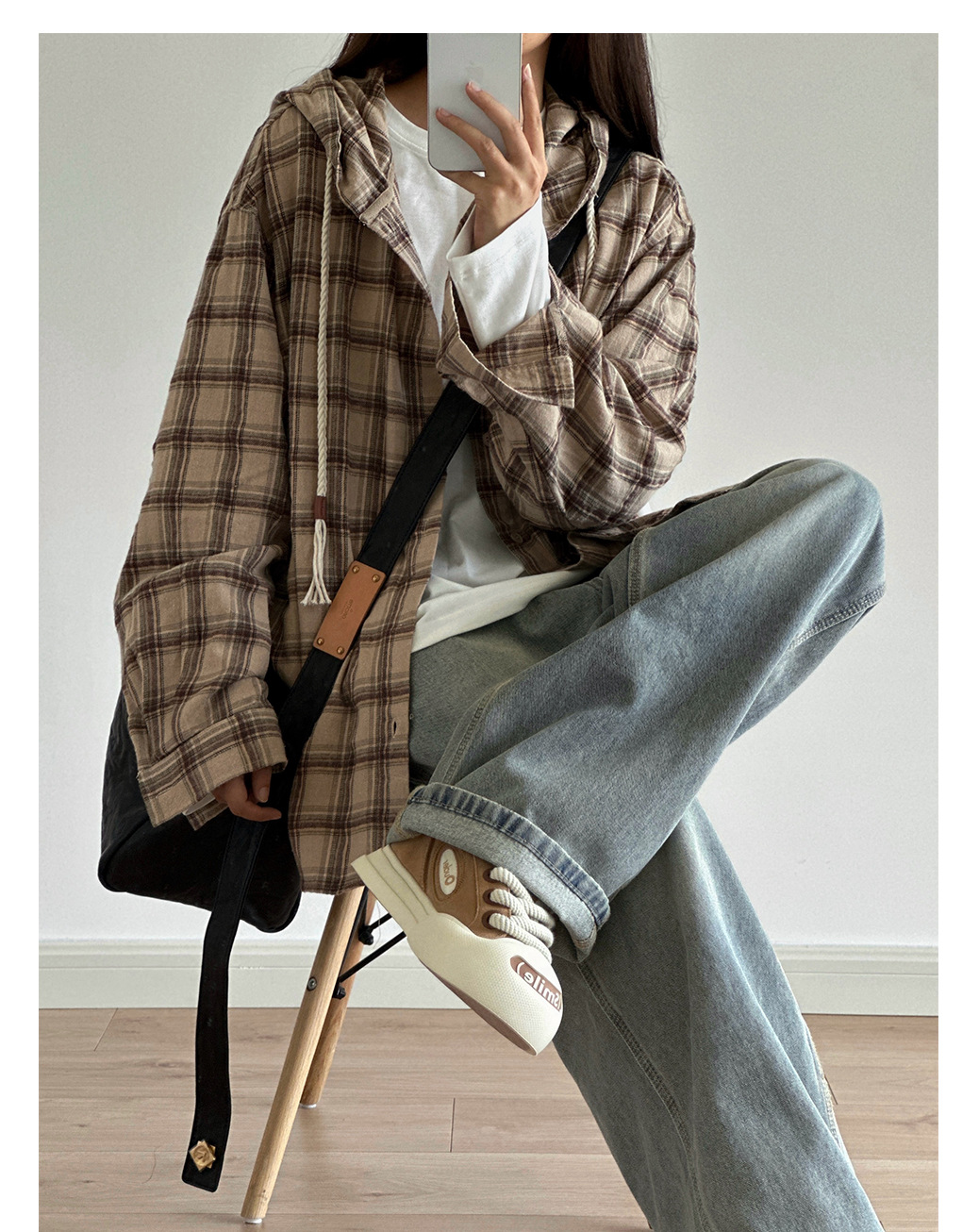 후드가 달린 스크럽 격자 무늬 셔츠 일본 스타일 빈티지 커피 컬러 매칭 카키 느슨한 남성과 여성을위한 올 매치 캐주얼 스웨트 셔츠 재킷 봄과 가을