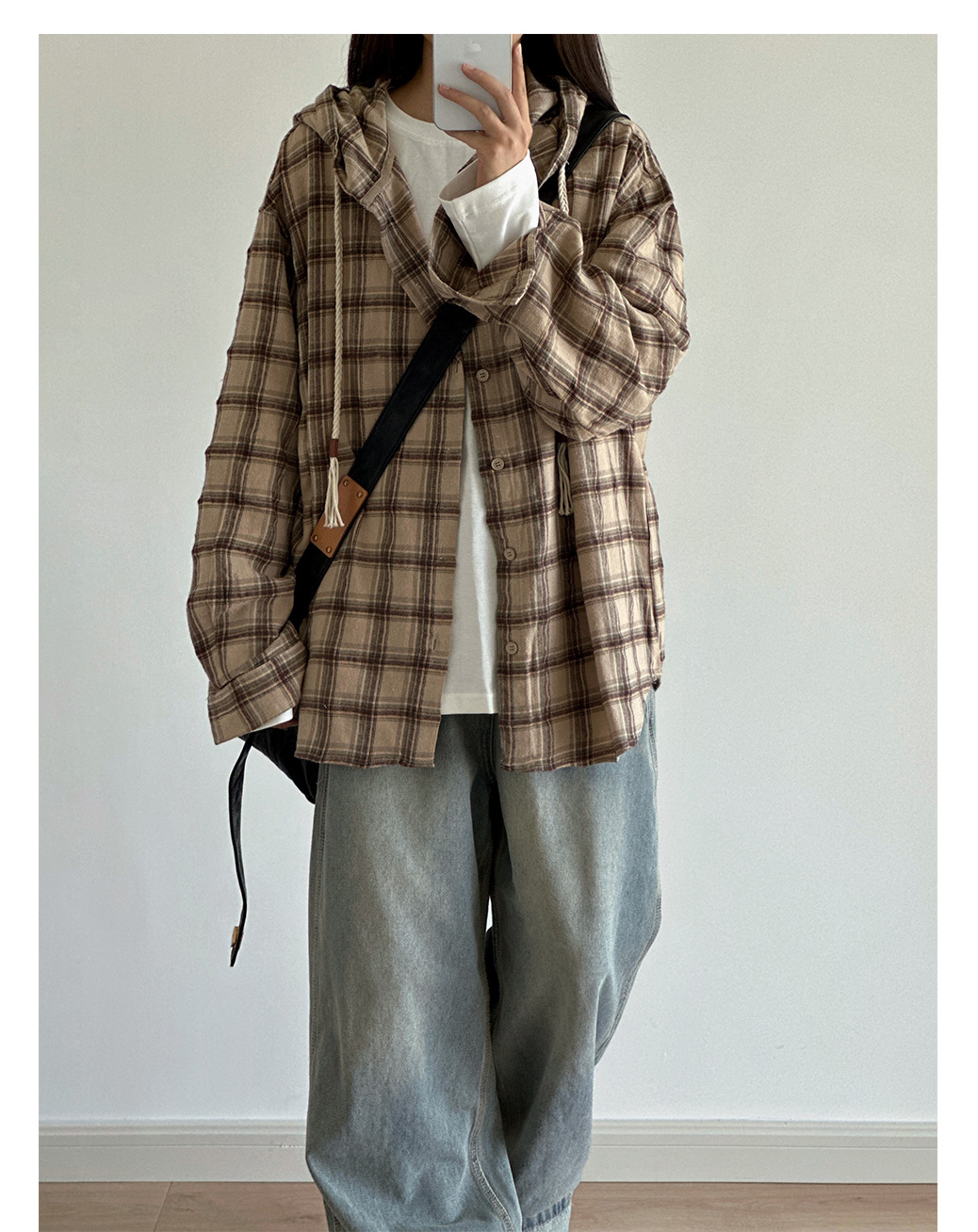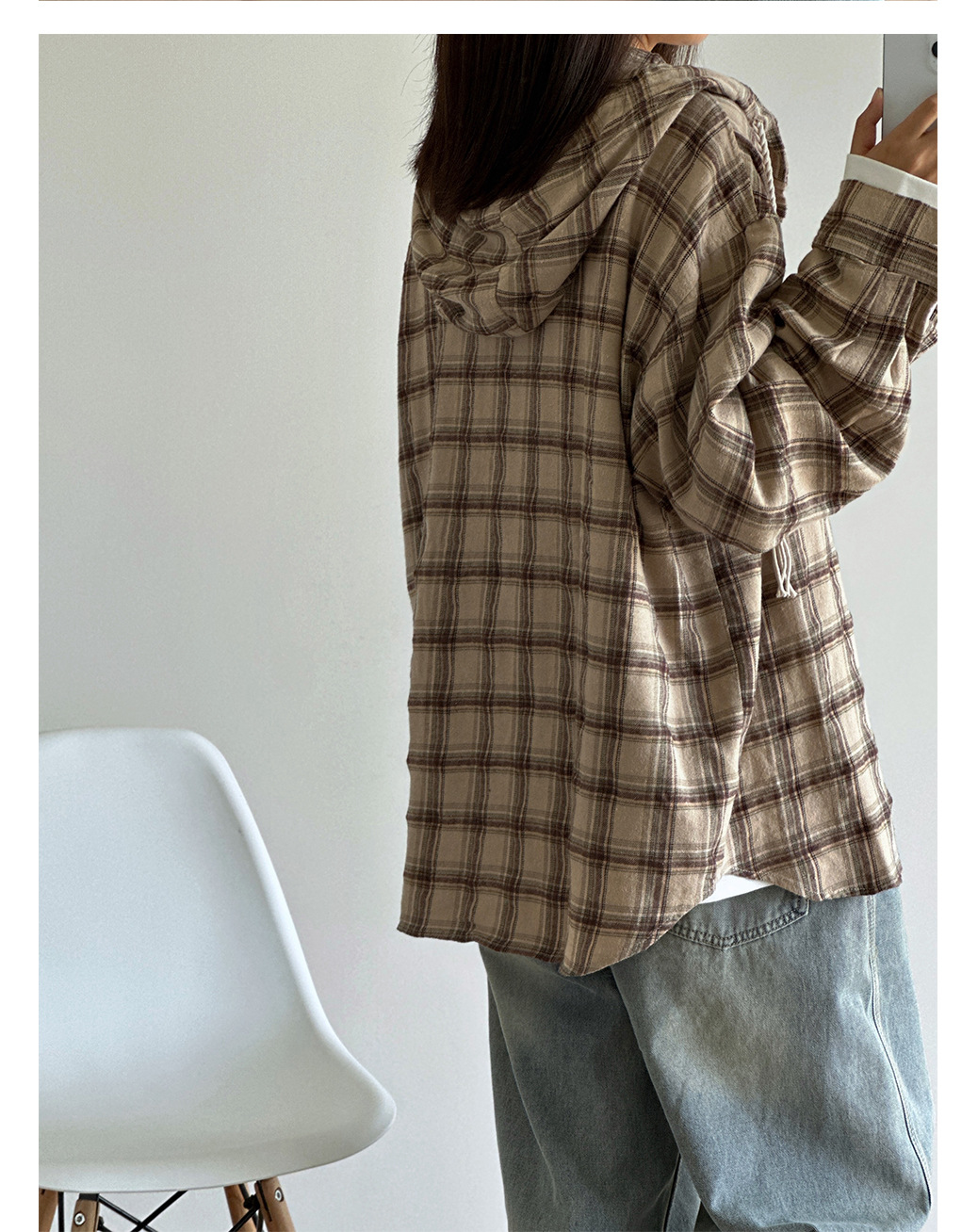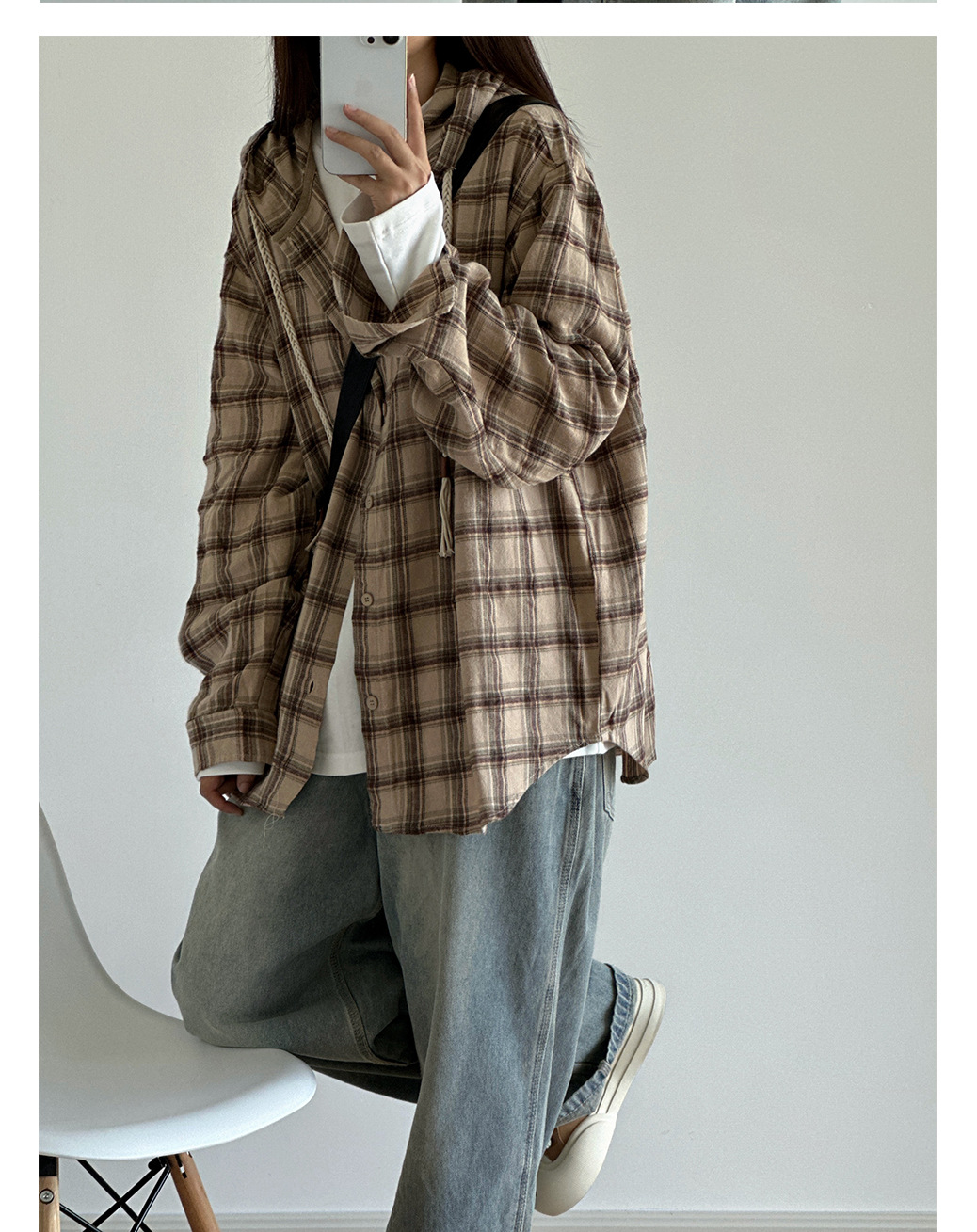 후드가 달린 스크럽 격자 무늬 셔츠 일본 스타일 빈티지 커피 컬러 매칭 카키 느슨한 남성과 여성을위한 올 매치 캐주얼 스웨트 셔츠 재킷 봄과 가을스토어 가기