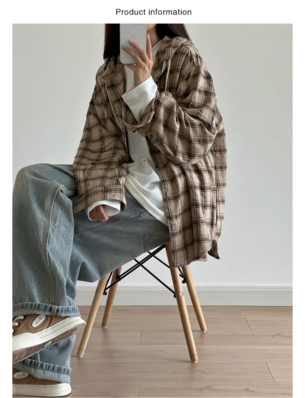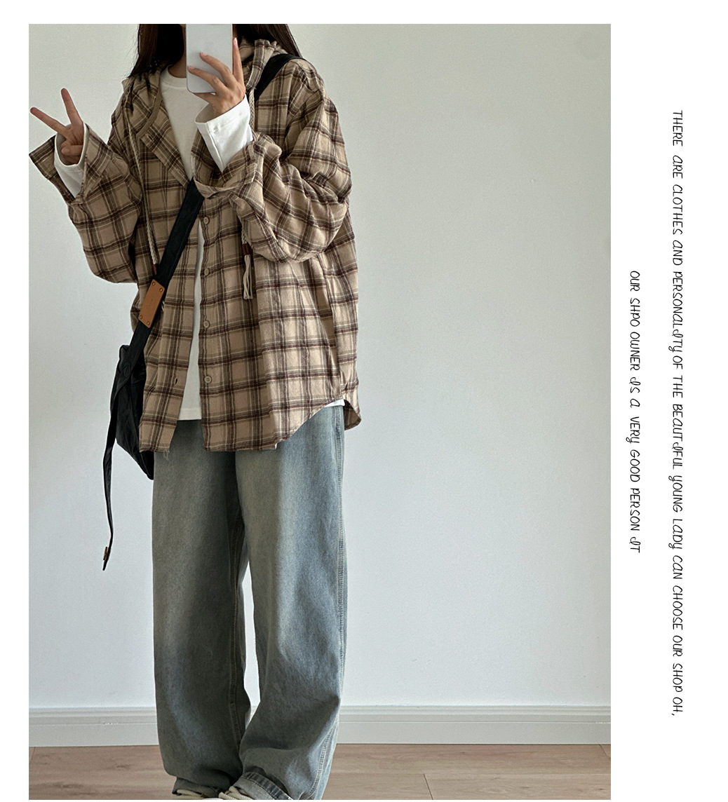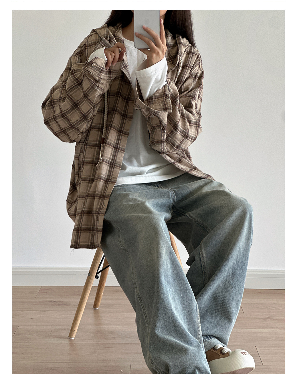 후드가 달린 스크럽 격자 무늬 셔츠 일본 스타일 빈티지 커피 컬러 매칭 카키 느슨한 남성과 여성을위한 올 매치 캐주얼 스웨트 셔츠 재킷 봄과 가을스토어 가기