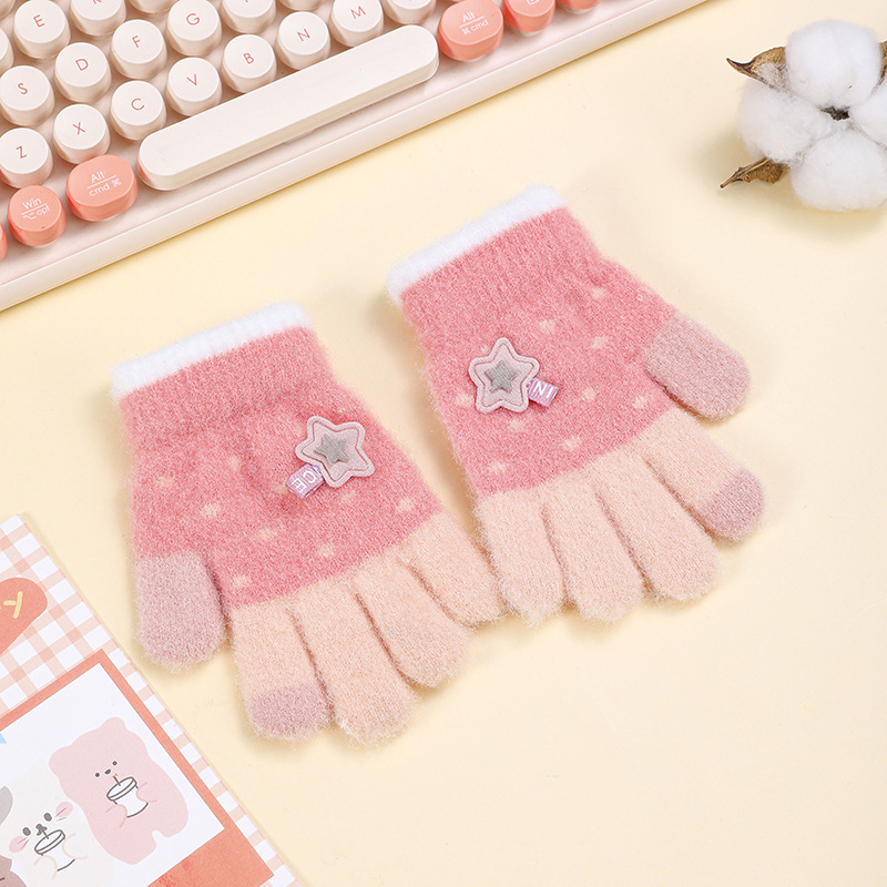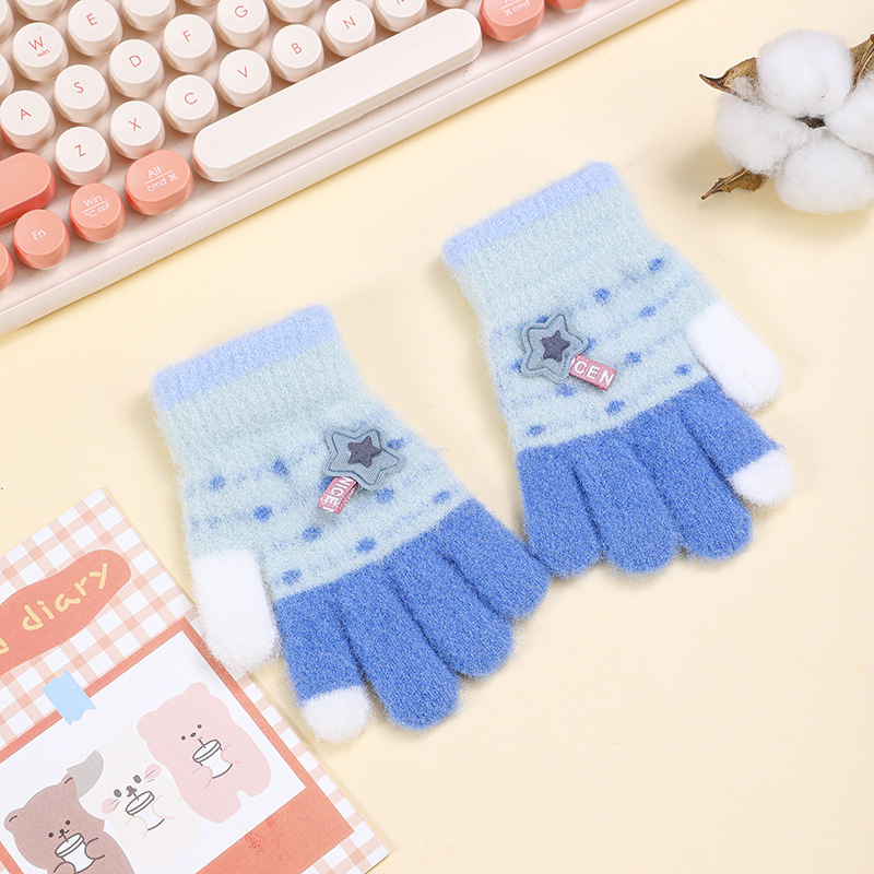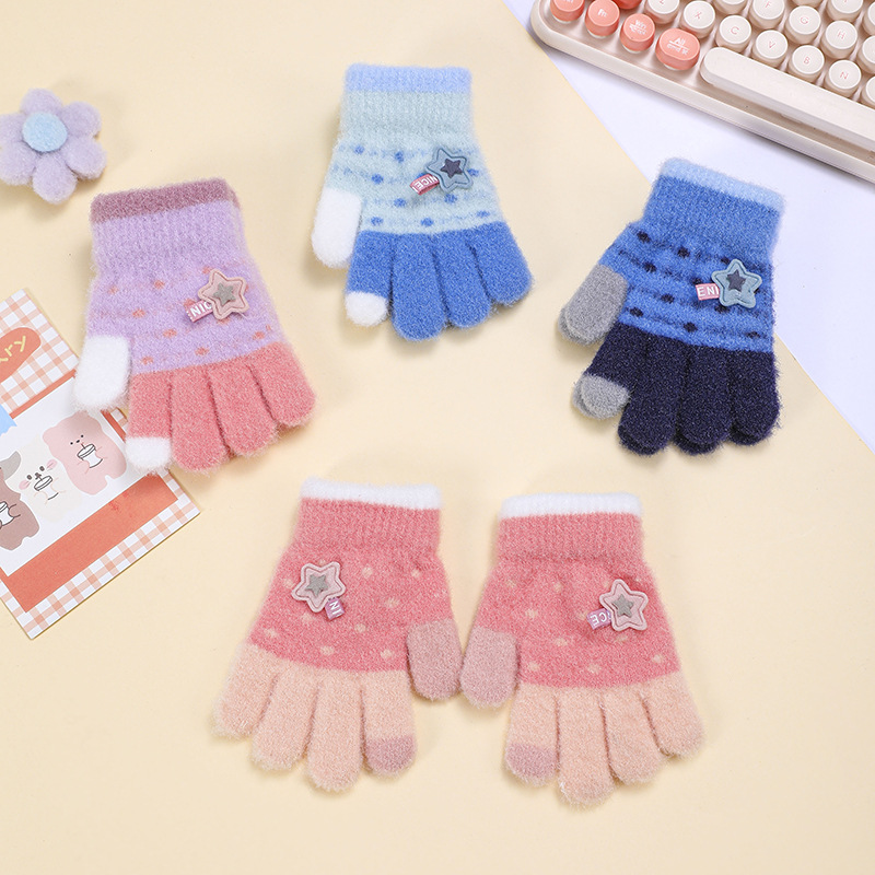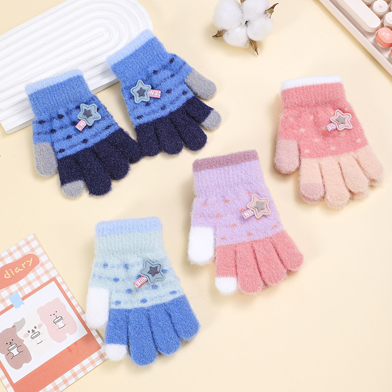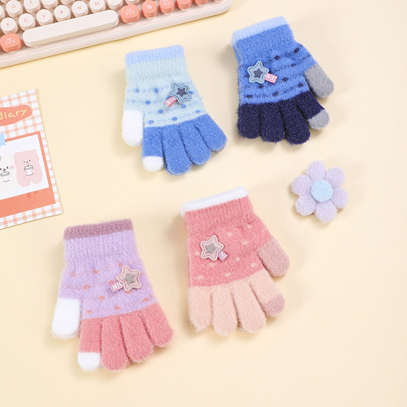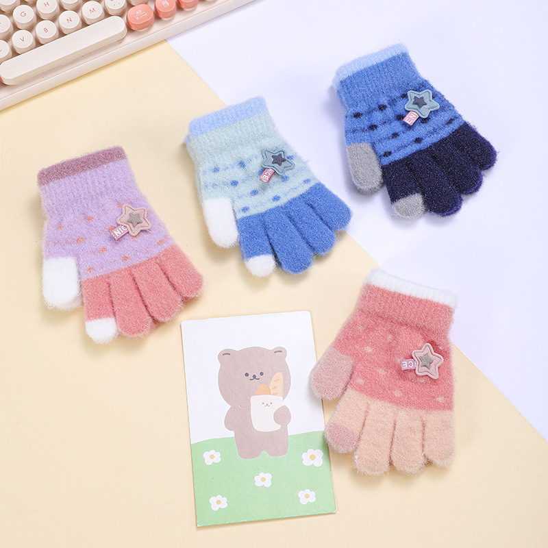 가을 겨울 어린이용 모직 장갑 남녀공용 보온 방한 아기 별 모양 다섯 손가락 장갑 귀여운 니트 장갑