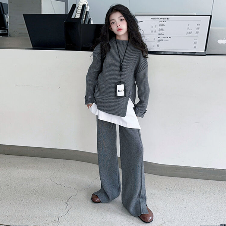 여아 가을 겨울 스웨터 세트 2025 신상 한국 스타일 중대형 어린이용 짙은 회색 니트 상의 와이드 팬츠 트렌디스토어 가기