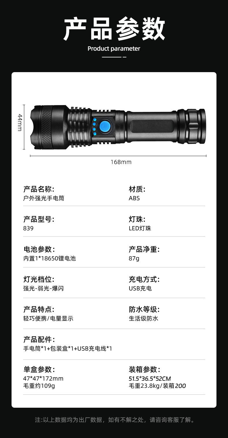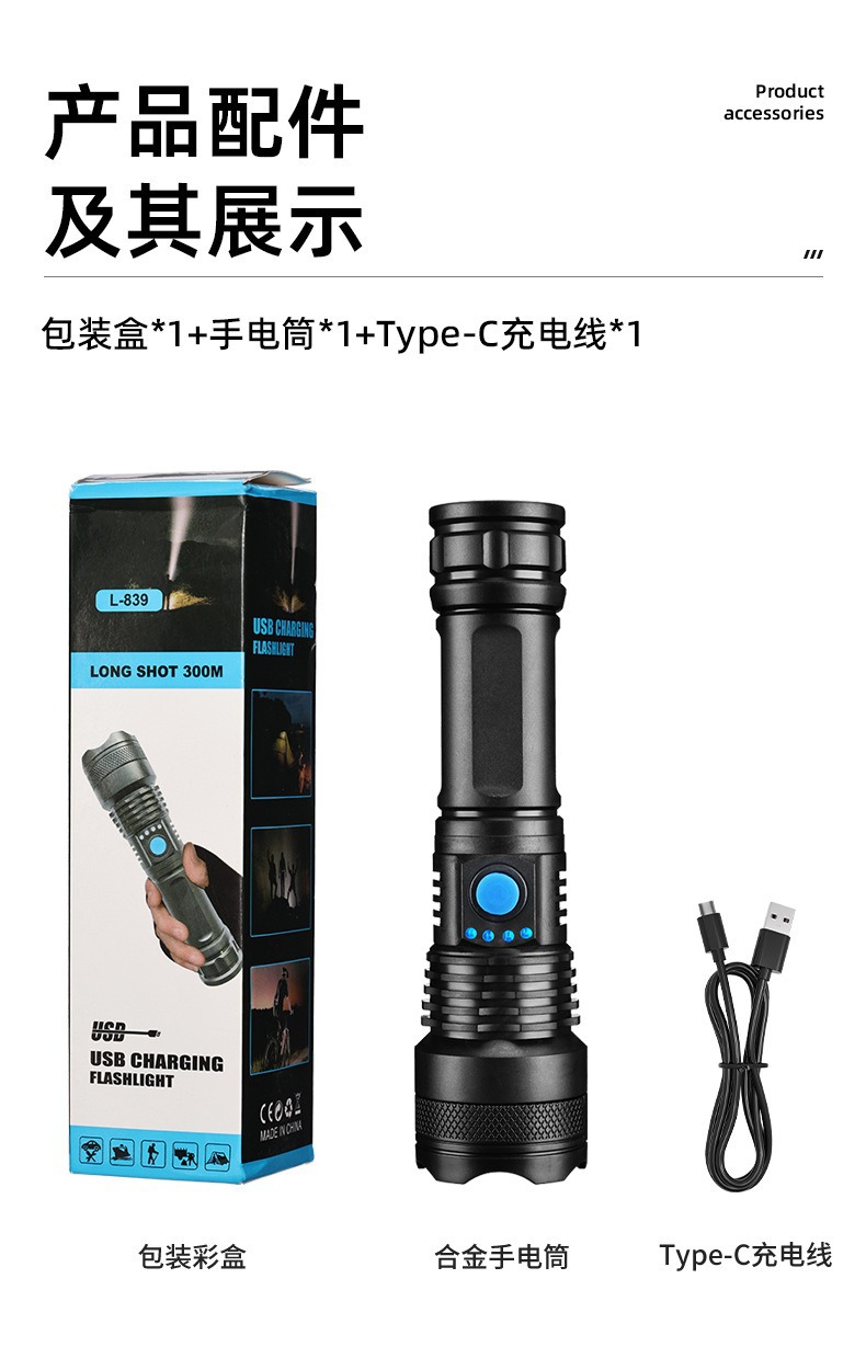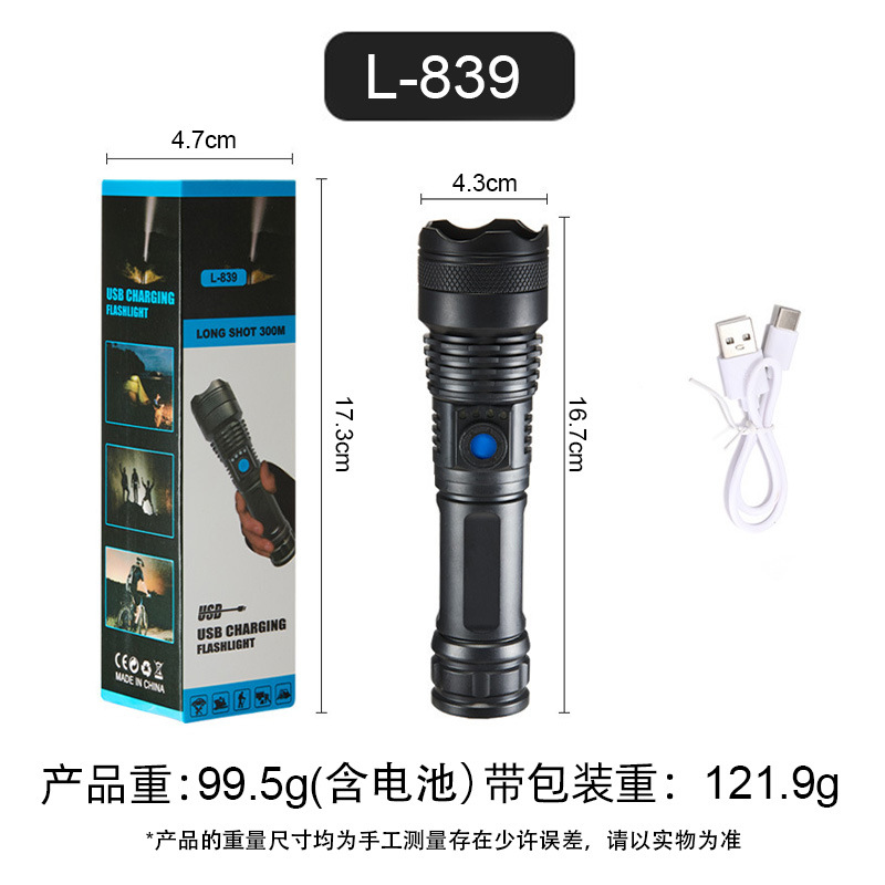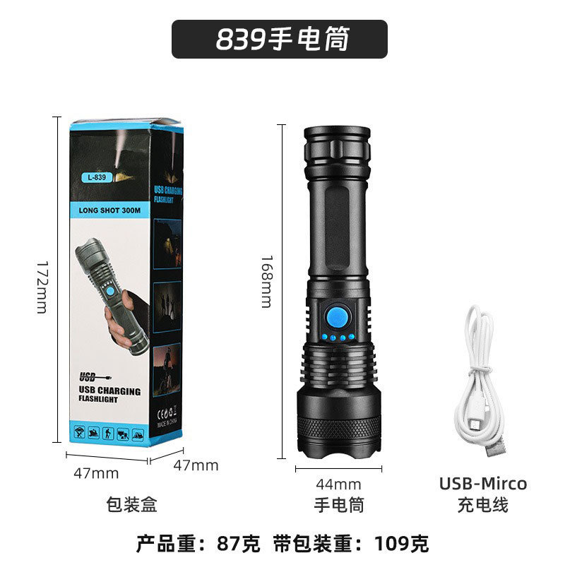• 839: 손전등 + 데이터 케이블 + 컬러 박스(14500 리튬 배터리)