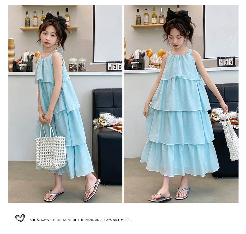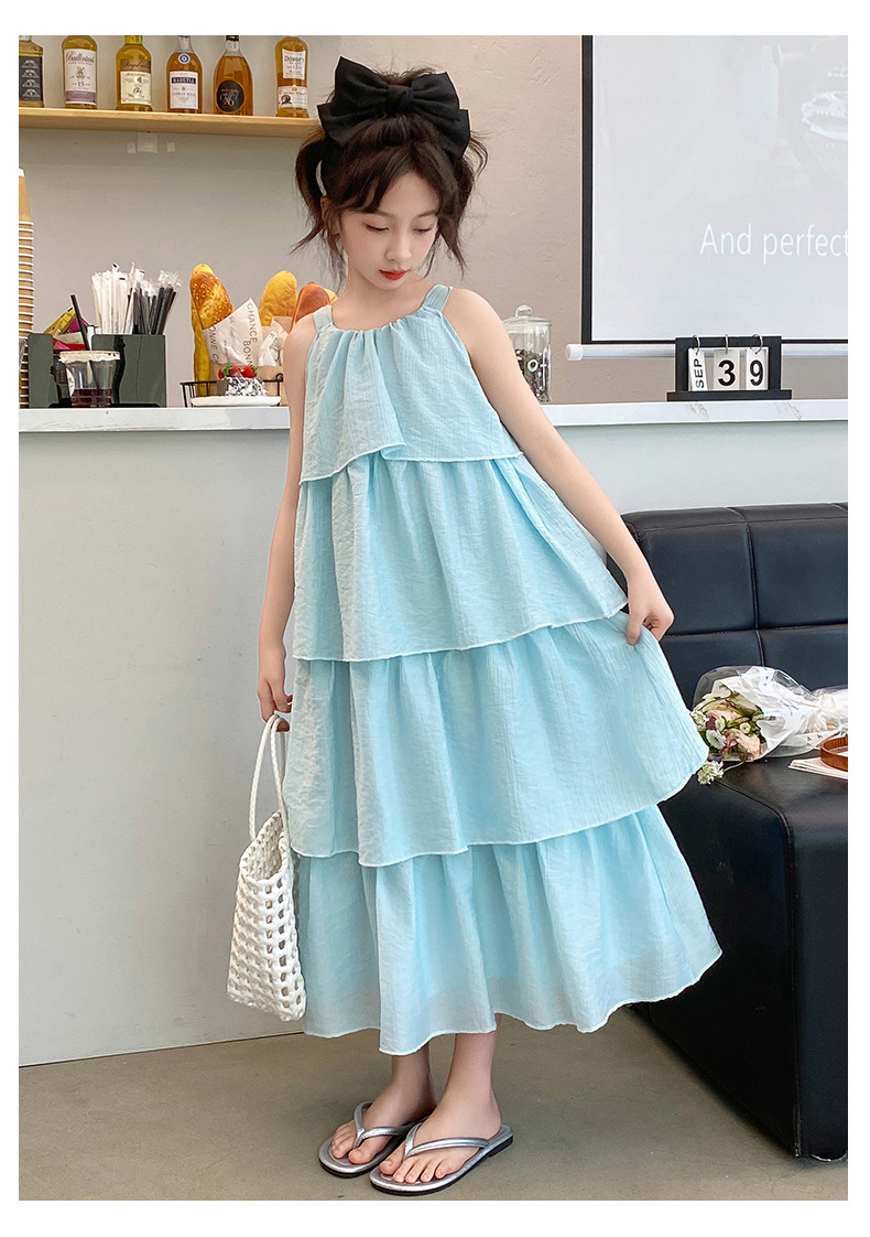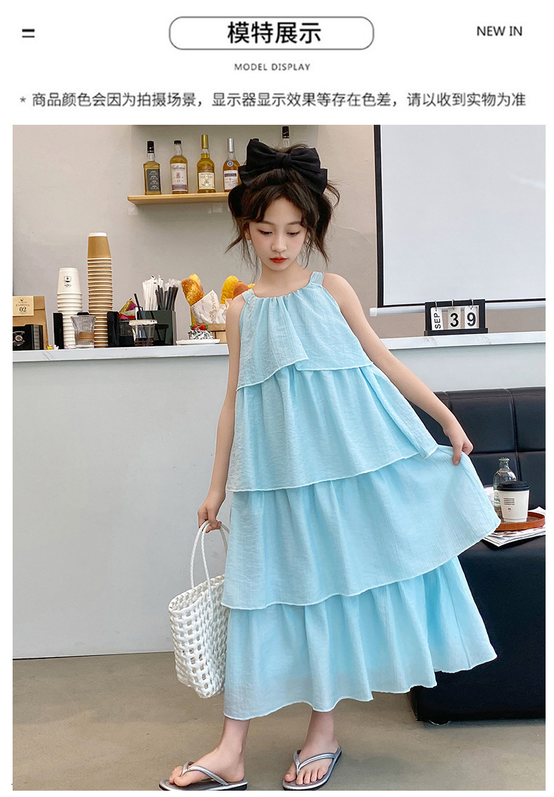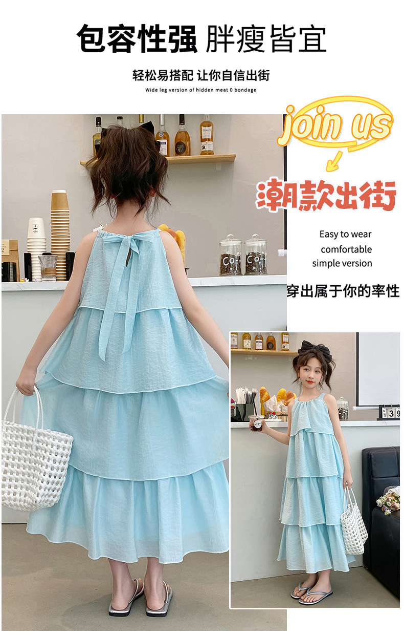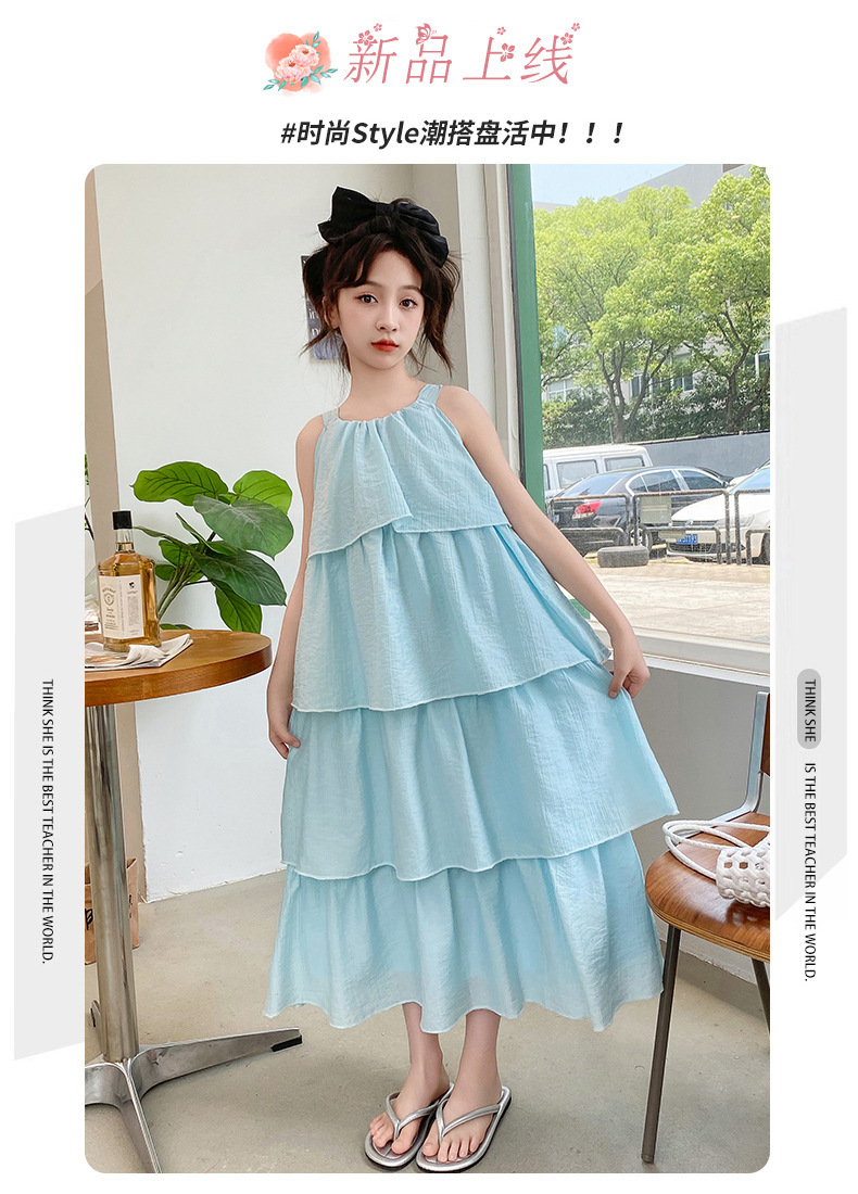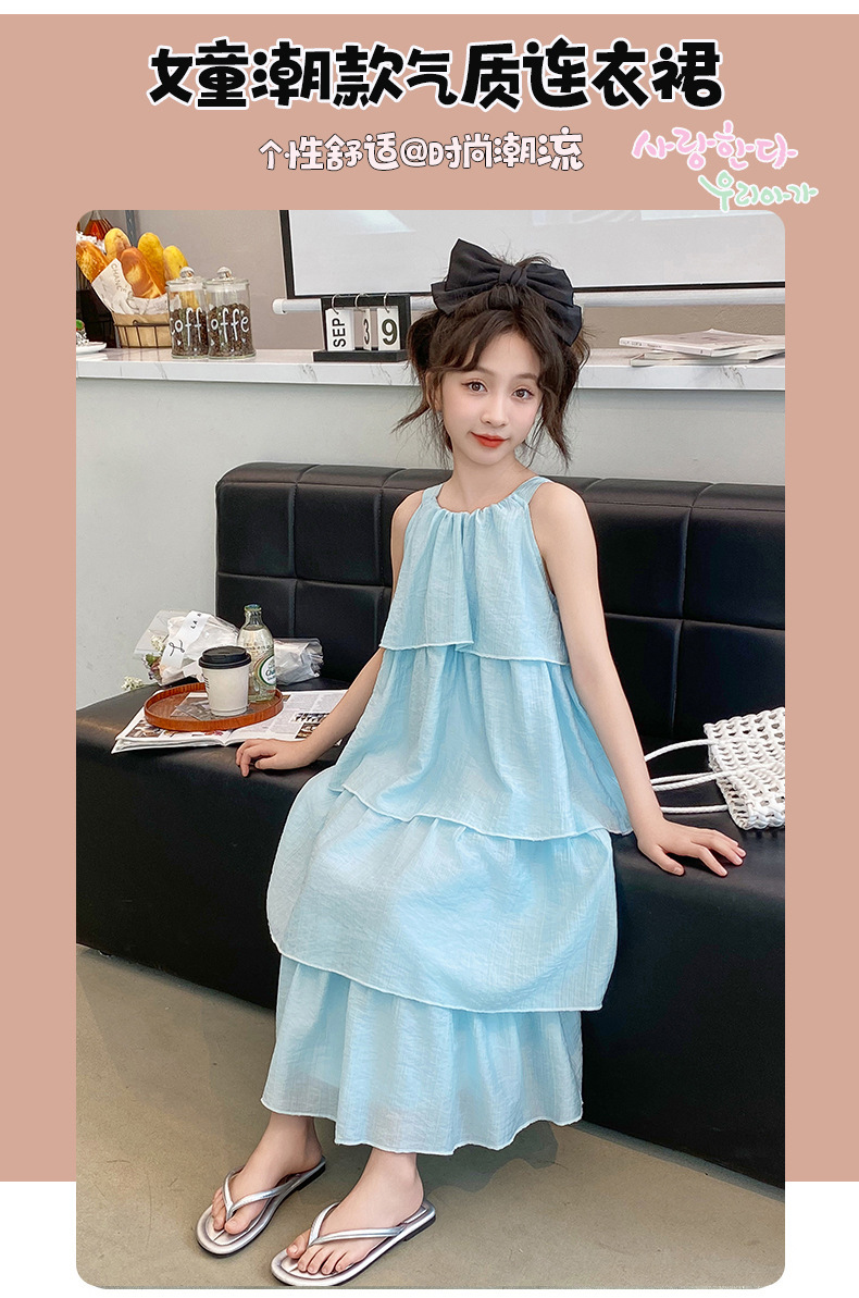 여름 소녀 원피스 2024 새로운 스타일 미드 빅 어린이 휴가 민소매 스트랩 비치 스커트 인터넷 축하 케이크 스커트 트렌디스토어 가기