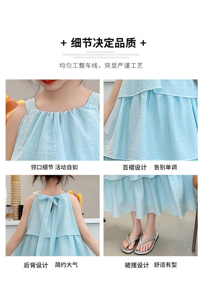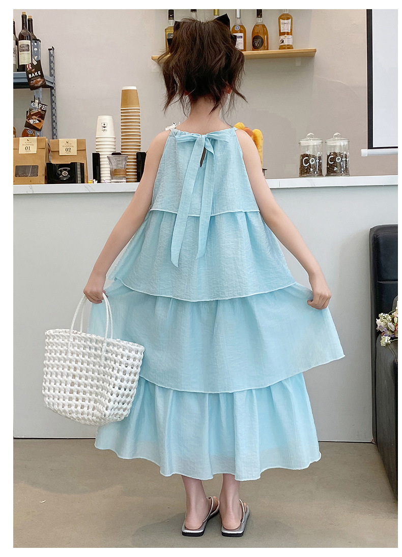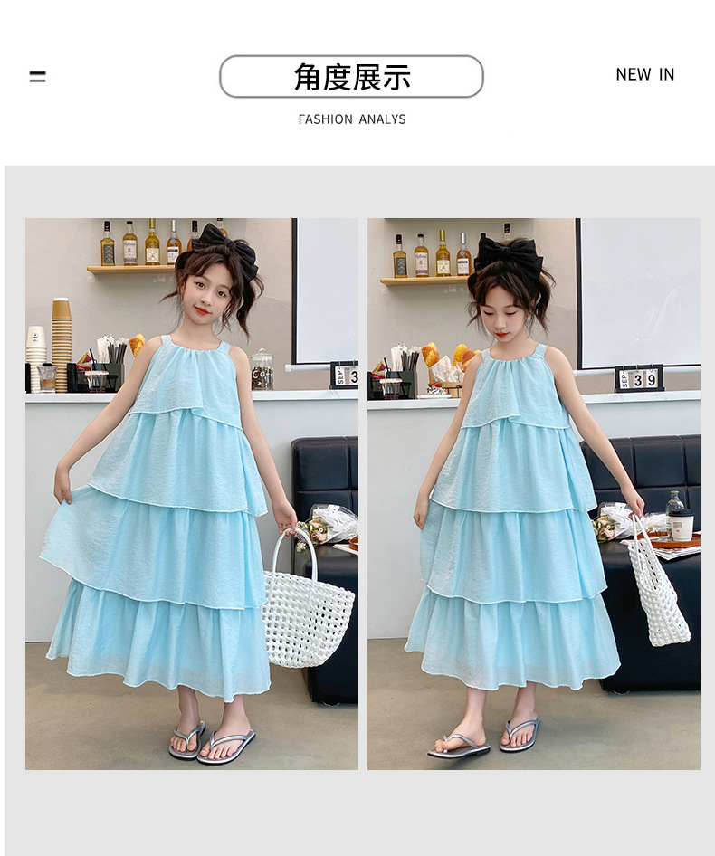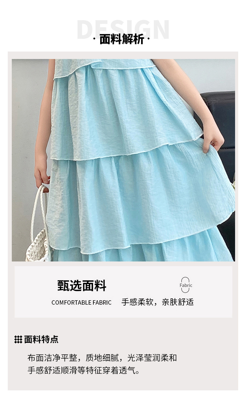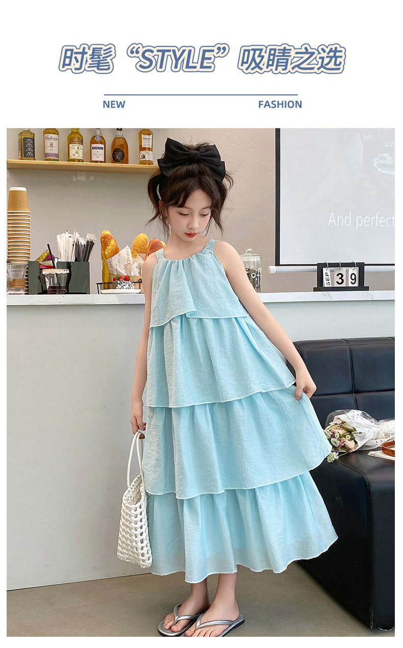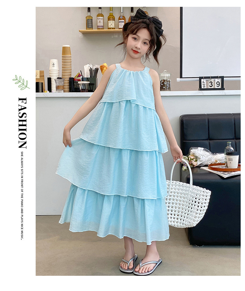 여름 소녀 원피스 2024 새로운 스타일 미드 빅 어린이 휴가 민소매 스트랩 비치 스커트 인터넷 축하 케이크 스커트 트렌디스토어 가기