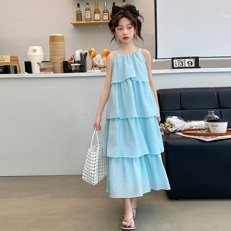 여름 소녀 원피스 2024 새로운 스타일 미드 빅 어린이 휴가 민소매 스트랩 비치 스커트 인터넷 축하 케이크 스커트 트렌디