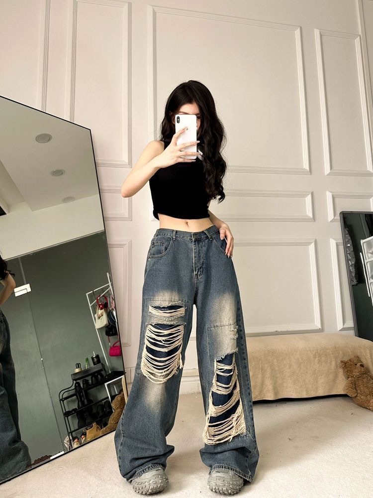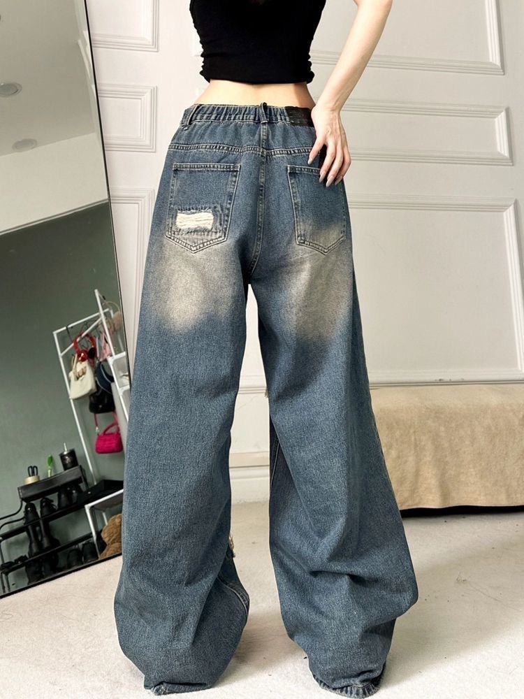 아메리칸 스타일 하이 스트리트 틈새 디자인 센스 리핑 청바지 여성 여름 하이 허리 레트로 루즈 바이브 프라이드 스트리트 와이드 레그 팬츠스토어 가기