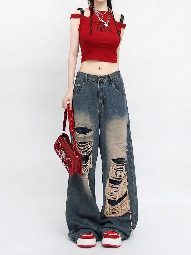 아메리칸 스타일 하이 스트리트 틈새 디자인 센스 리핑 청바지 여성 여름 하이 허리 레트로 루즈 바이브 프라이드 스트리트 와이드 레그 팬츠