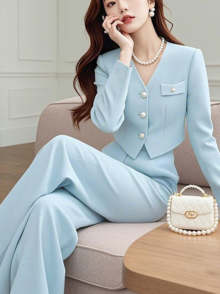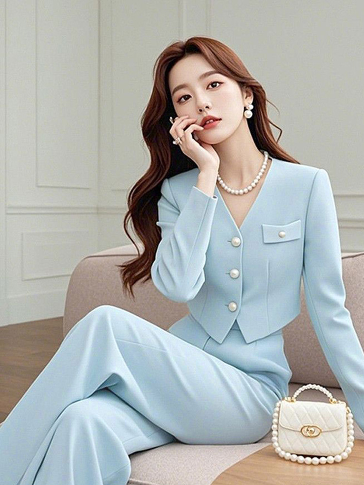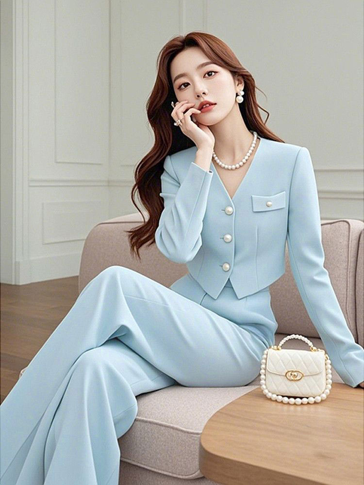 가을 새로운 여성 세트 라이트 럭셔리 하이 엔드 여성 틈새 블루 짧은 재킷 와이드 레그 바지 투피스 세트스토어 가기