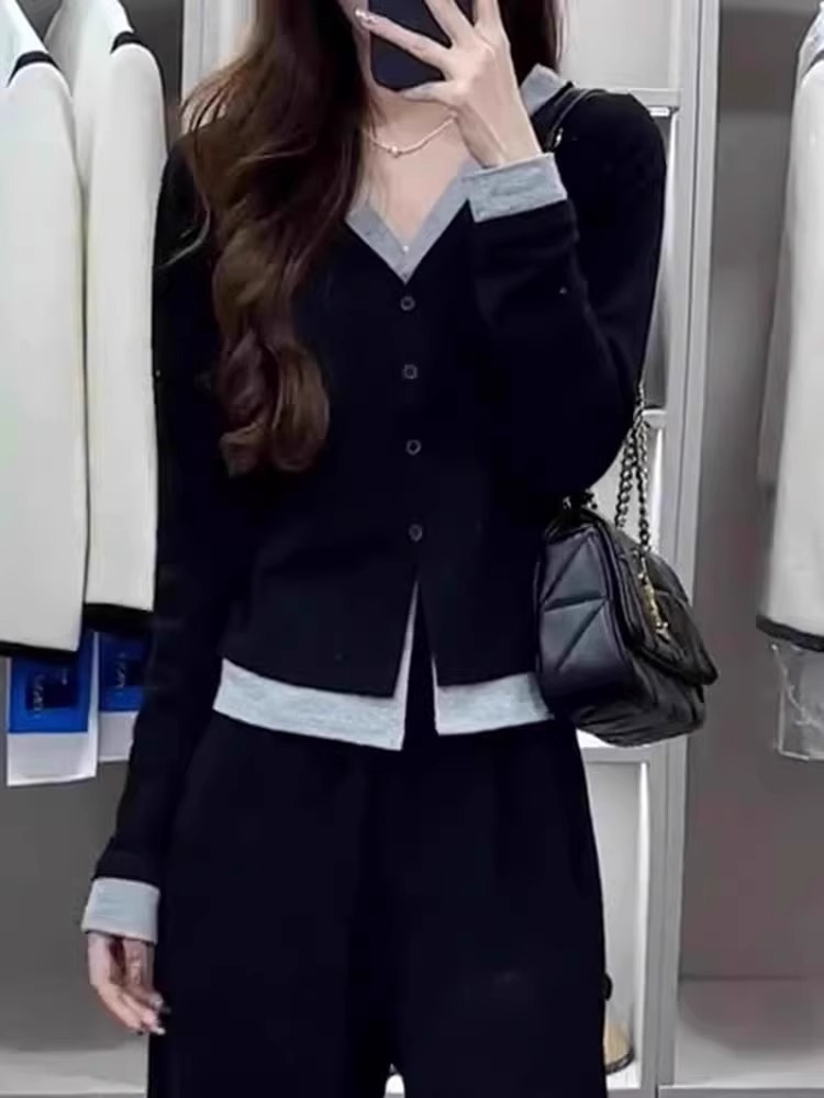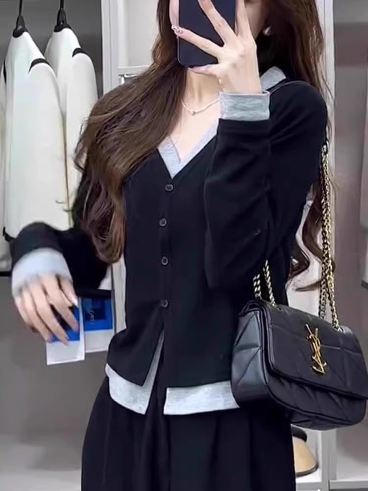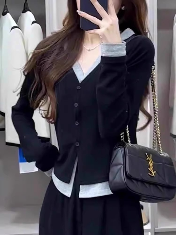 가짜 투피스 바느질 긴팔 스웨터 여성의 봄과 가을 새로운 2024 작은 슬림 핏 슬리밍 숄더베이스 탑스토어 가기