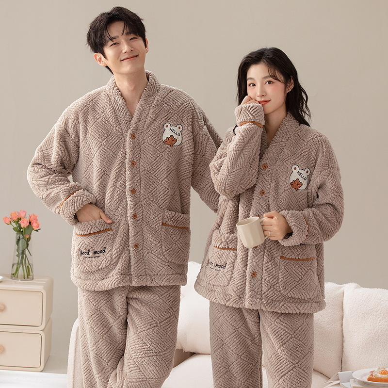 커플 잠옷 겨울 산호 양털 기모 따뜻한 긴 소매 카디건 V-Neck 한국 캐주얼 홈 의류 세트