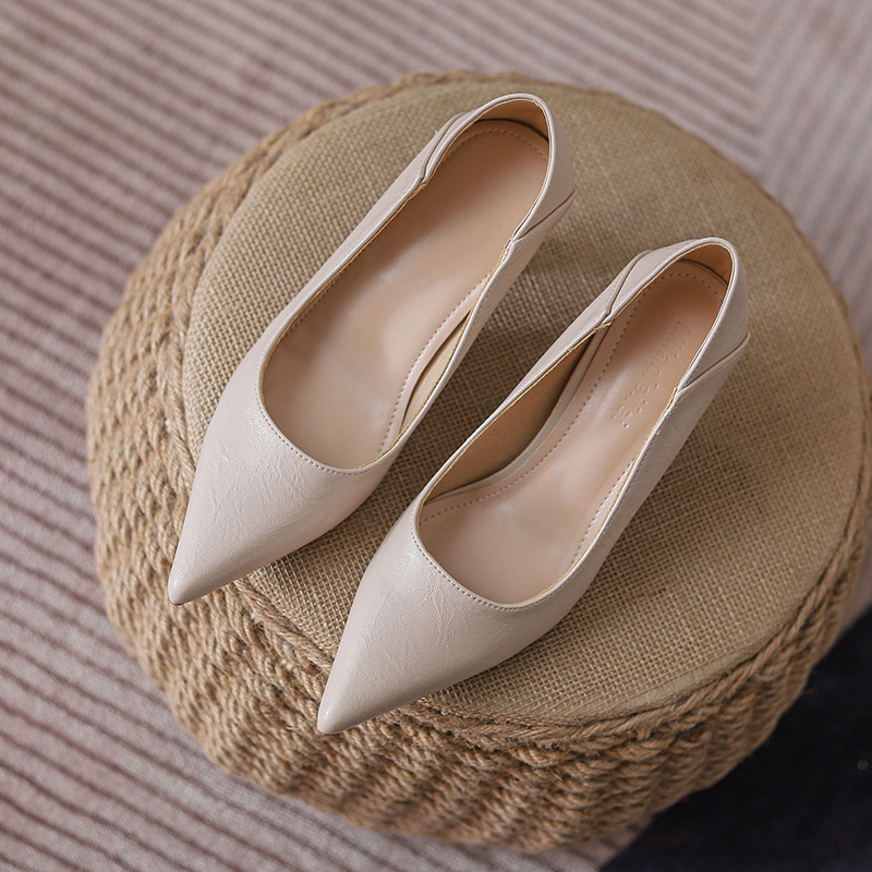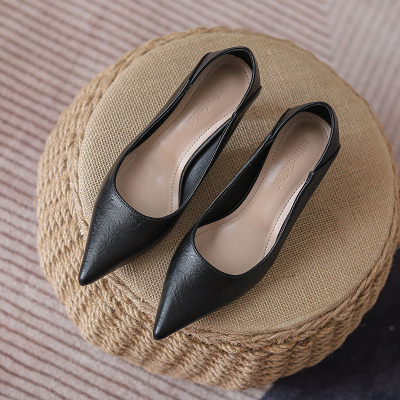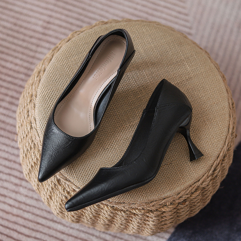 프랑스 스타일 작은 하이힐 여성 신발 2023 새로운 봄과 여름 전문 원피스 블랙 싱글 신발 작업 부드러운 가죽 신발 중간 굽스토어 가기