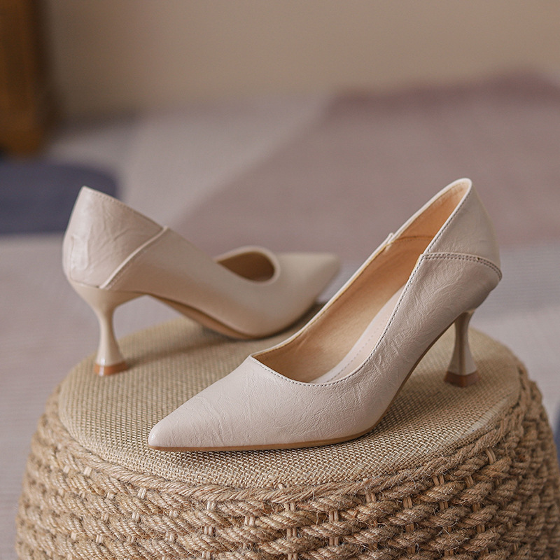 프랑스 스타일 작은 하이힐 여성 신발 2023 새로운 봄과 여름 전문 원피스 블랙 싱글 신발 작업 부드러운 가죽 신발 중간 굽