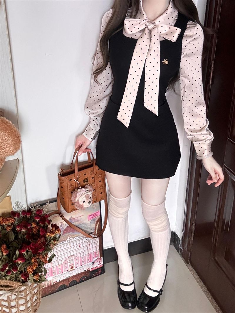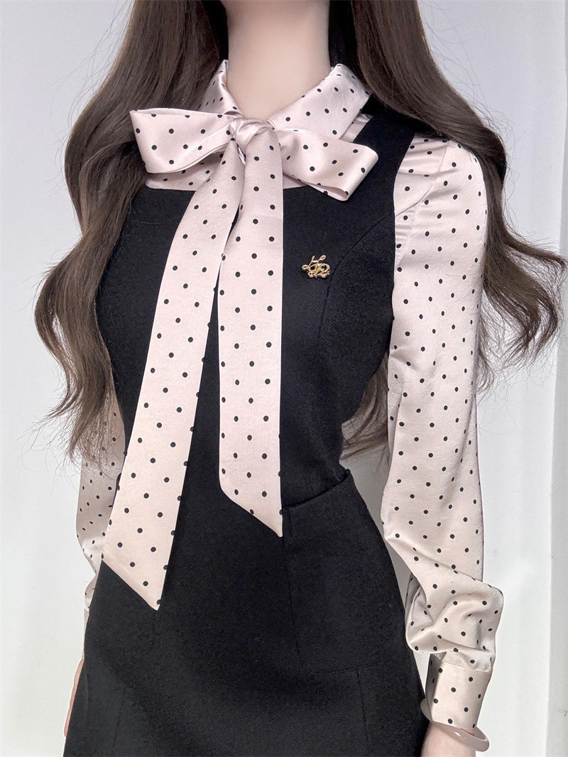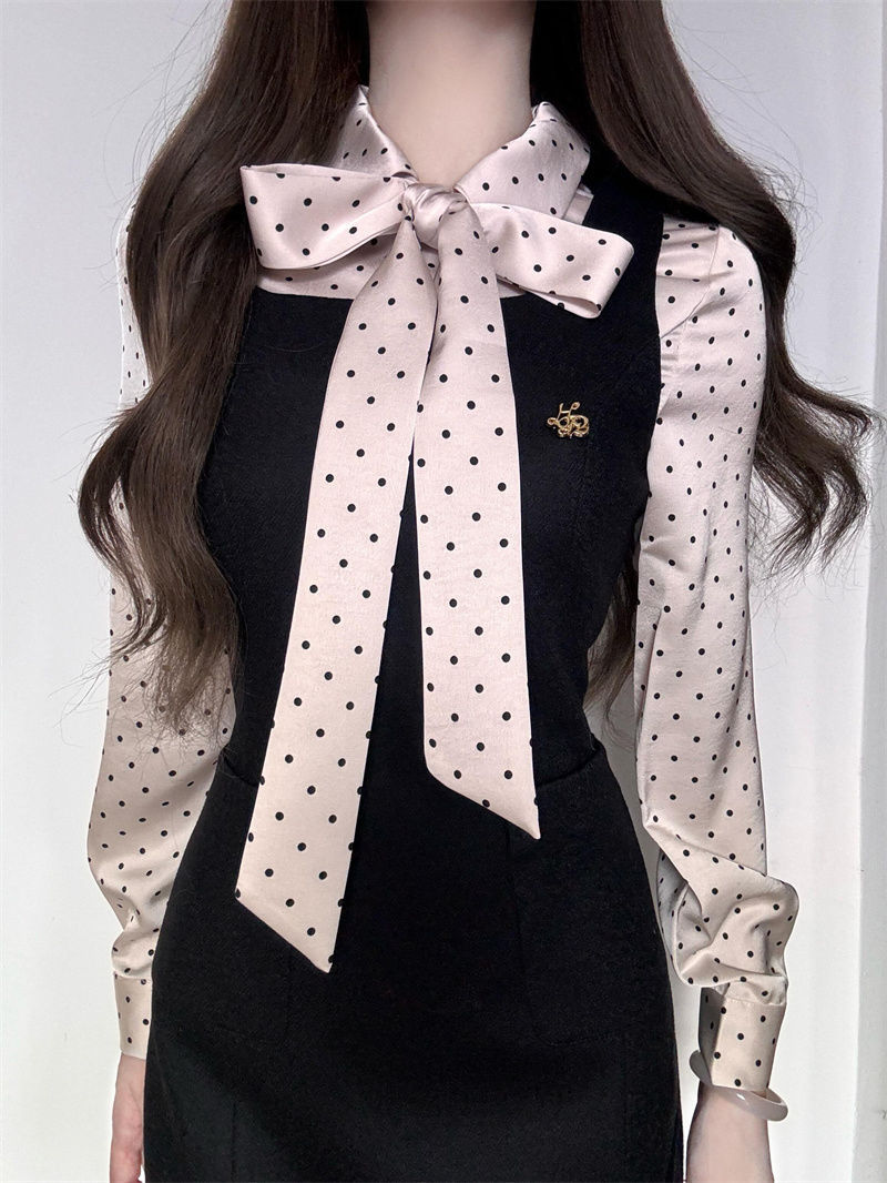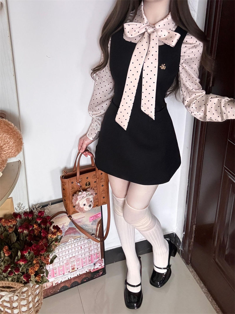 한국식 순수한 욕망 허리 자수 엉덩이 가방 스트랩 원피스 여성용 쌓인 보우 폴로 더트 셔츠 투피스 세트