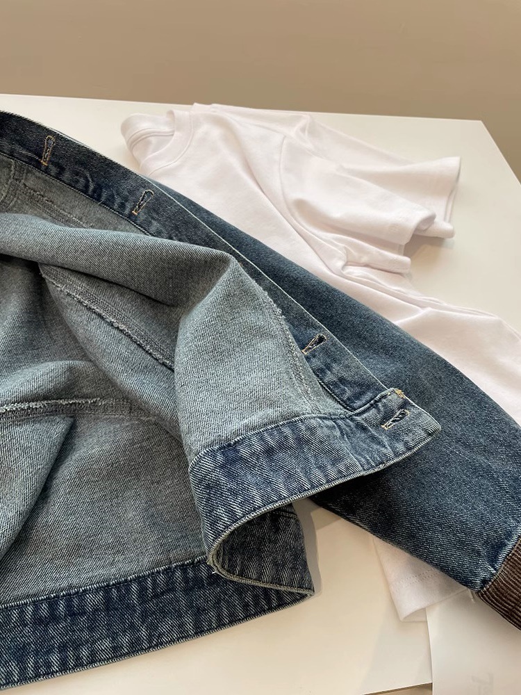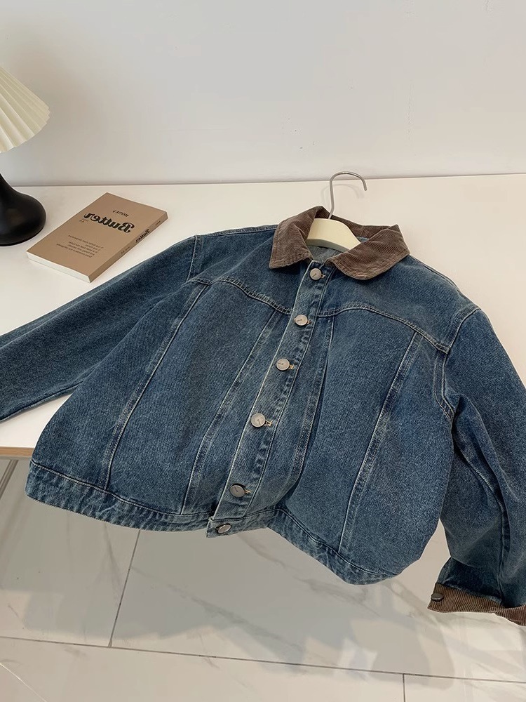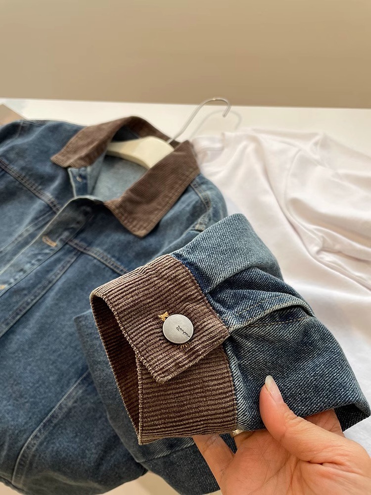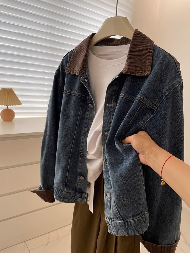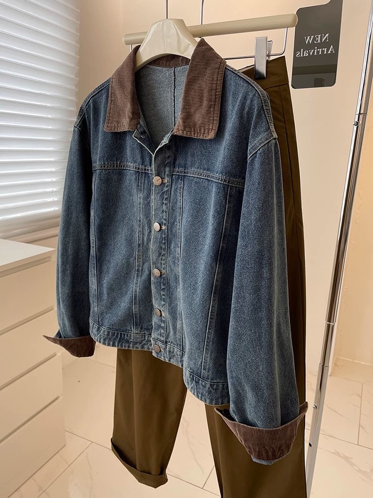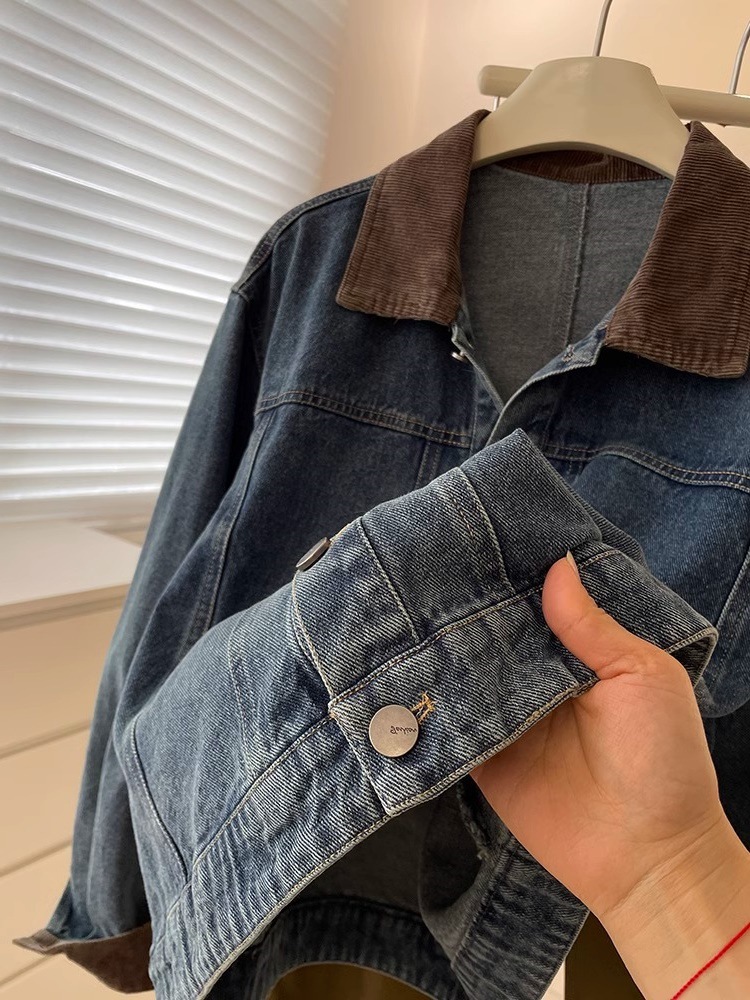레트로 코듀로이 스티칭 옷깃 데님 짧은 코트 여성! 봄과 가을 새로운 슬림보기 작은 캐주얼 자켓 탑
