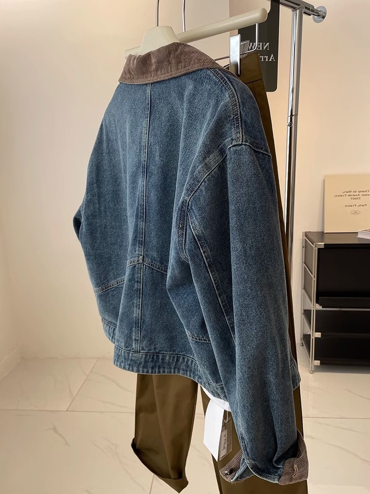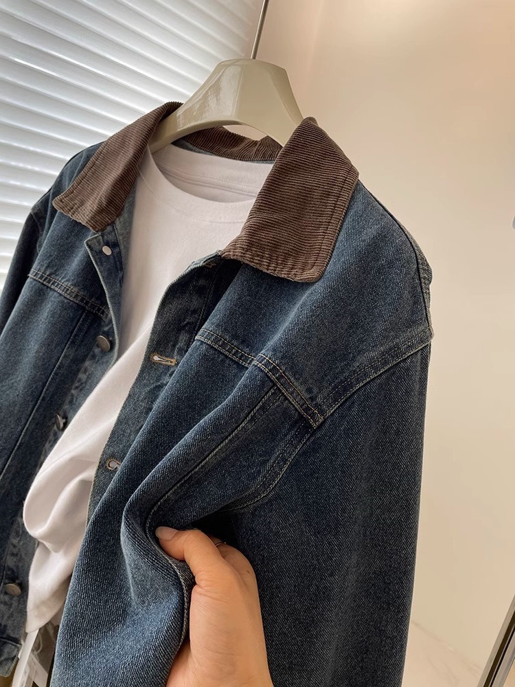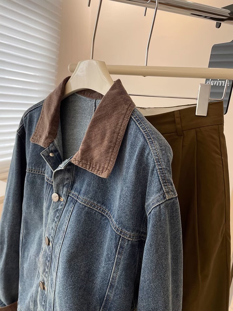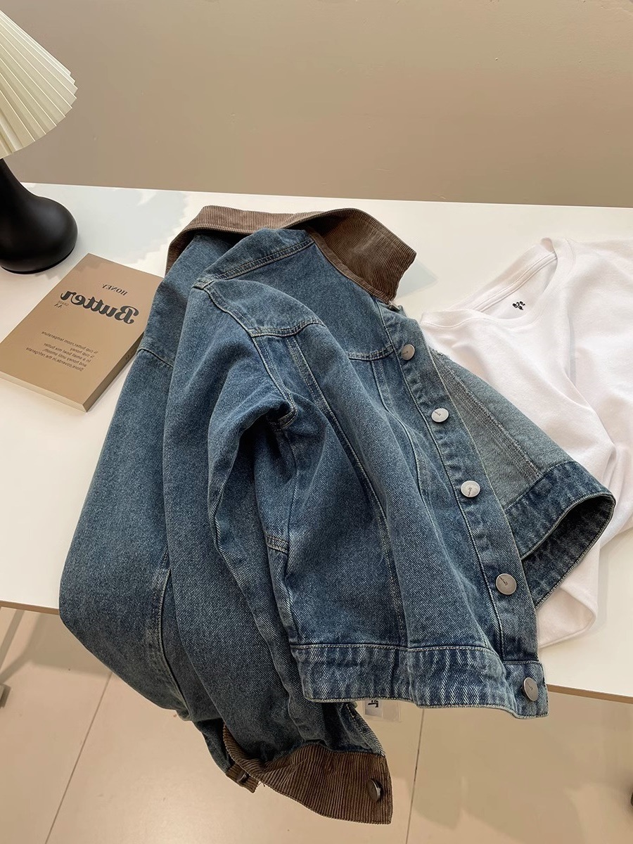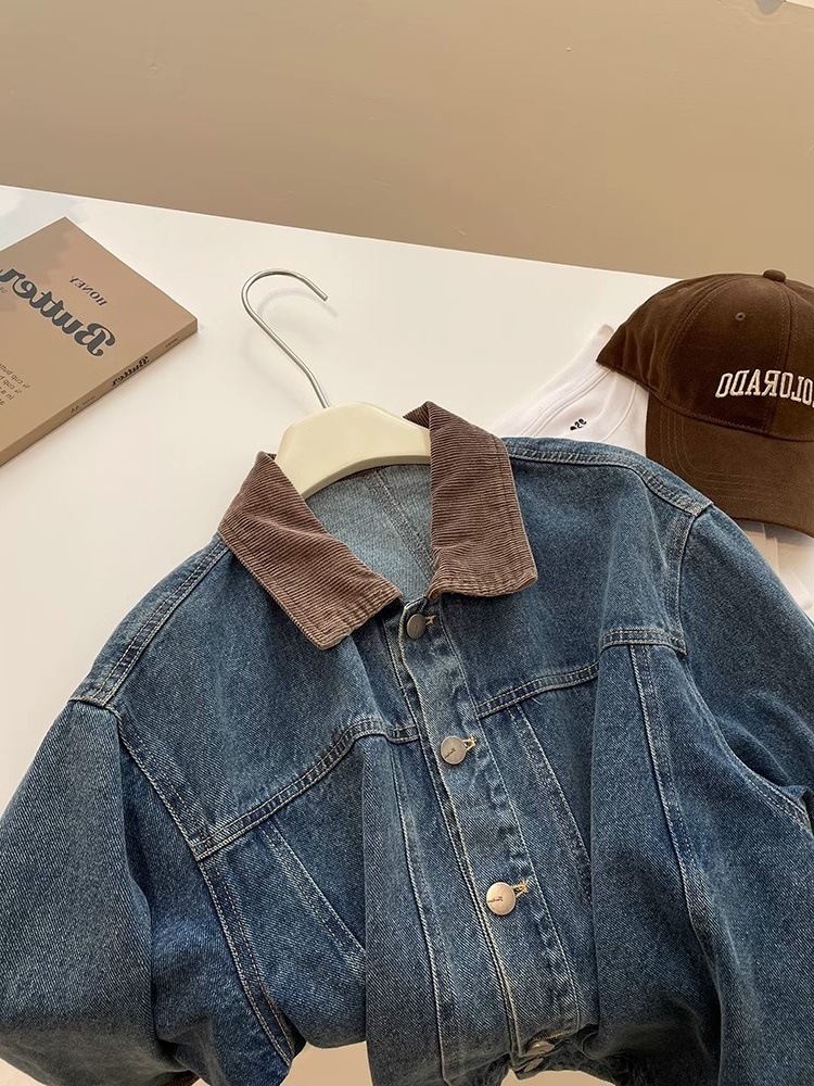 레트로 코듀로이 스티칭 옷깃 데님 짧은 코트 여성! 봄과 가을 새로운 슬림보기 작은 캐주얼 자켓 탑스토어 가기