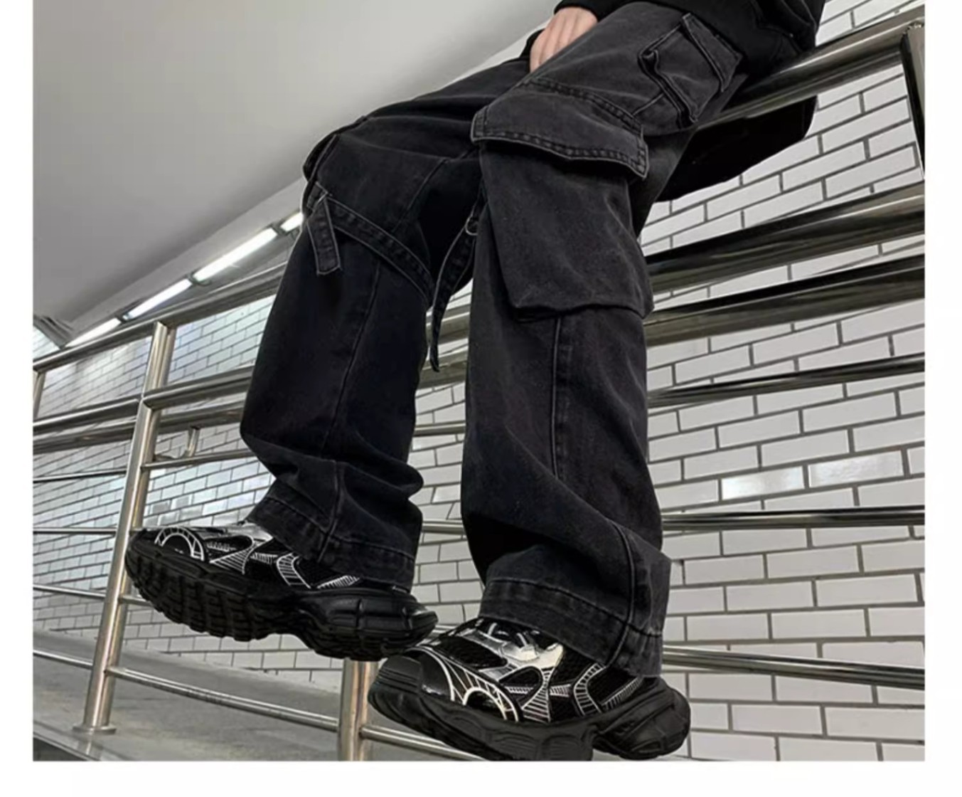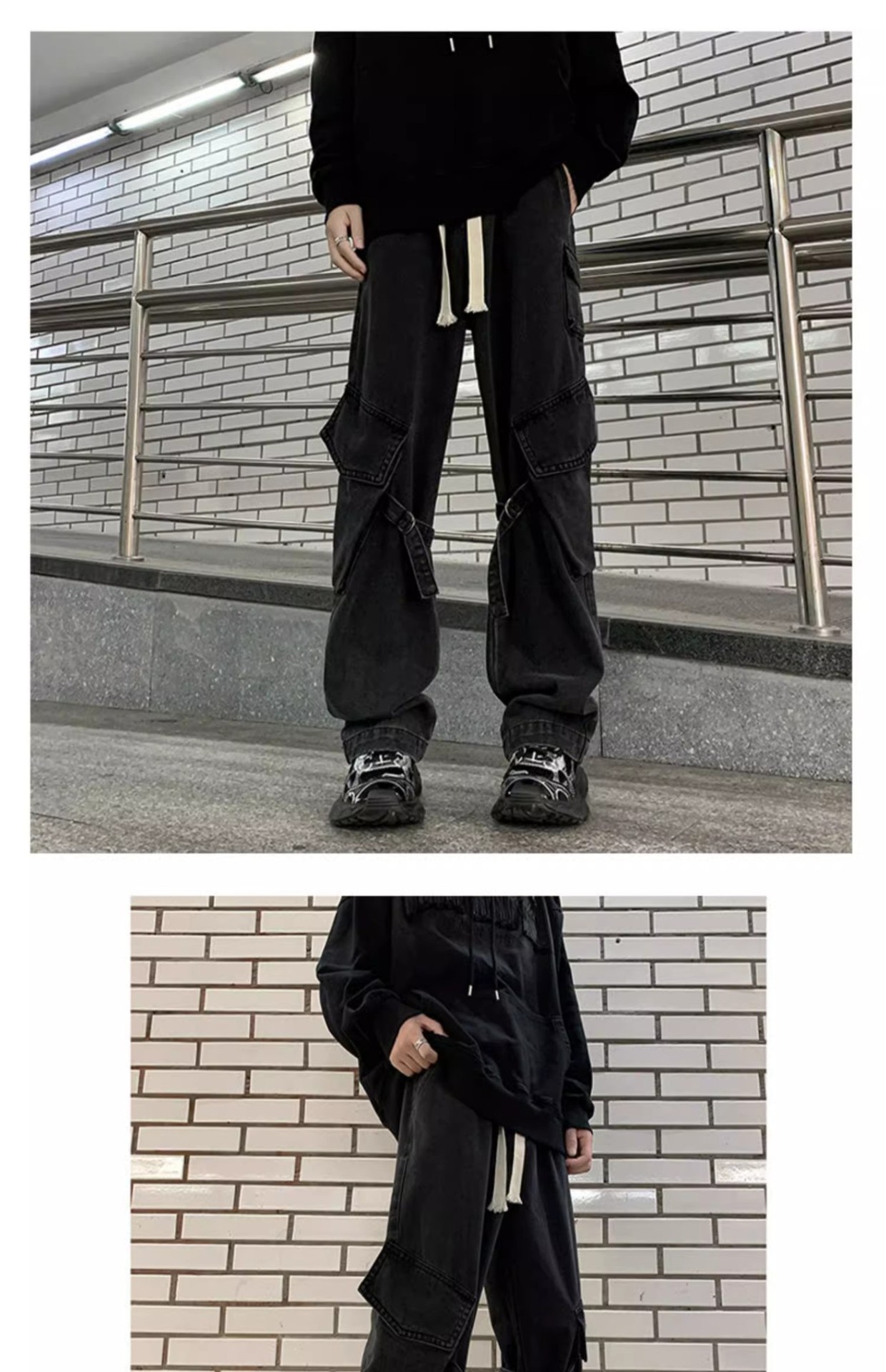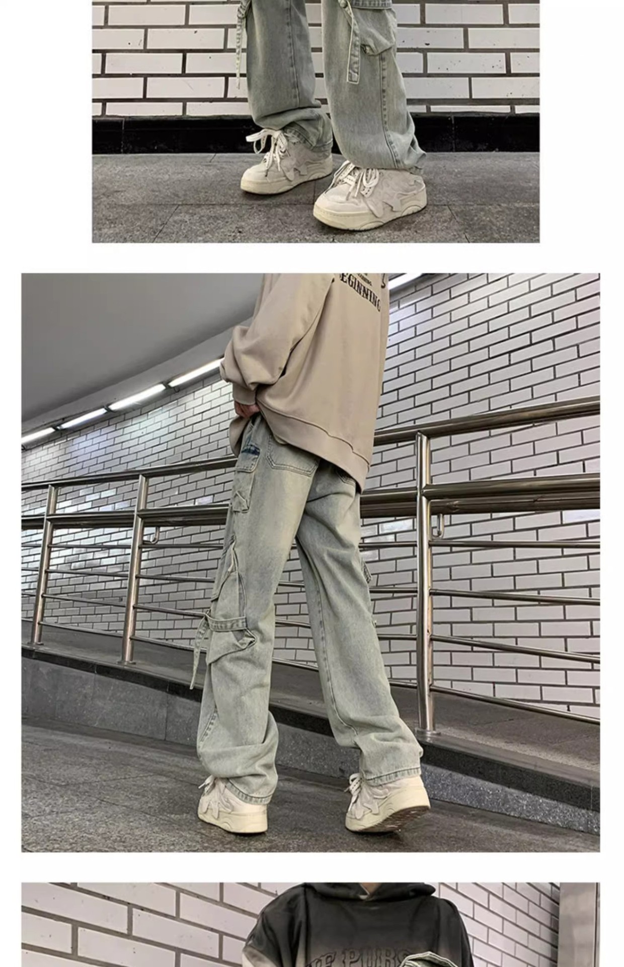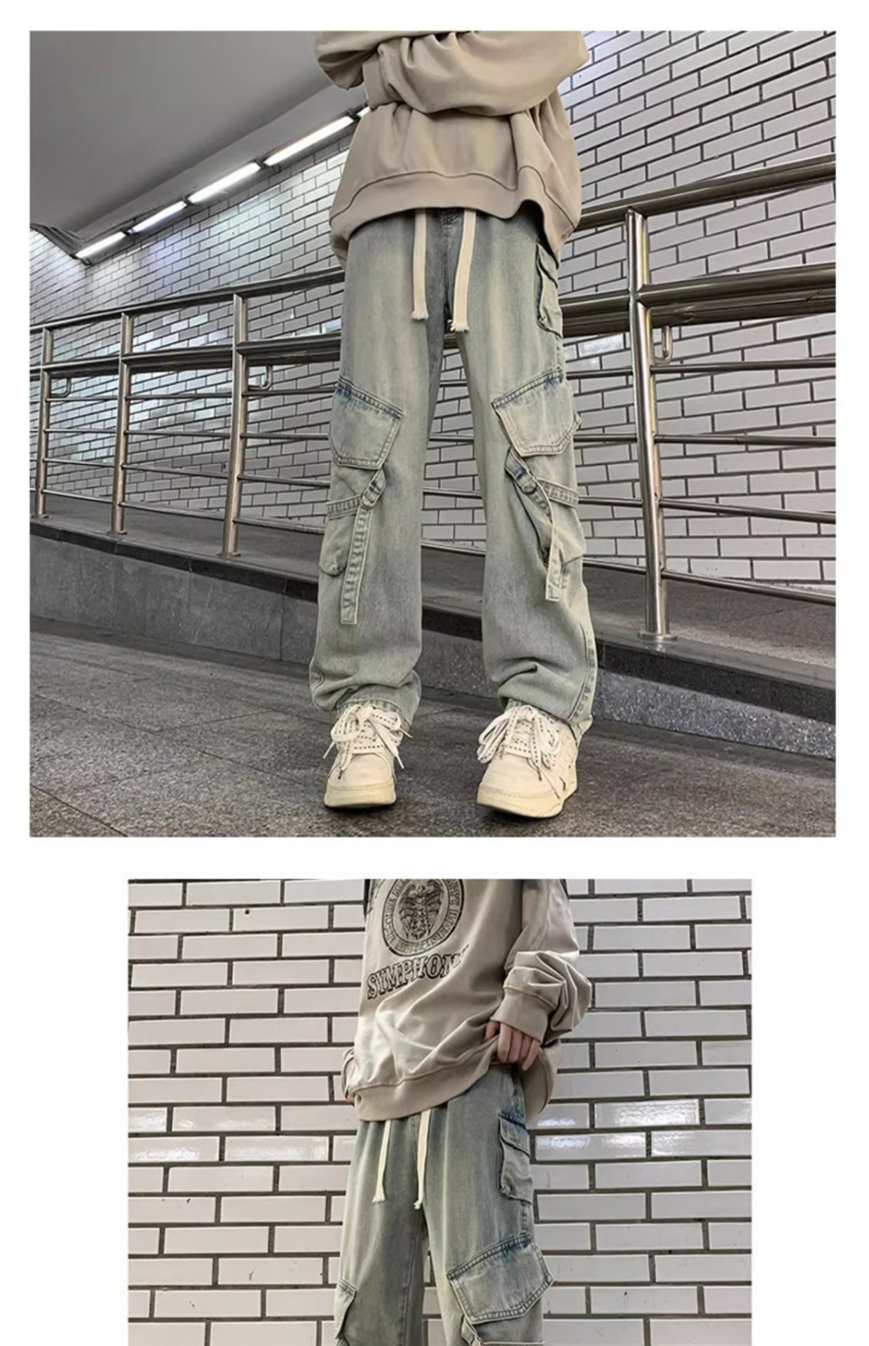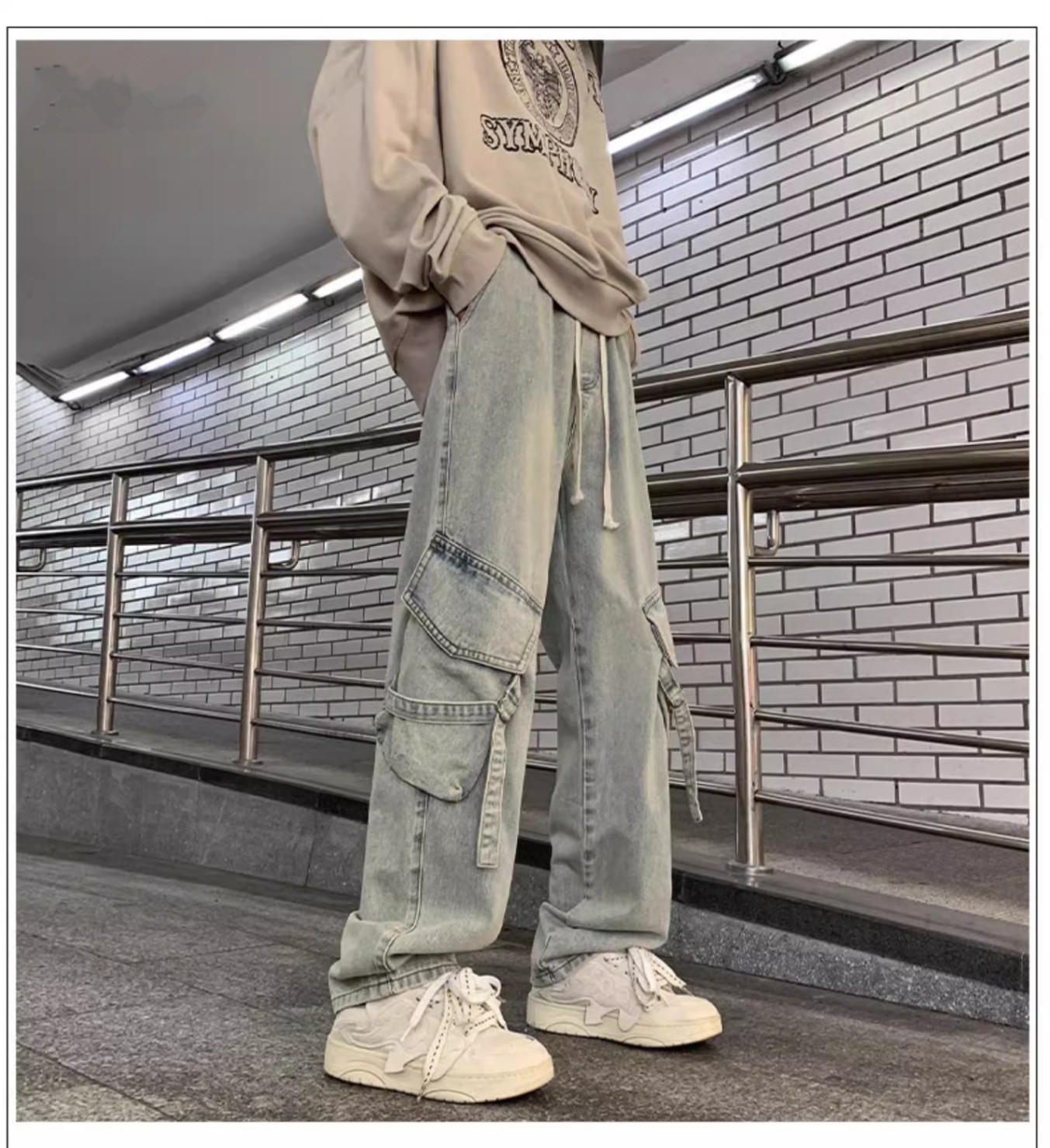 미국식 하이 스트리트 멀티 포켓 툴링 청바지 남자 봄과 가을 새로운 느슨한 넓은 다리 긴 바지 소년 용스토어 가기