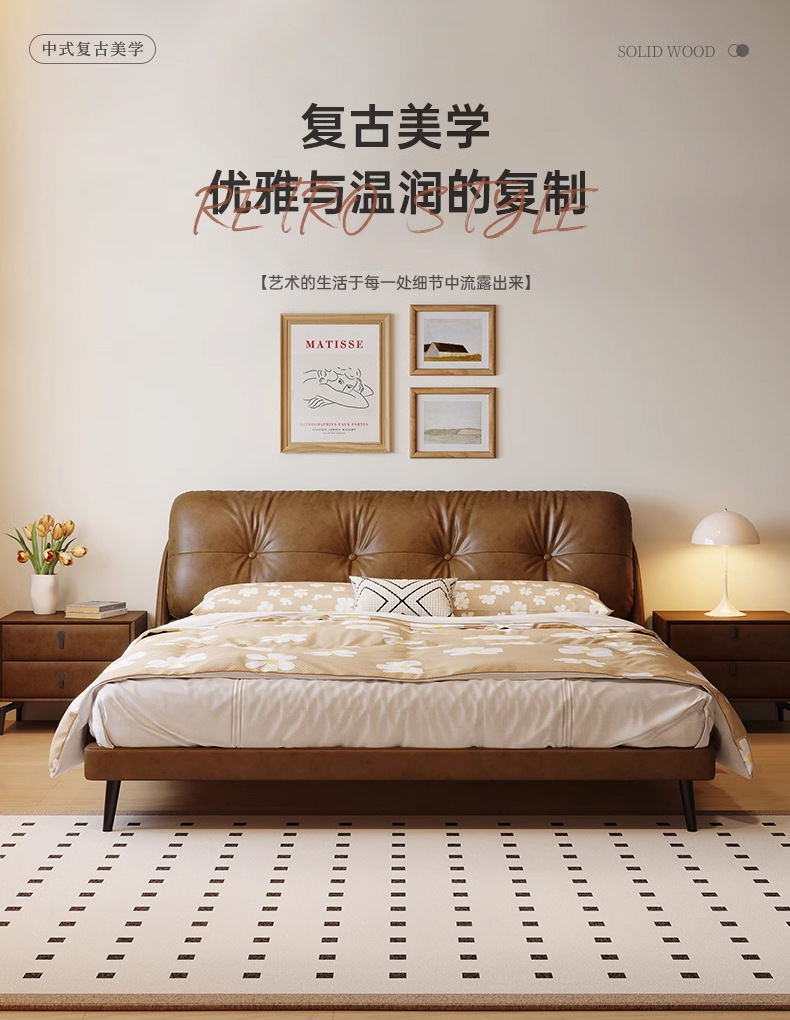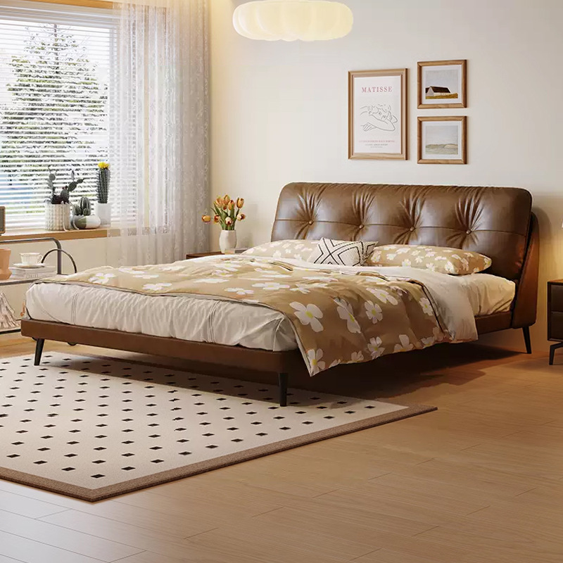 프렌치 레트로 스타일 다운 소프트 백 헤드 레이어 Cowhide 침대 간단한 마스터 침실 다크 브라운 가죽 침대 크고 작은 아파트 더블 웨딩 침대