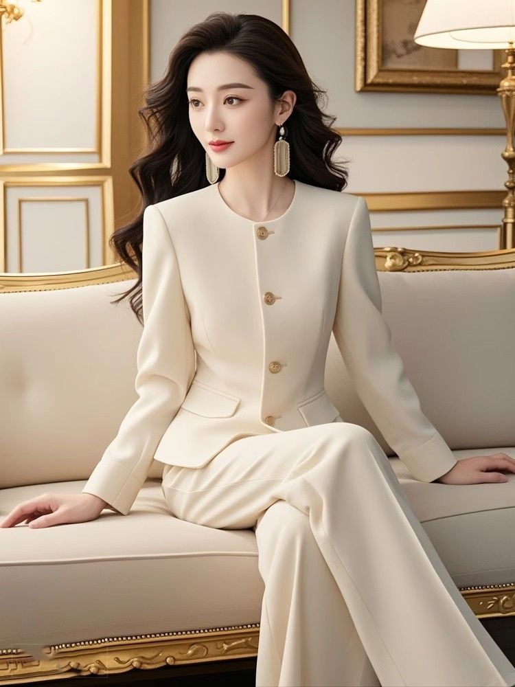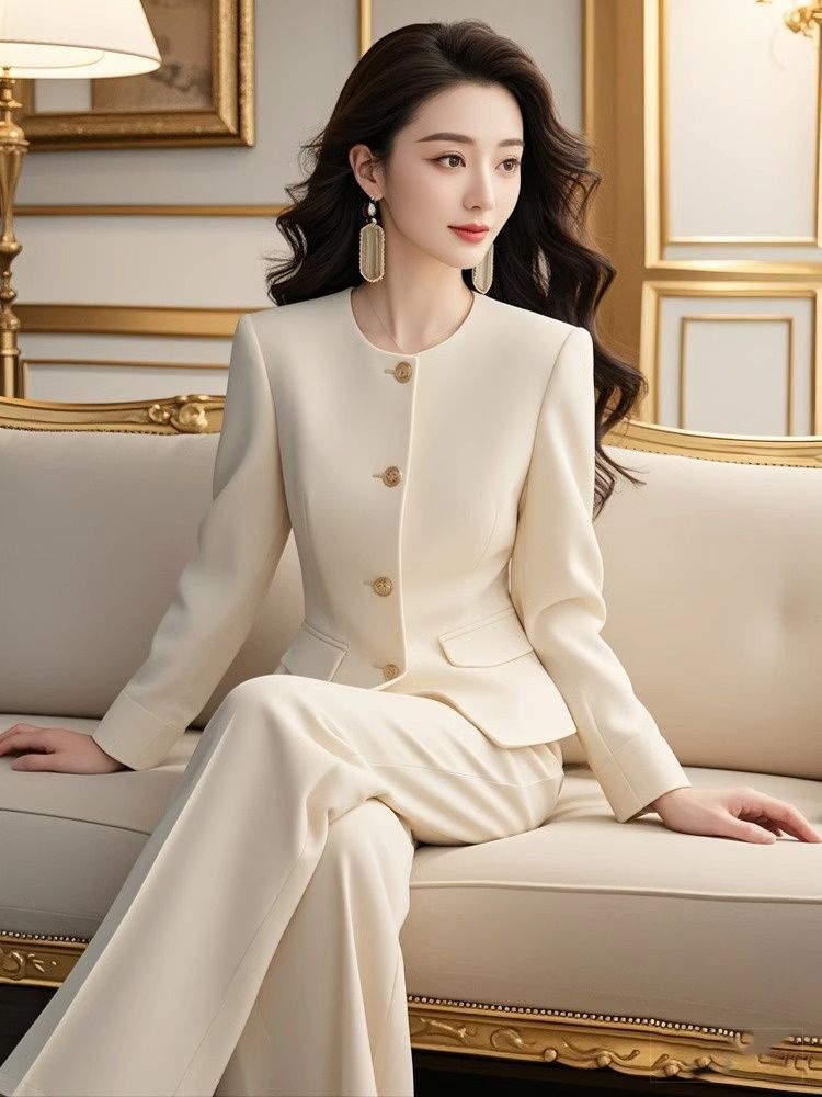가을은 관대하고 괜찮은 패션 세트를 입는다. 외국 스타일의 나이 감소 기질 하이 엔드 감각 작은 스타일의 흰색 세트 바지스토어 가기