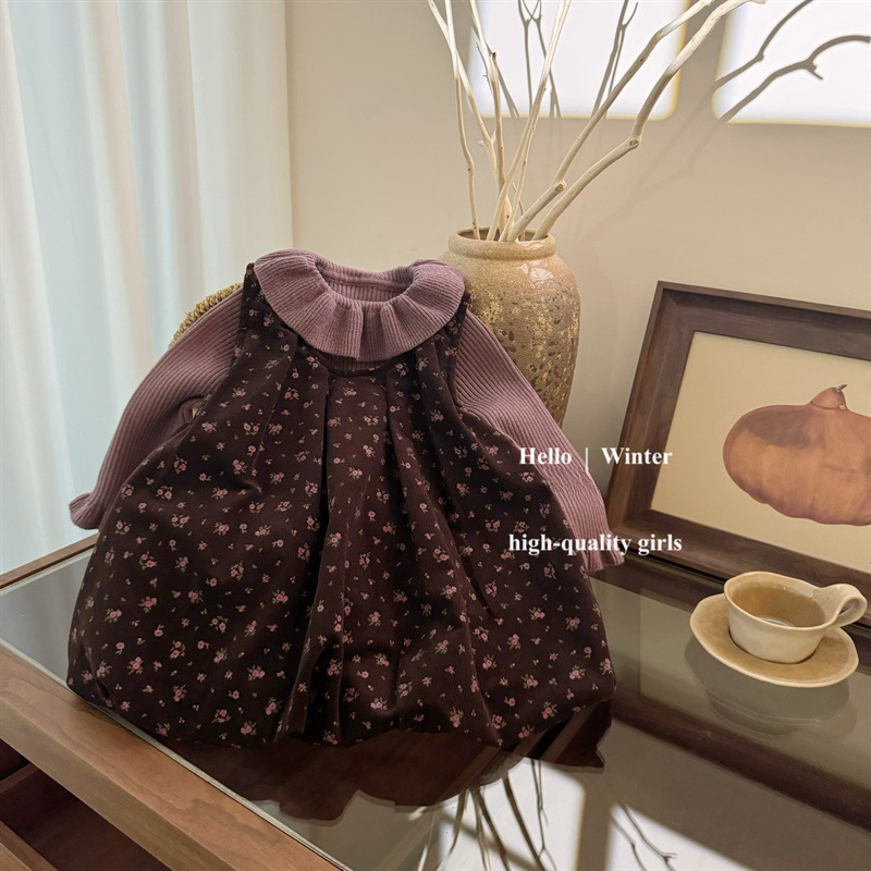[가을과 겨울의 새로운] 슈퍼 아름다운! 어린이 한국 아동복 소녀 코듀로이 꽃 스커트 스웨터 스타일라인 세트