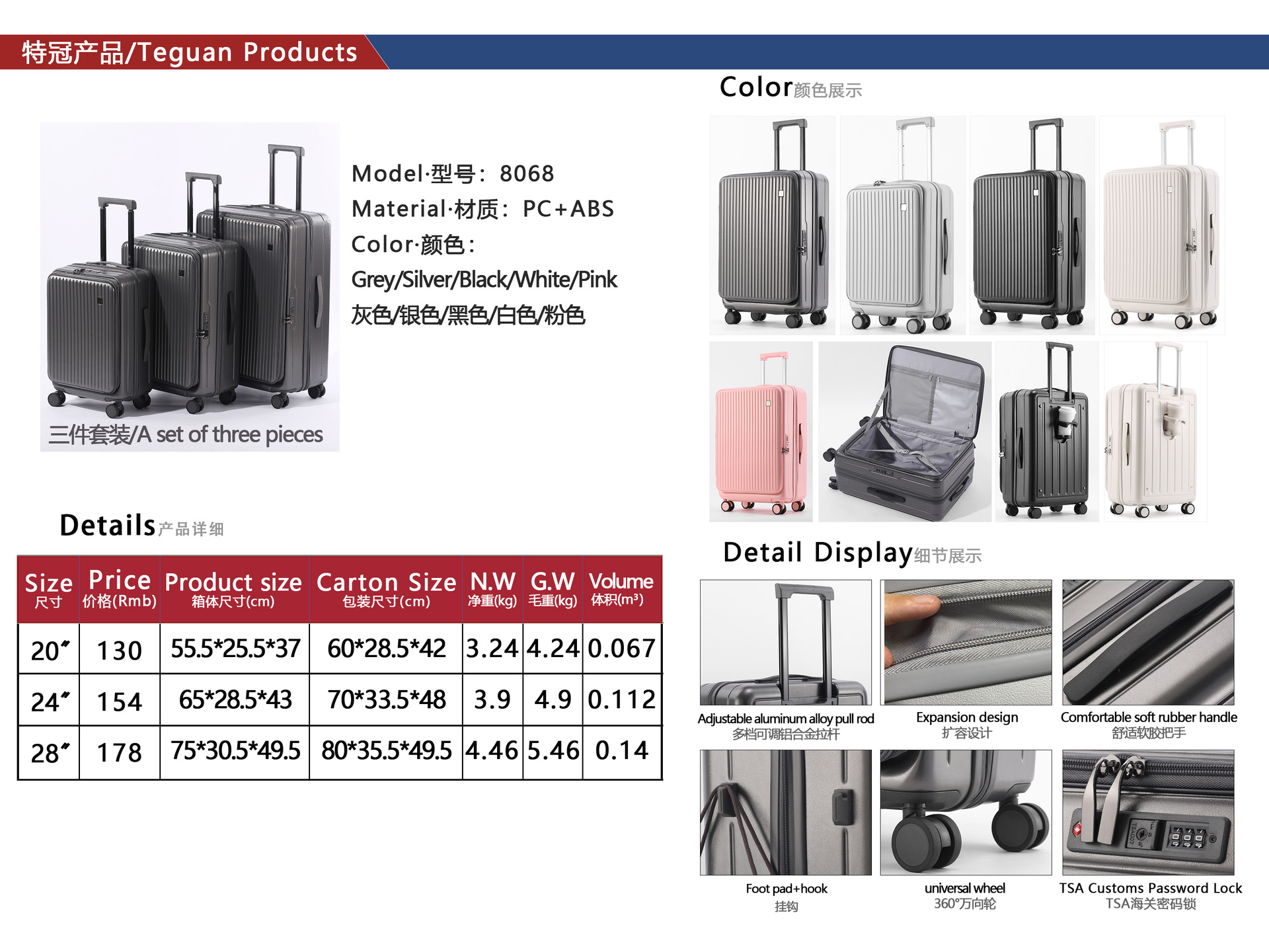 3 piece luggage set 20 inch,24 inch,28 inch upright, can be stored one into another.100% ABS, Lightweight yet extremely durable abs material.