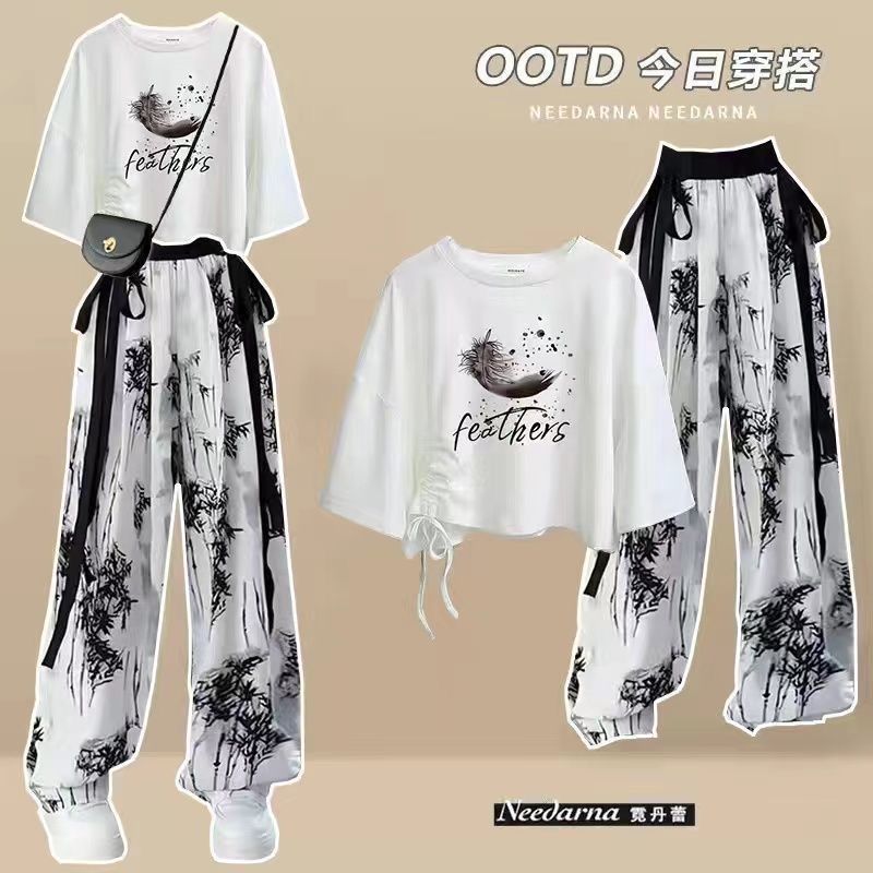 엄마와 드레스 캐주얼 여름 패션 큰 어린이 세트 느슨한 반팔 티셔츠 아이스 실크 잉크 와이드 레그 바지 투피스 세트