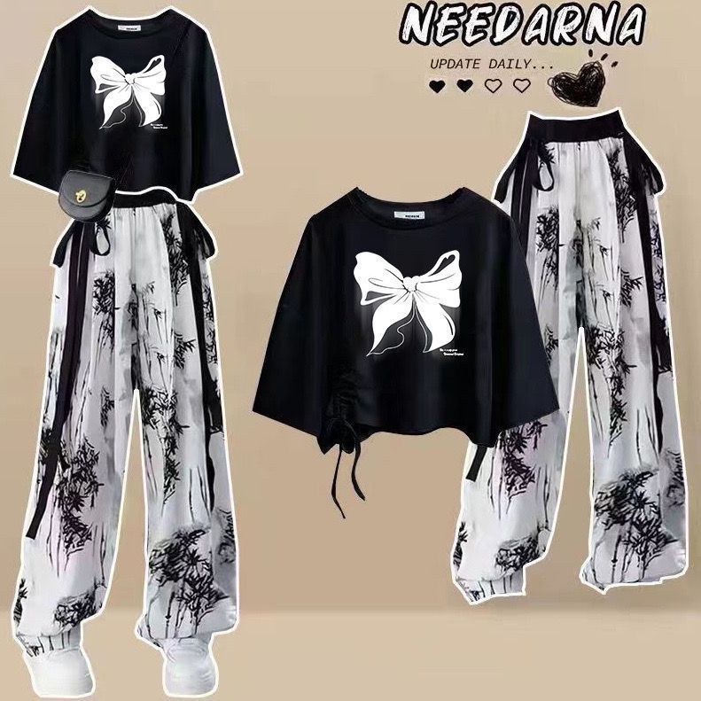 엄마와 드레스 캐주얼 여름 패션 큰 어린이 세트 느슨한 반팔 티셔츠 아이스 실크 잉크 와이드 레그 바지 투피스 세트스토어 가기