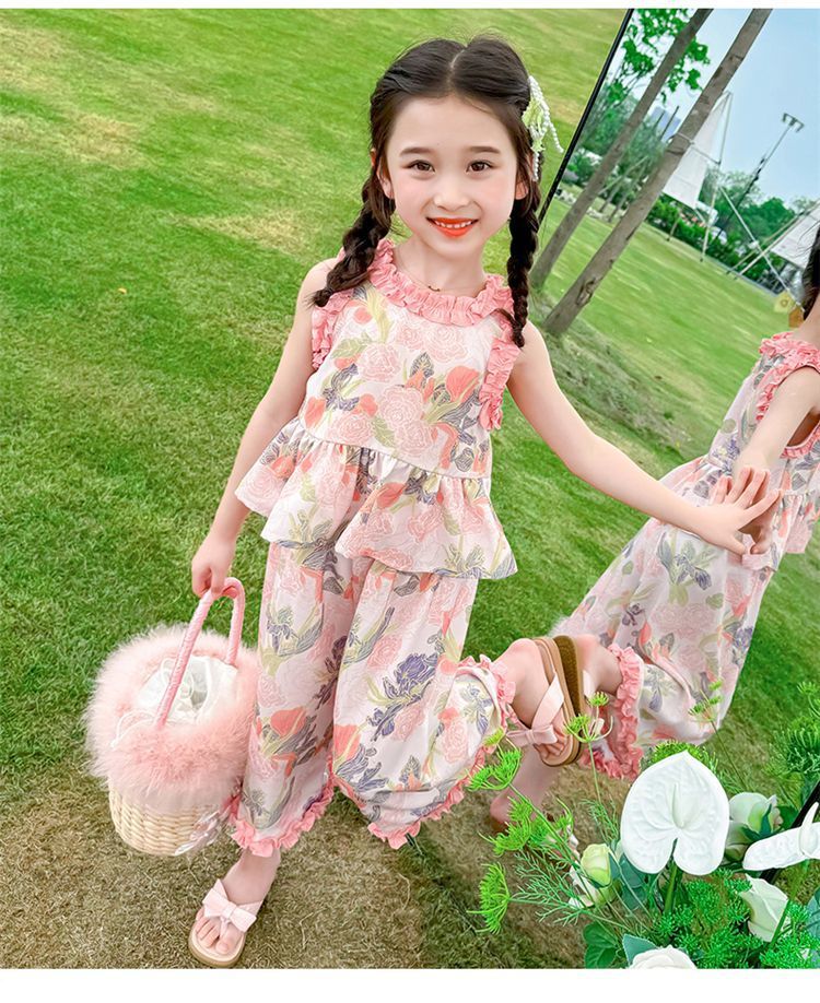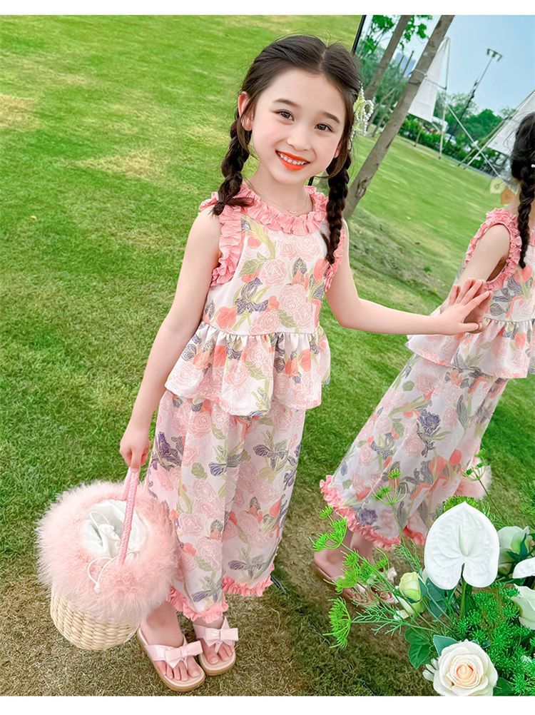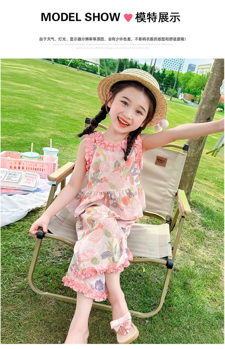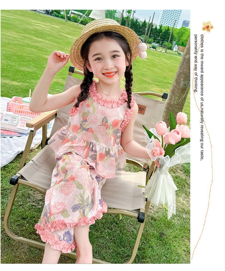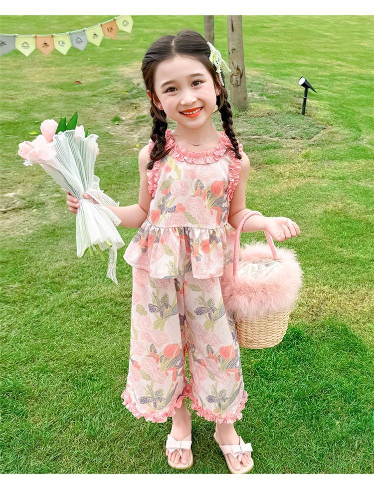 꽃 소녀의 여름 조끼 세트 2025 새로운 아기 한국 스타일 서양식 어린이 그물 로즈우드 귀 투피스 세트스토어 가기