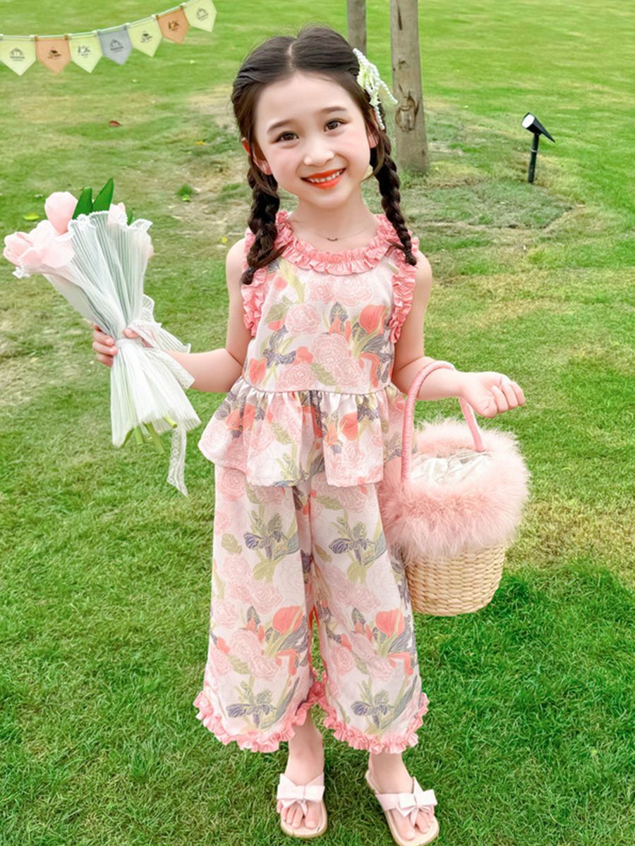 꽃 소녀의 여름 조끼 세트 2025 새로운 아기 한국 스타일 서양식 어린이 그물 로즈우드 귀 투피스 세트