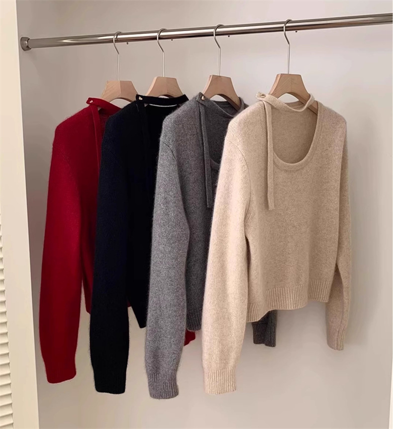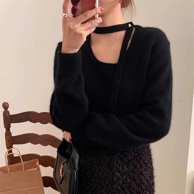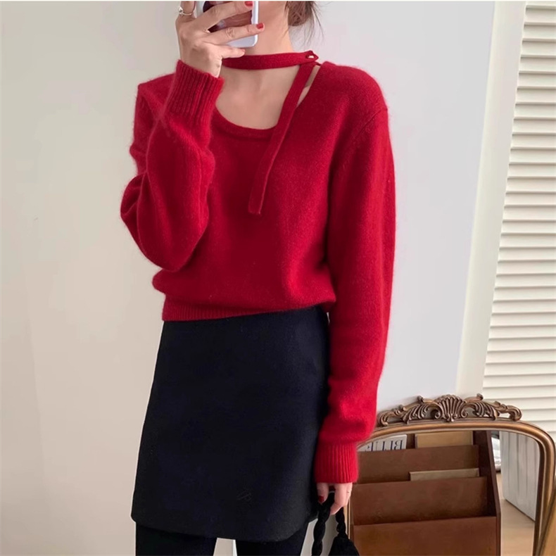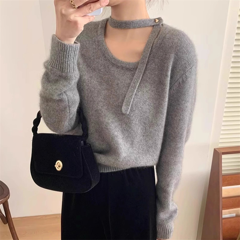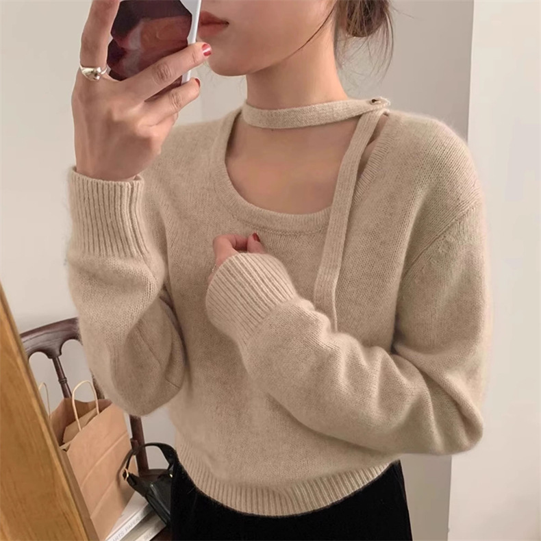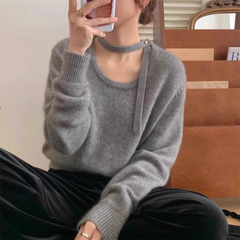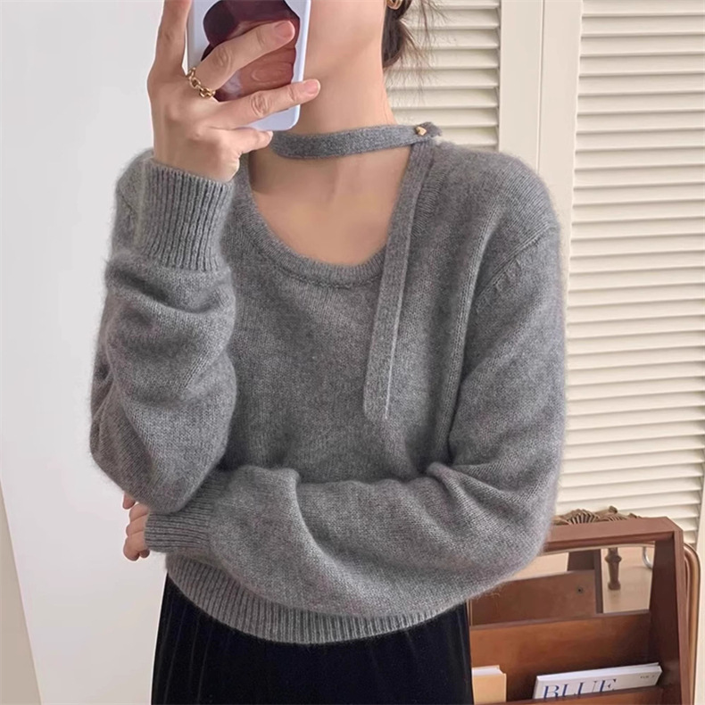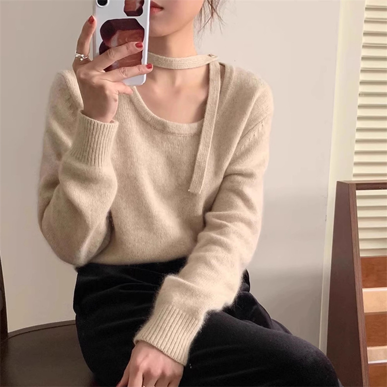 가을과 겨울 여성용 솔리드 컬러 디자인 홀터넥 리본 스쿠프 넥 스웨터 몸집이 작은 여성용 부드러운 밀랍 풀오버 스웨터
