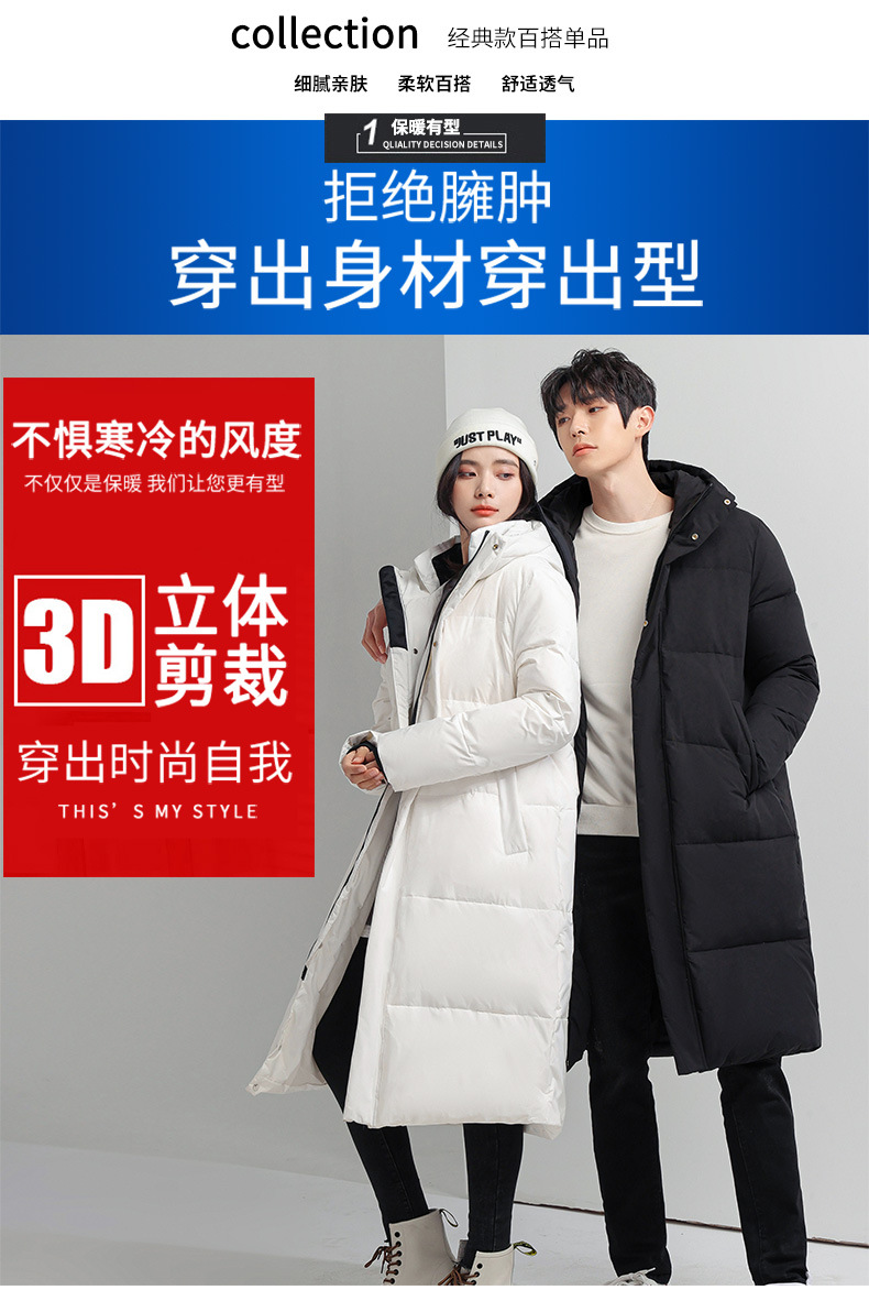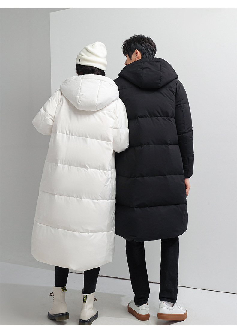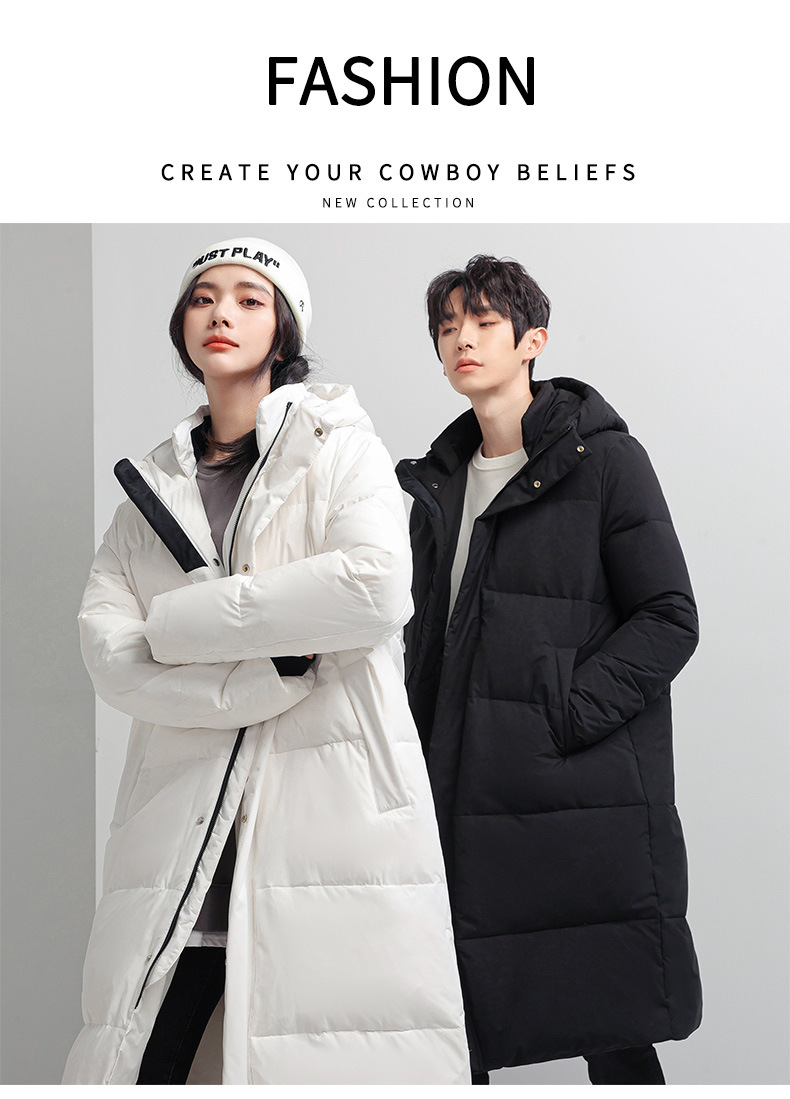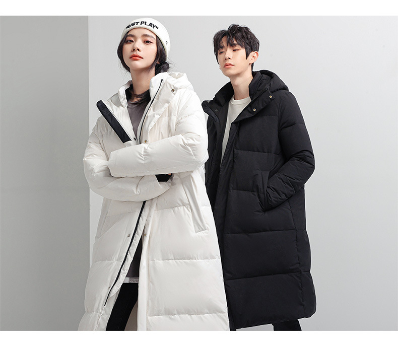 국경 간 겨울 플러스 사이즈 중간 길이 다운 재킷 남자 흰 오리 겨울 옷 느슨한 남자와 여자의 후드 따뜻한 재킷