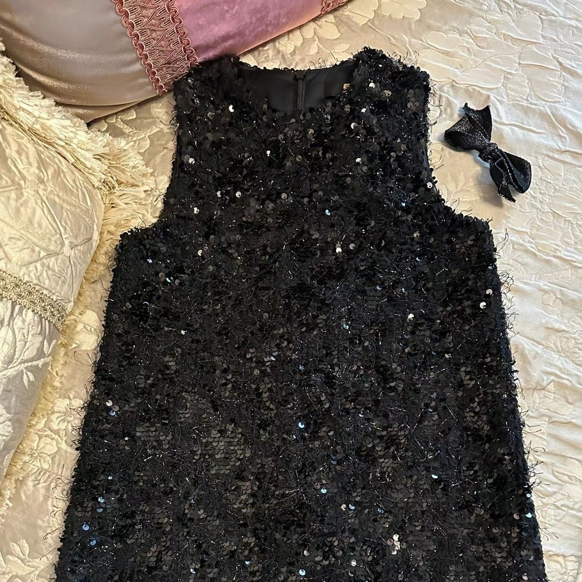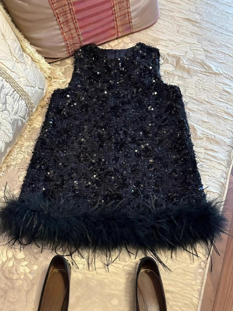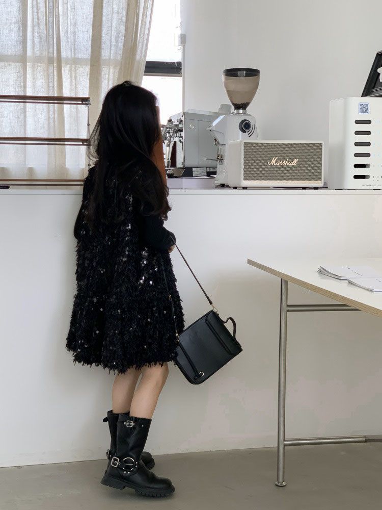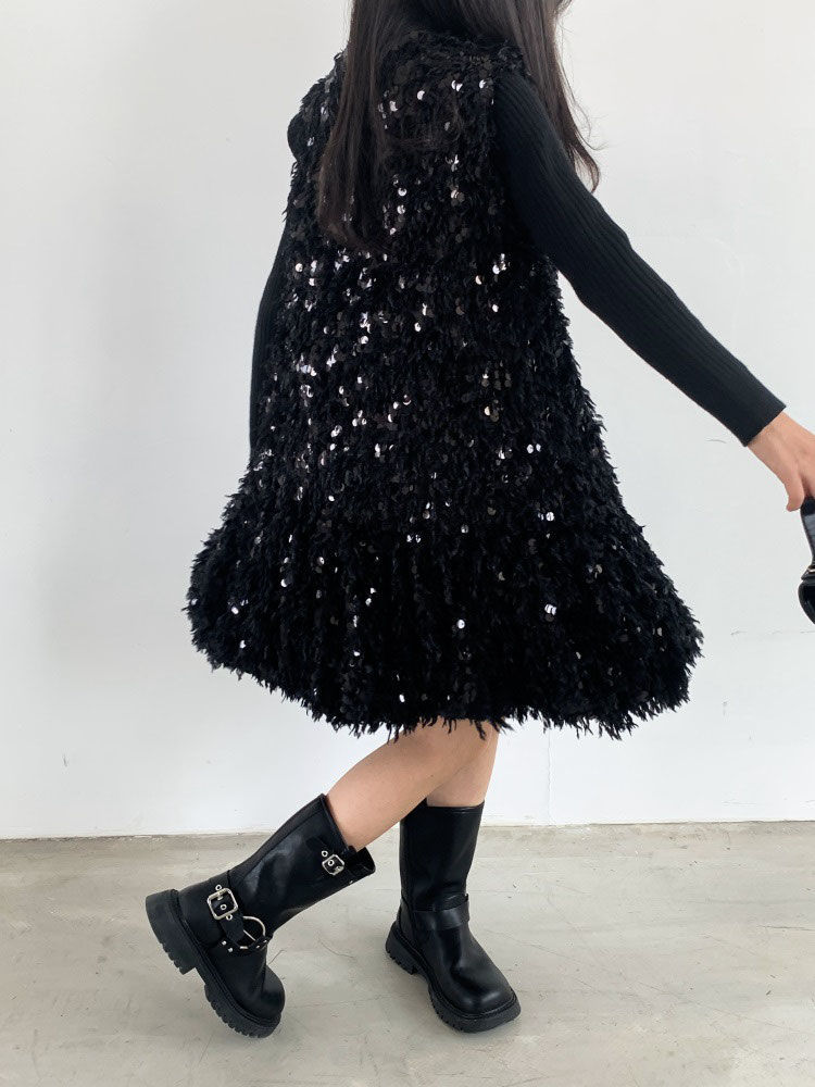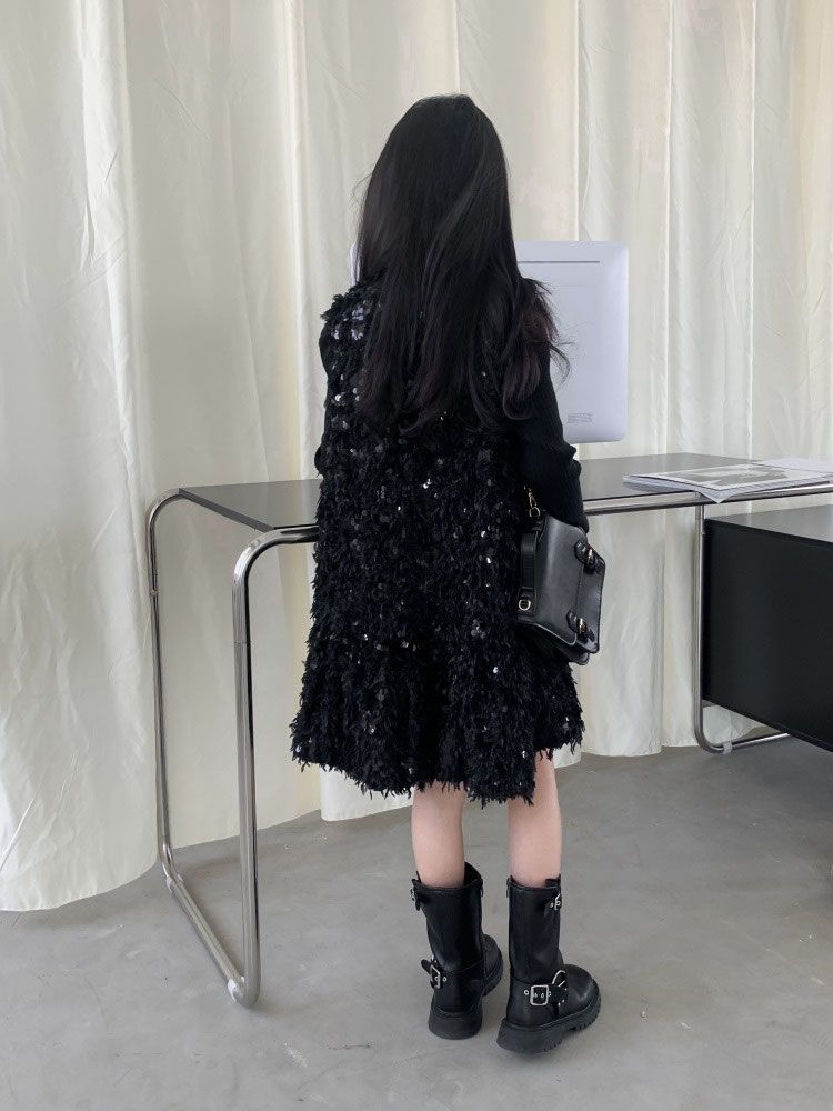 중소형 여아 가을 겨울 민소매 작은 향기 드레스, 반짝이는 작은 검은 드레스가 있는 여아 드레스, 여아 조끼 드레스, 트렌디스토어 가기