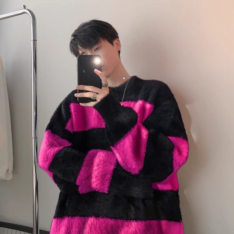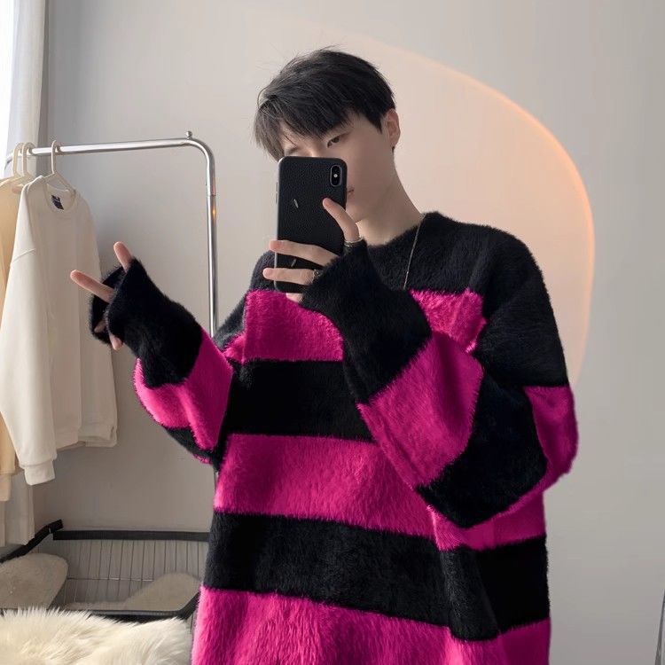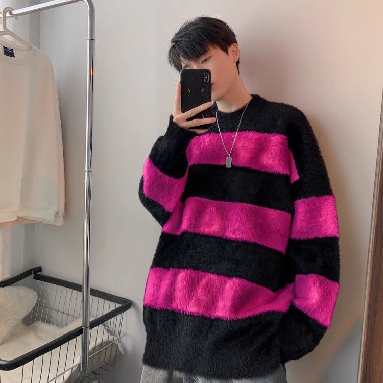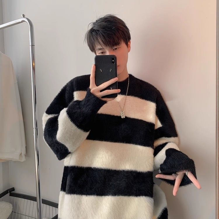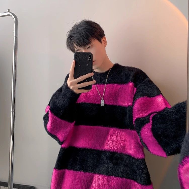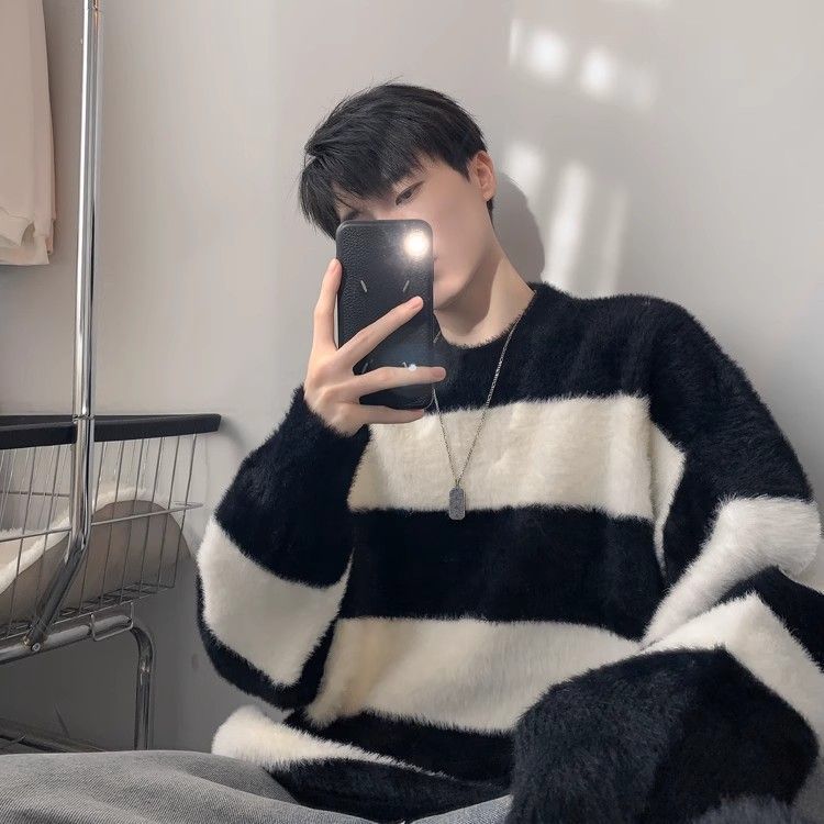 스웨터 남자 봄과 가을 미국 스타일 레트로 2024 새로운 대비 컬러 스트라이프 유행 모방 밍크 벨벳 내베이스 셔츠 재킷스토어 가기