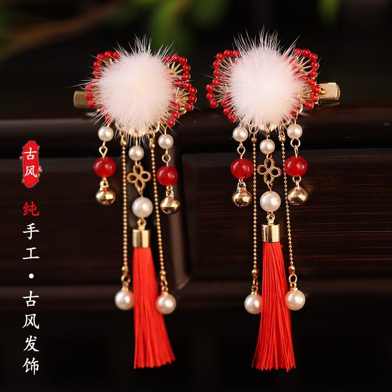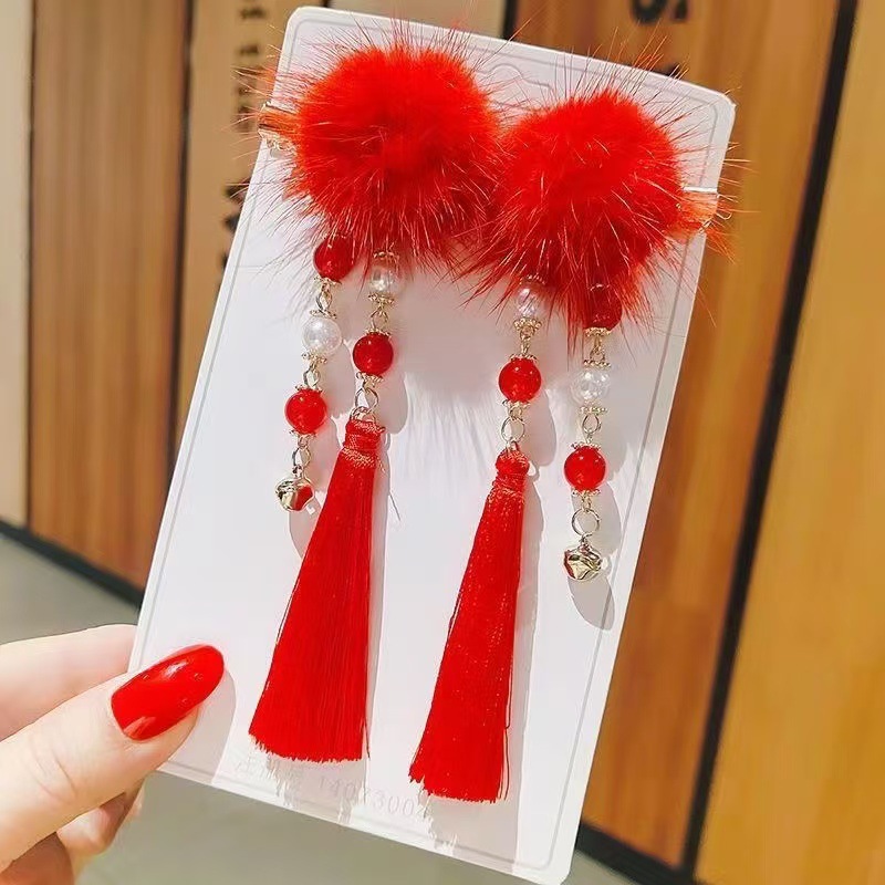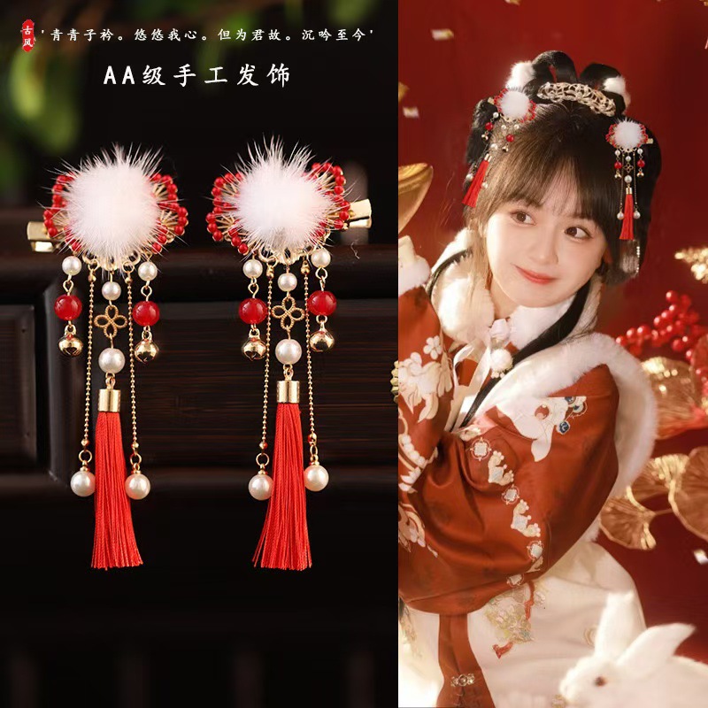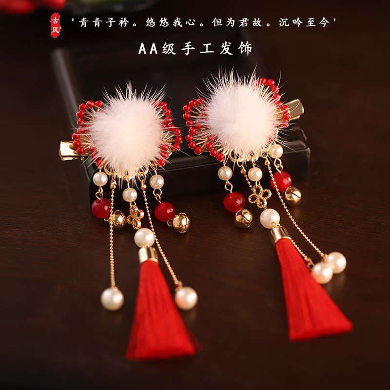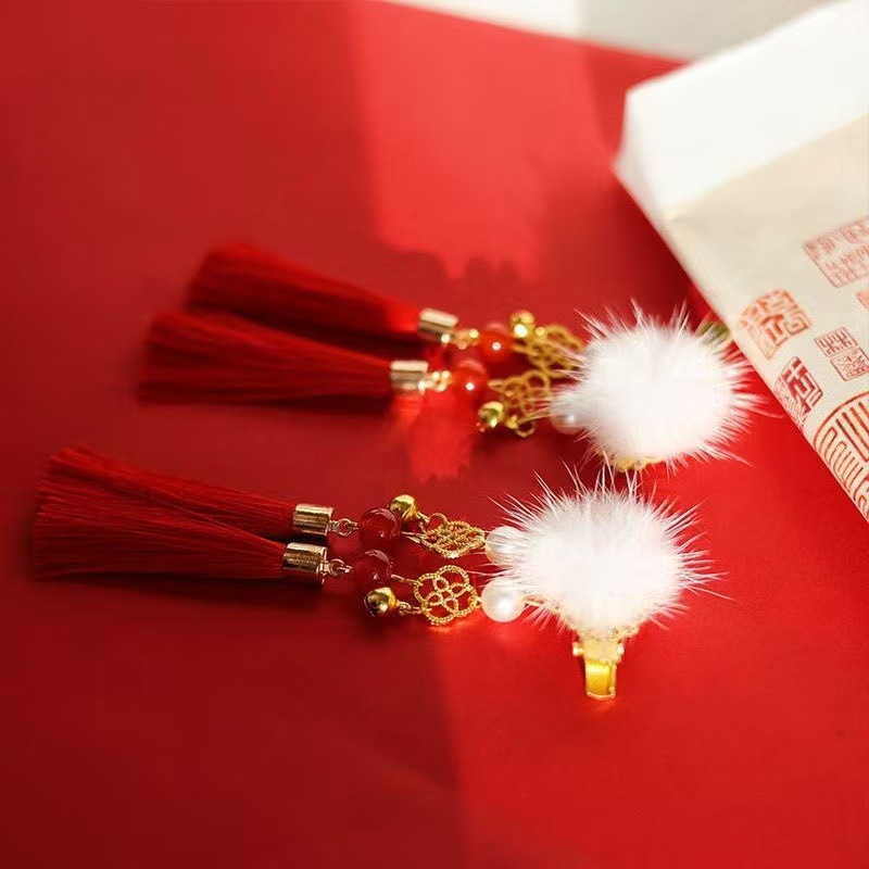 새해 헤어 액세서리 클립 수제 헤어 액세서리 새해 인사말 소녀의 빨간 머리 공 골동품 사이드 클립 모리 스타일 아름다운 귀여운 술