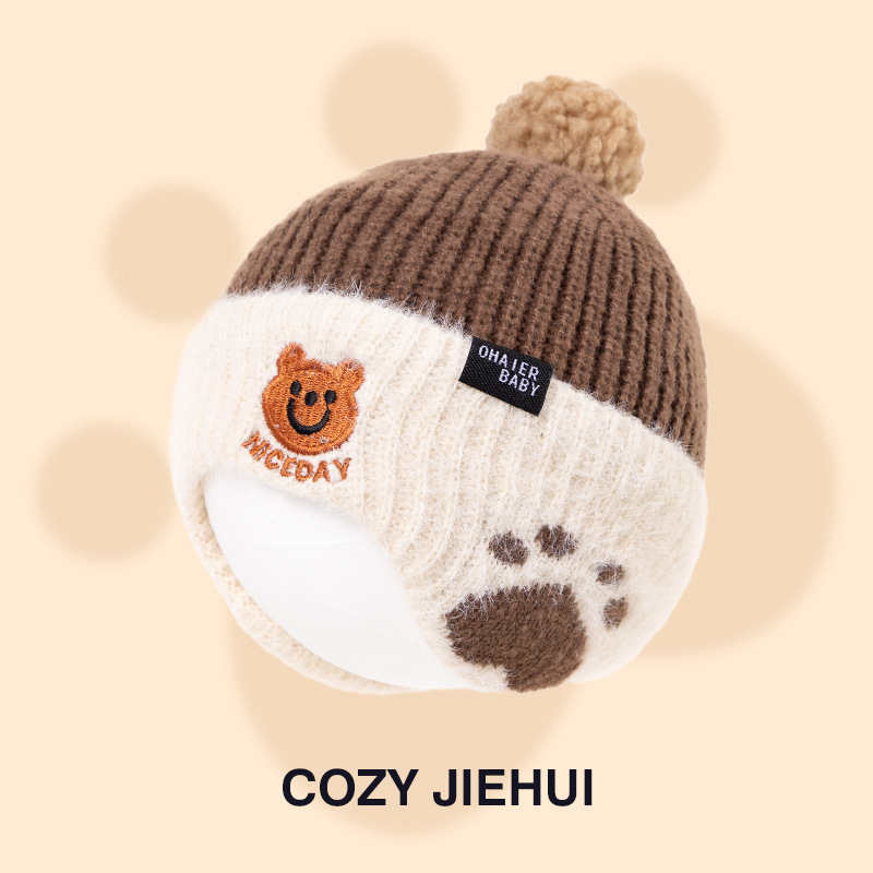한국 스타일 아기 니트 모자 겨울 야외 따뜻한 가리 부모 울 공 귀 보호 모자 귀여운 곰 어린이 모직 모자