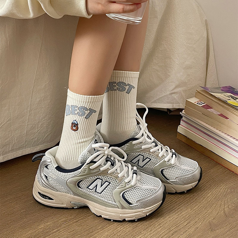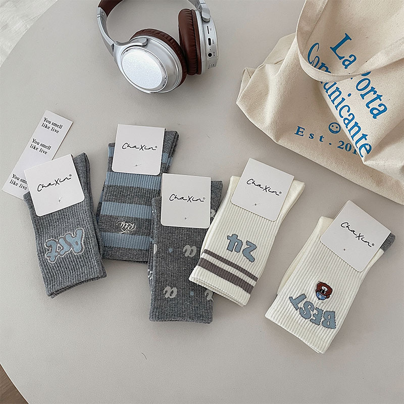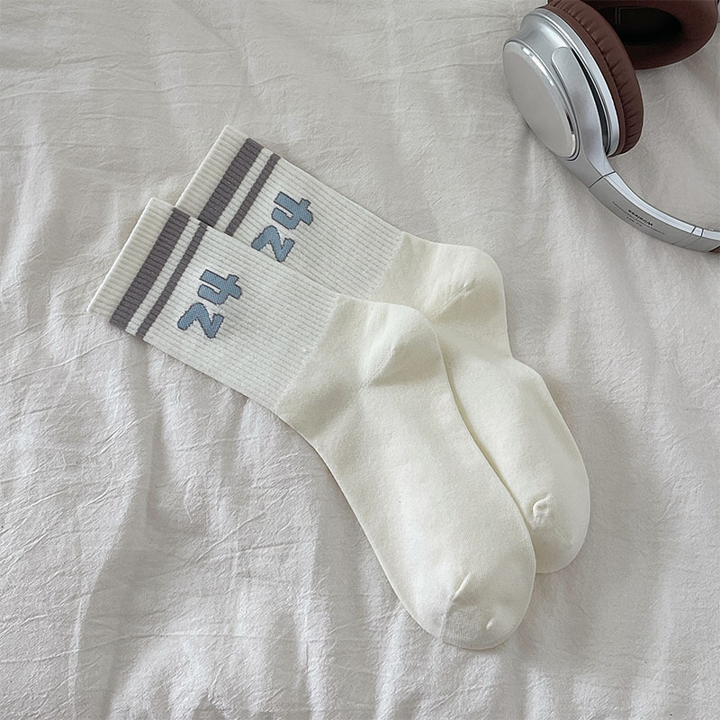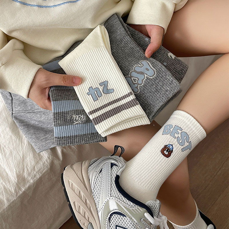 한국식 줄무늬 양말 여자 중간 길이 양말 봄 및 가을 인터넷 인기 올매치 Ins 유행 편지 자수 스케이트 보드 높은 길이 스타킹스토어 가기