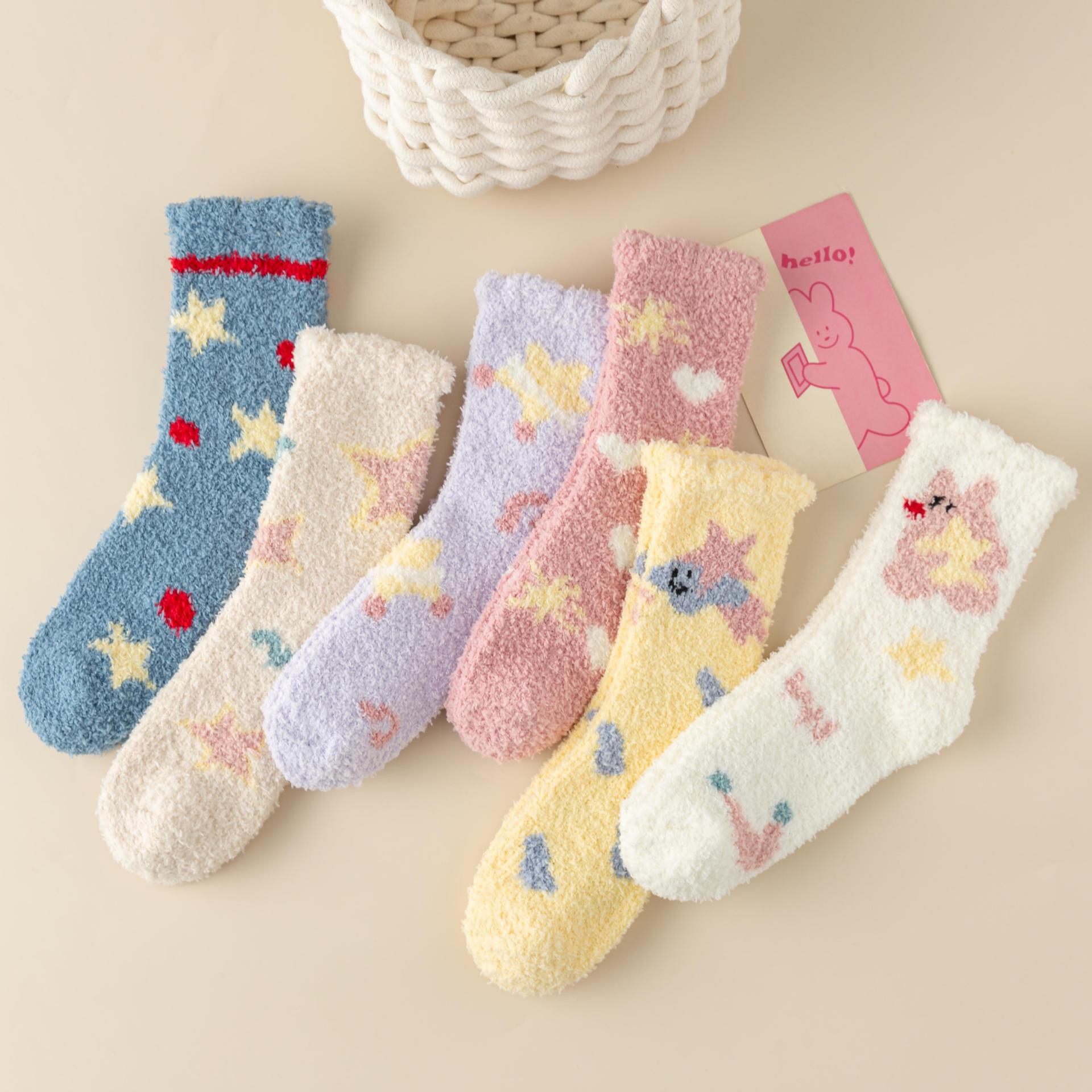 만화 스타 패턴 산호 양털 양말 여성의 중간 튜브 양말 가을과 겨울 기모 두꺼운 가정 따뜻한 수면 양말