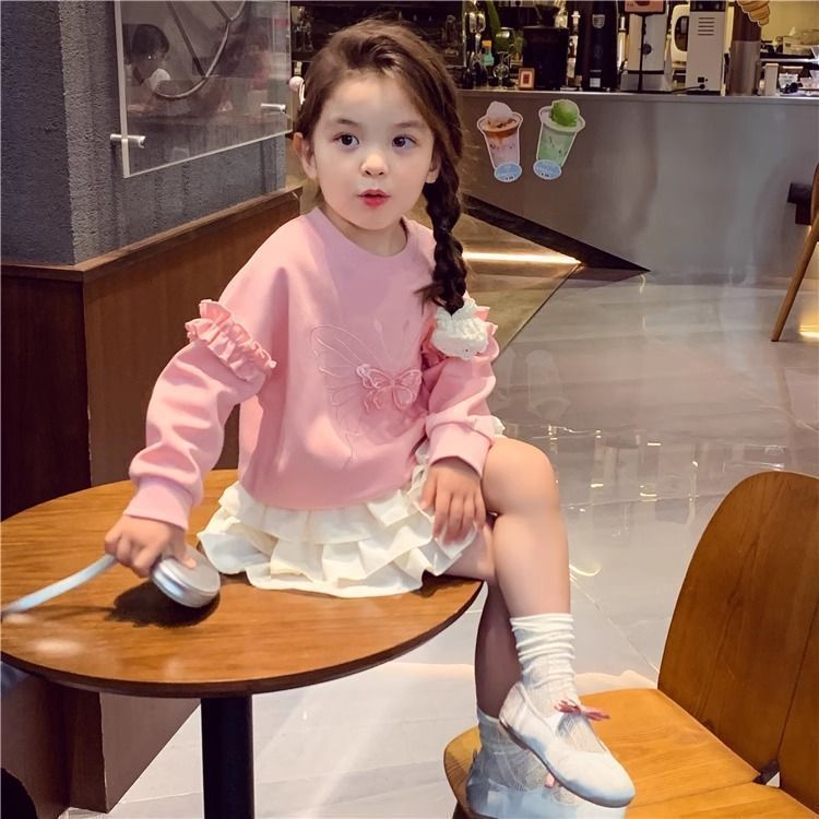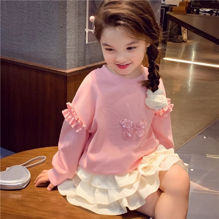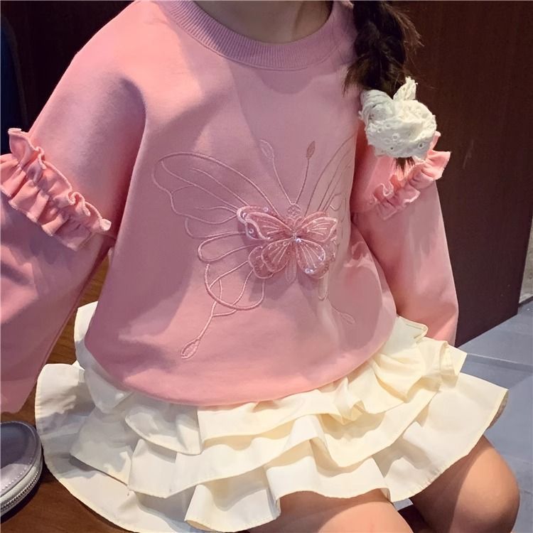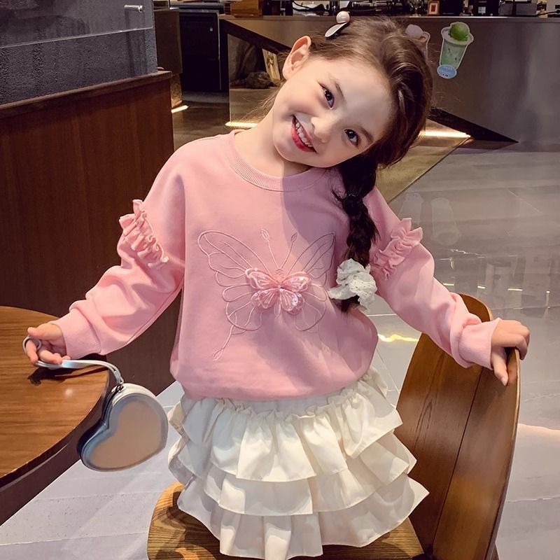 여자 운동복 봄, 가을 2025 새로운 한국 스타일 외국 스타일 어린이 나비 유행 긴팔 탑 중대형 어린이 소녀