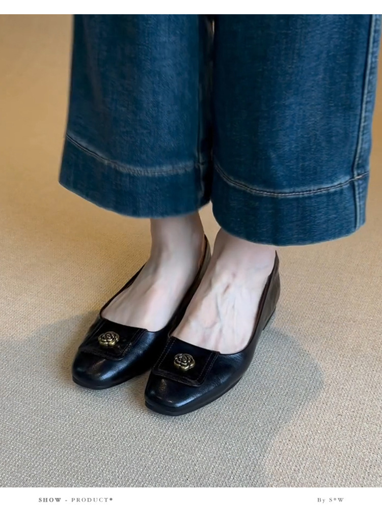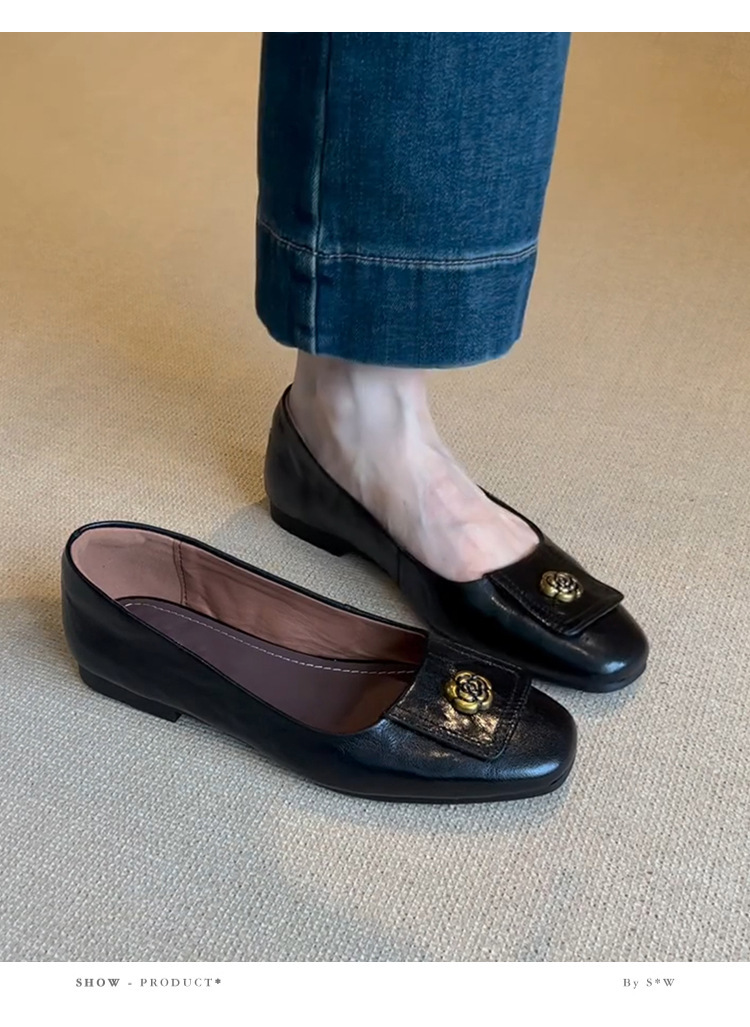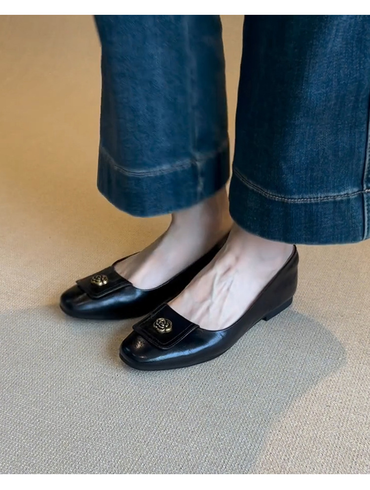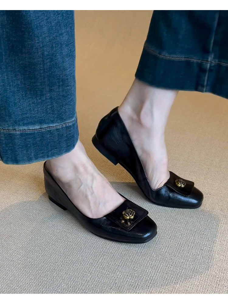 니치 스퀘어 헤드 디자인 신발 여성 2024 년 봄과 가을 새로운 레트로 카멜리아 통근 올 매치 얕은 입 작업 신발