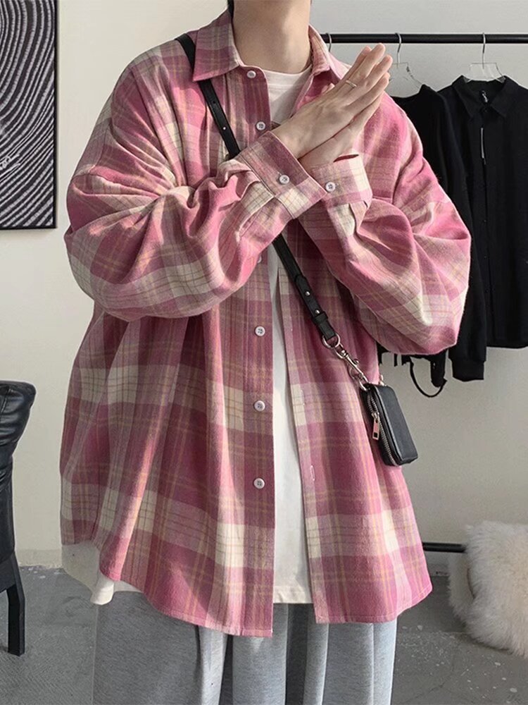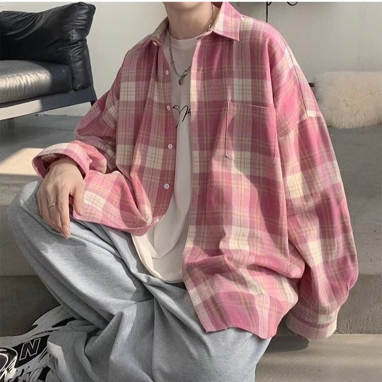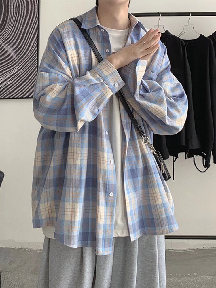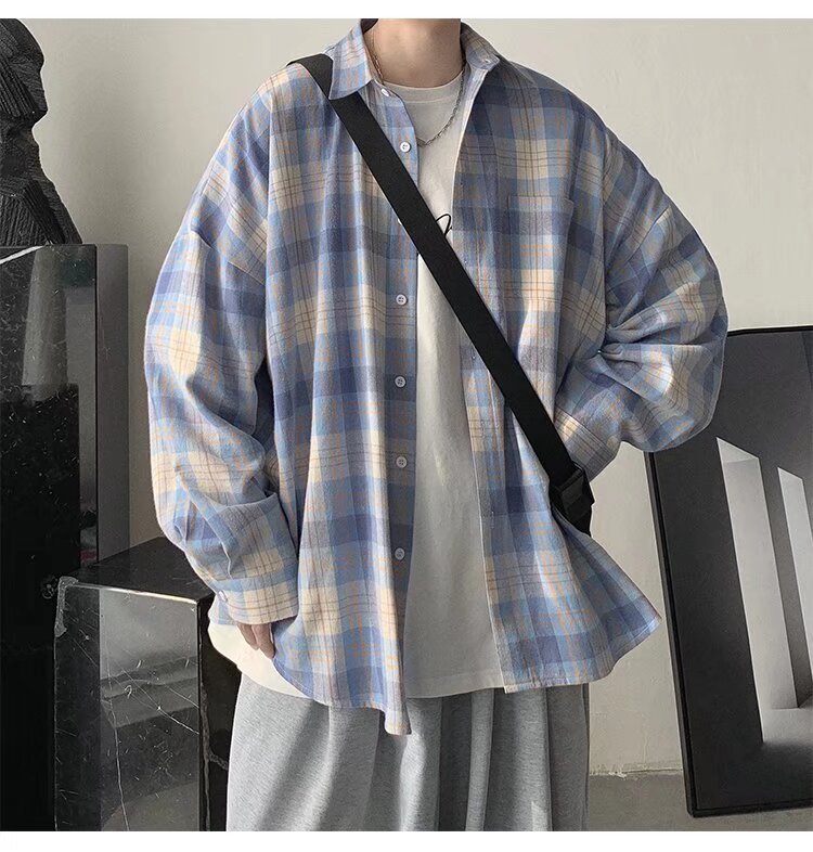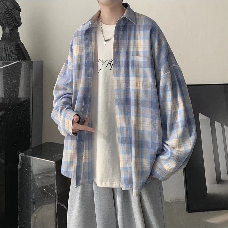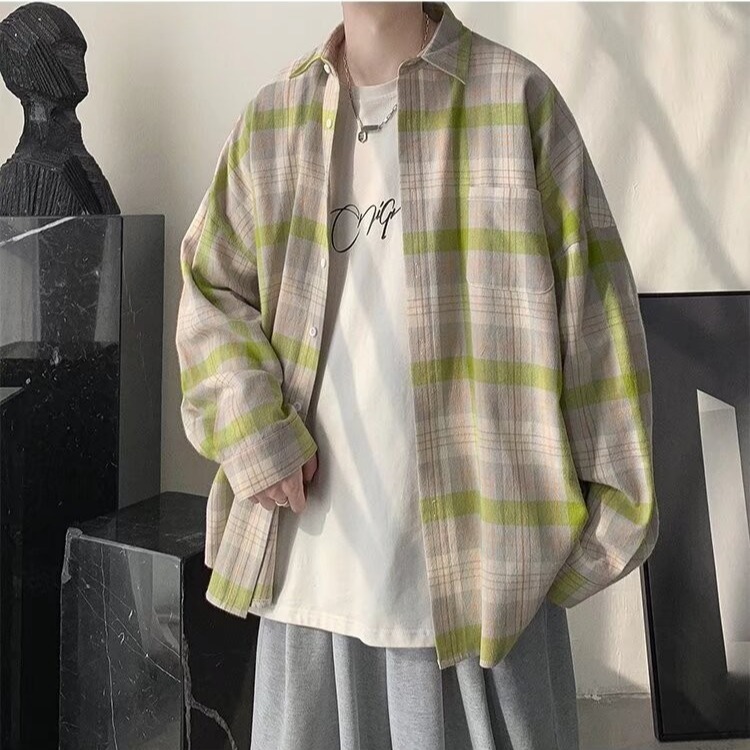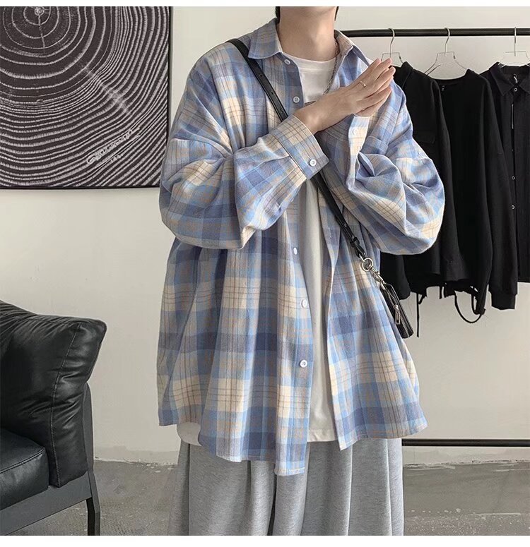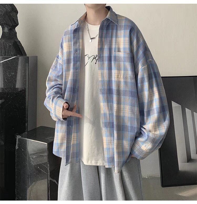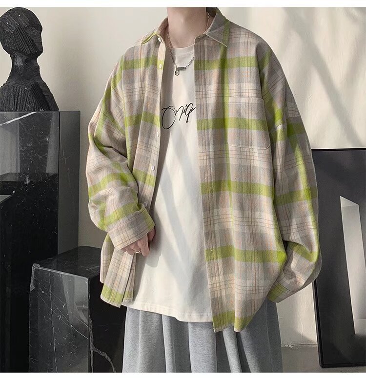 봄과 가을 홍콩 스타일 체크 무늬 셔츠 남자 Ins 한국 스타일 유행 느슨한 긴 소매 셔츠 일본 스타일 게으른 스타일 캐주얼 자켓스토어 가기