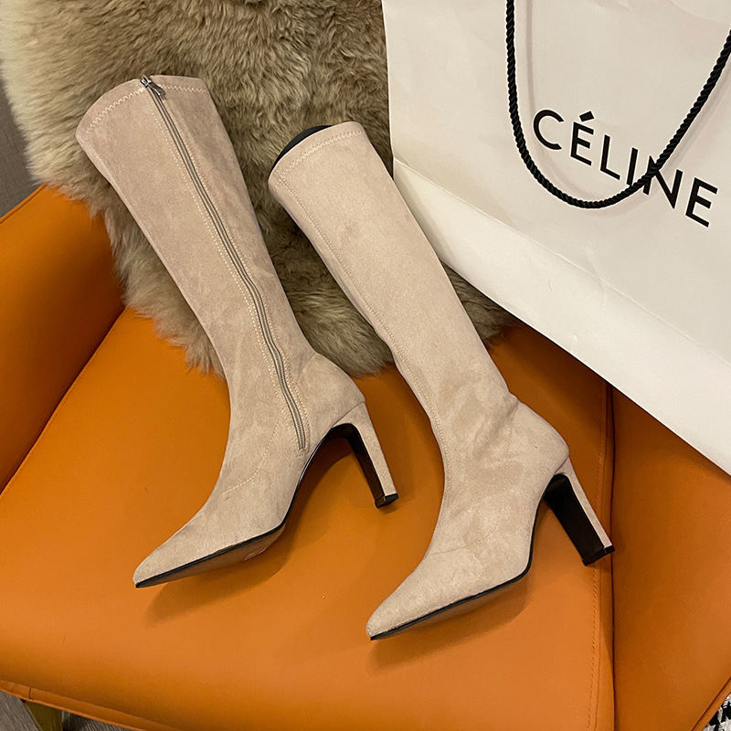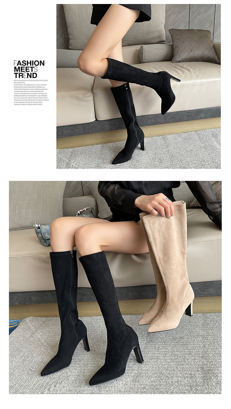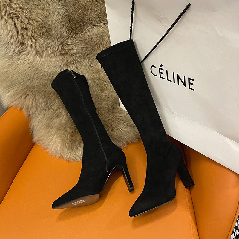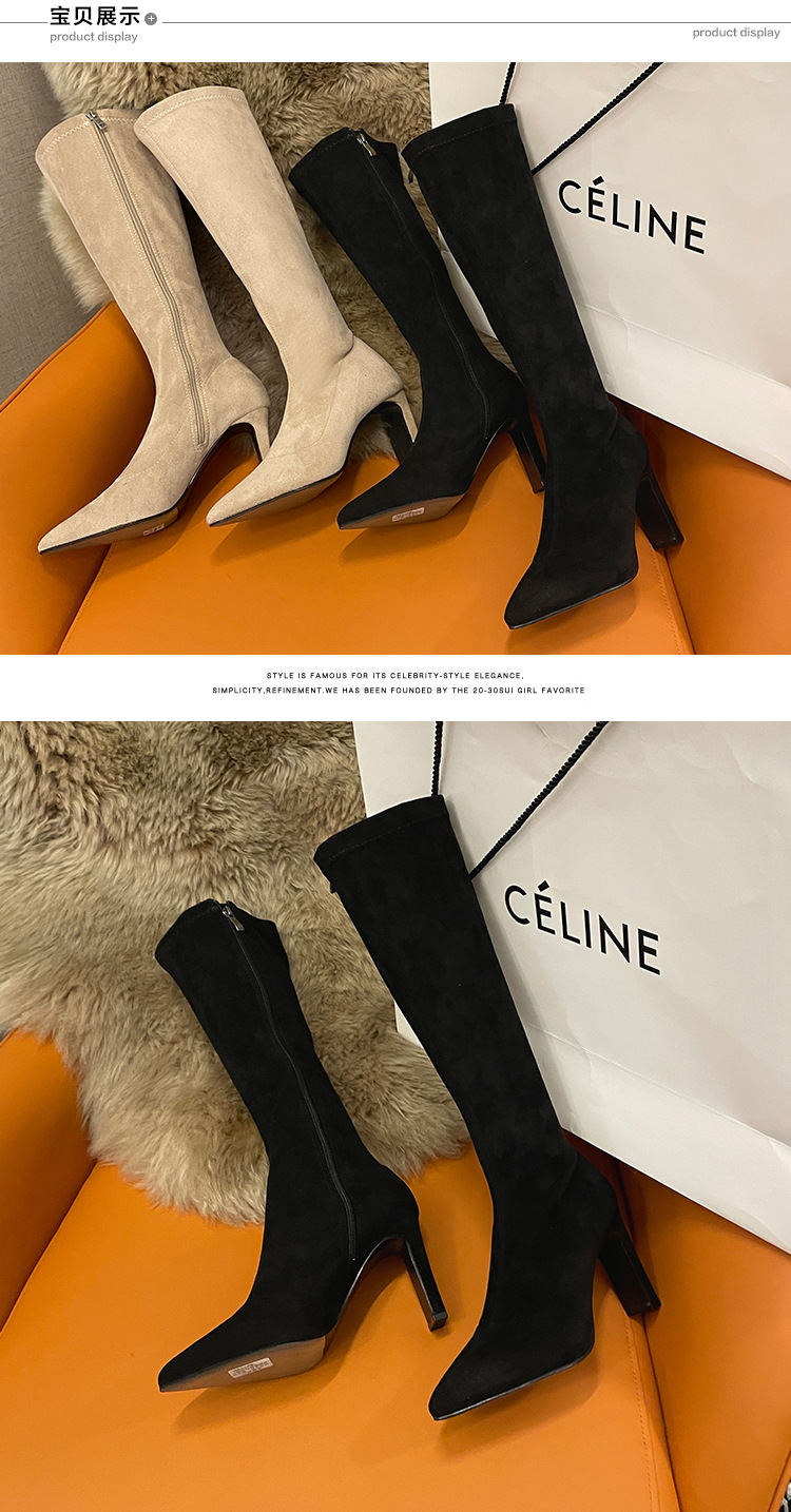 2024 가을과 겨울 새로운 한국식 미드 힐 여성 부츠 단색 두꺼운 뒤꿈치 뾰족한 부츠 얇은 부츠 무릎 부츠스토어 가기
