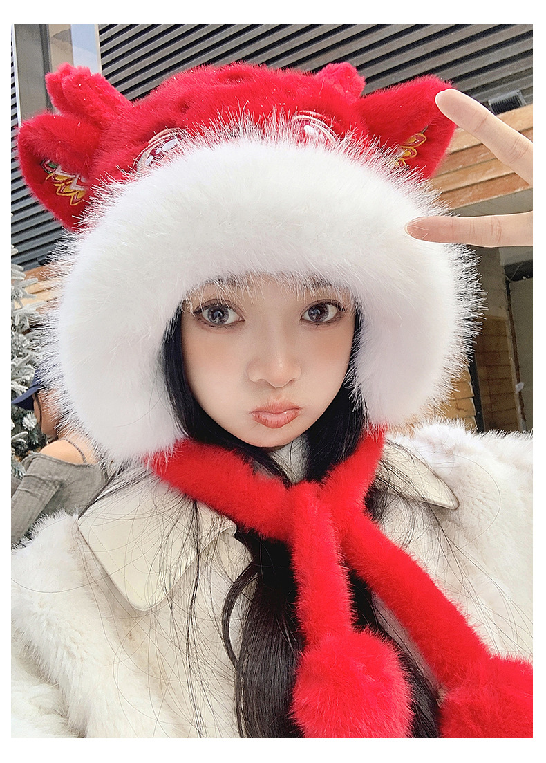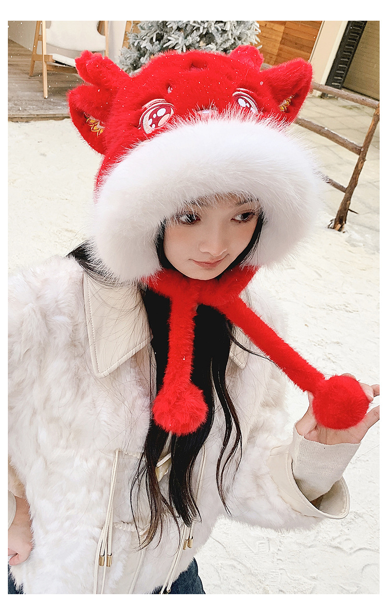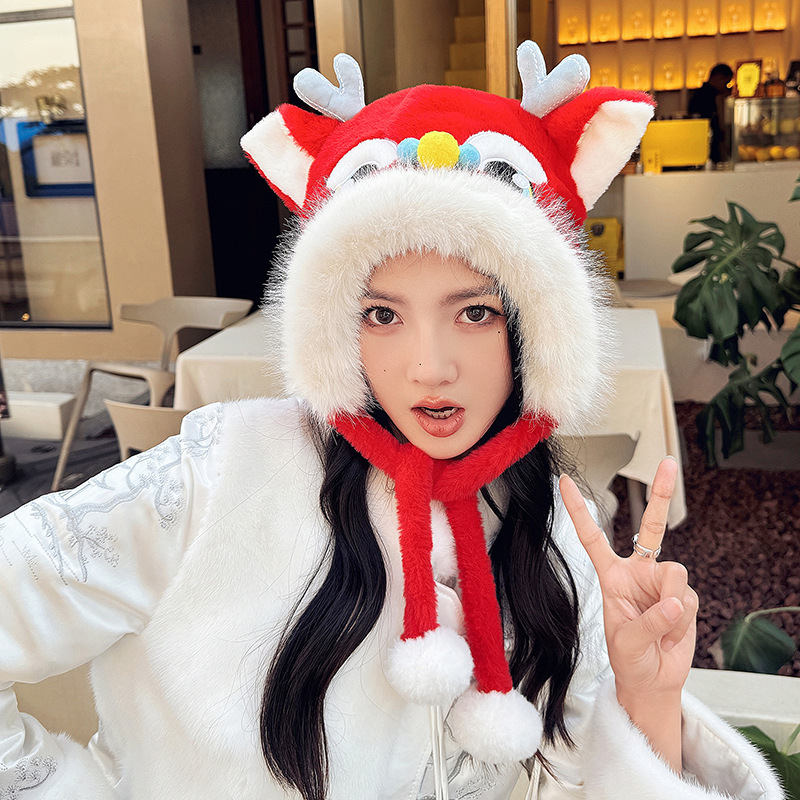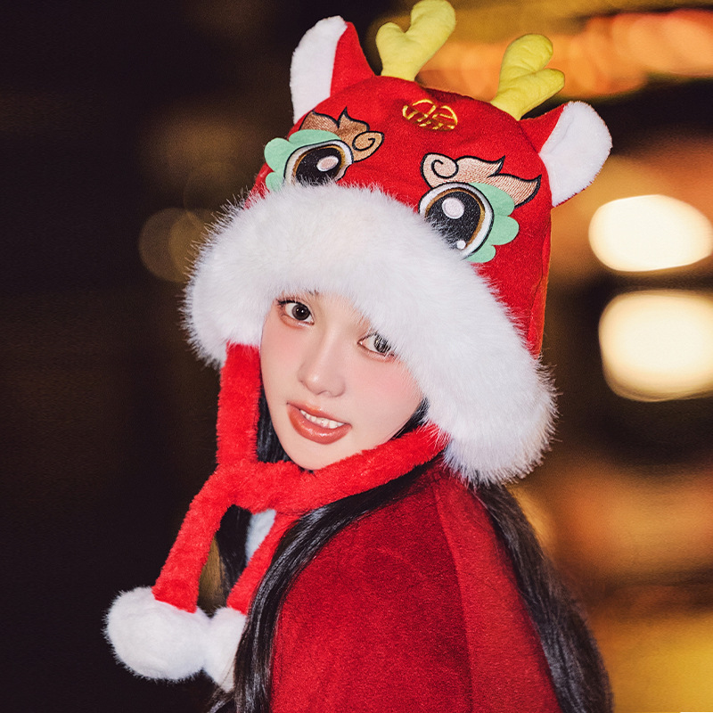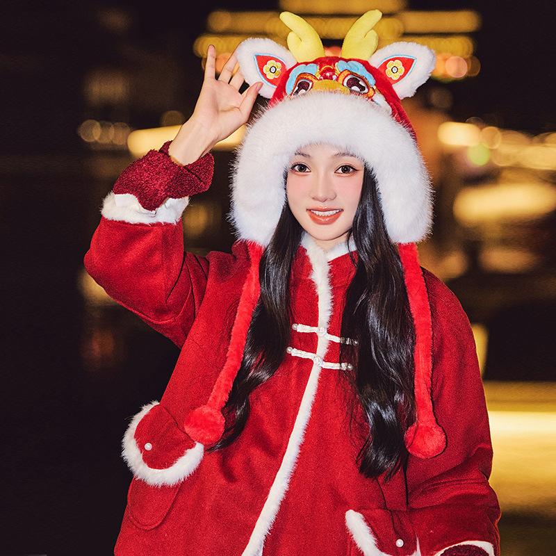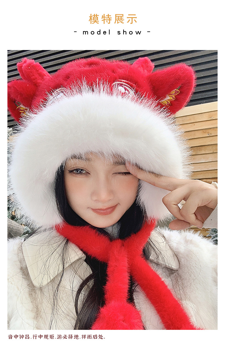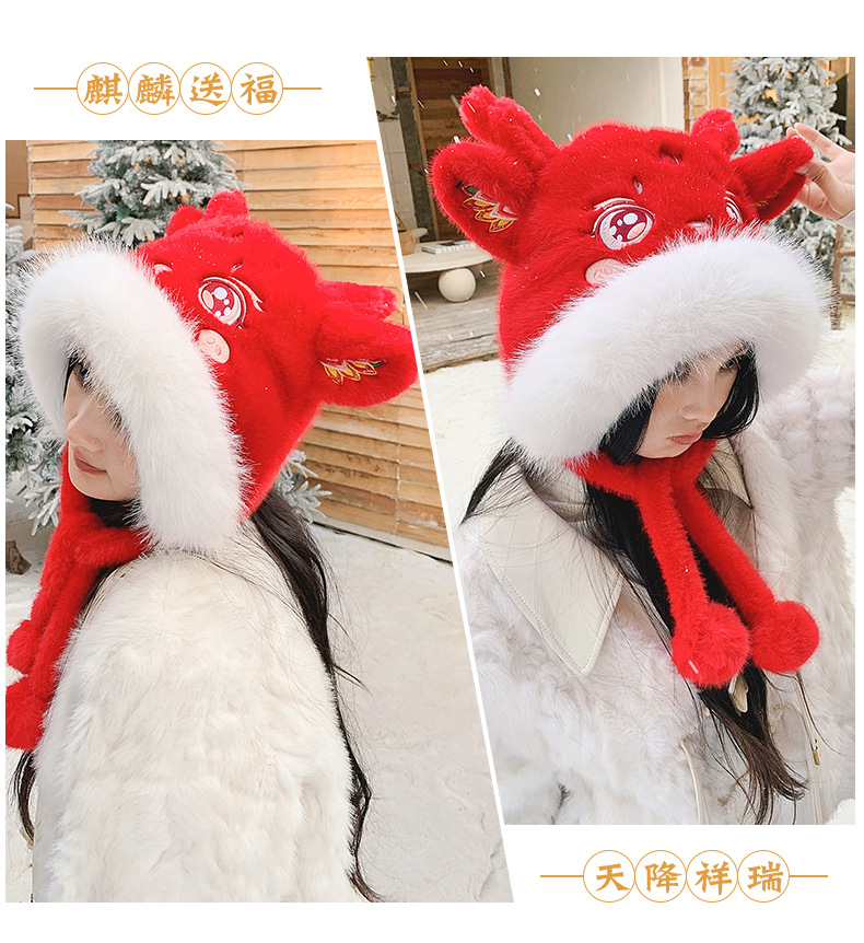 国潮麒麟加厚毛绒帽新年刺绣护颈帽
