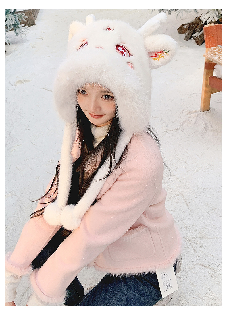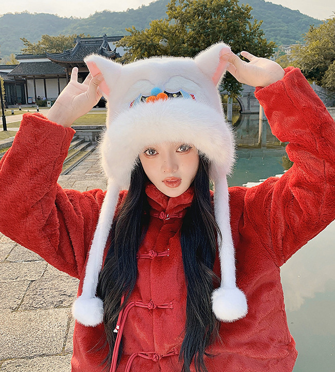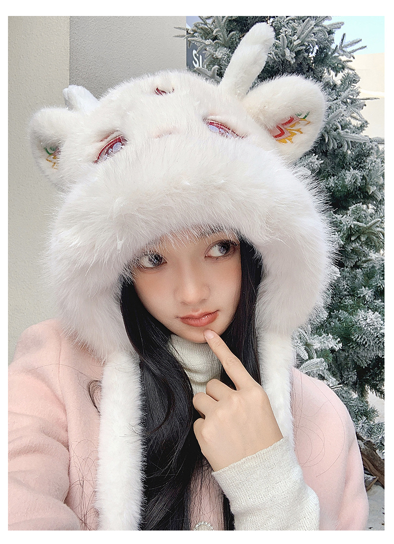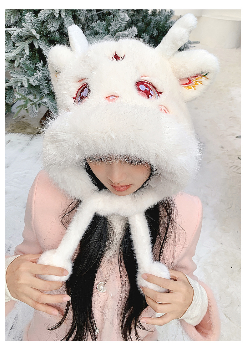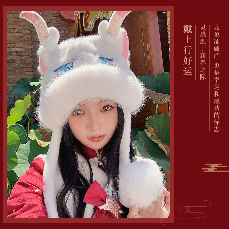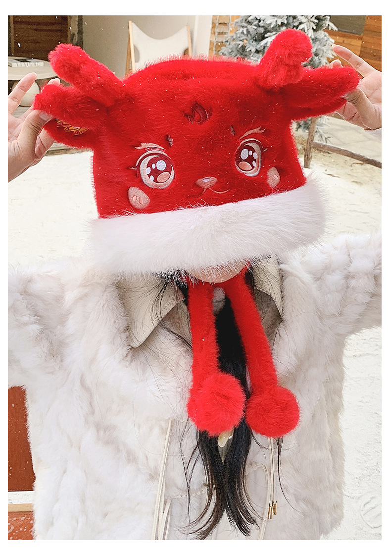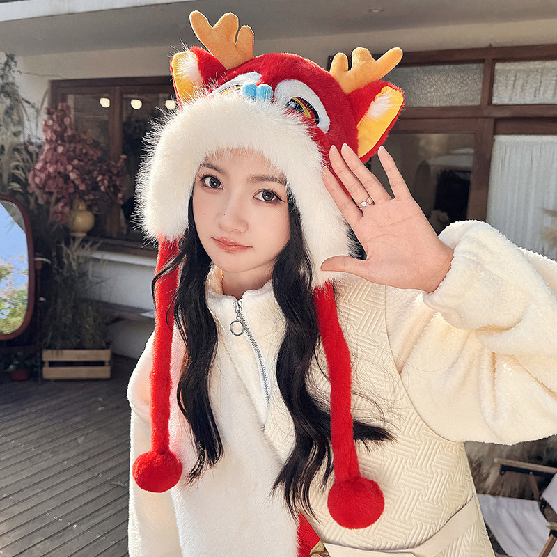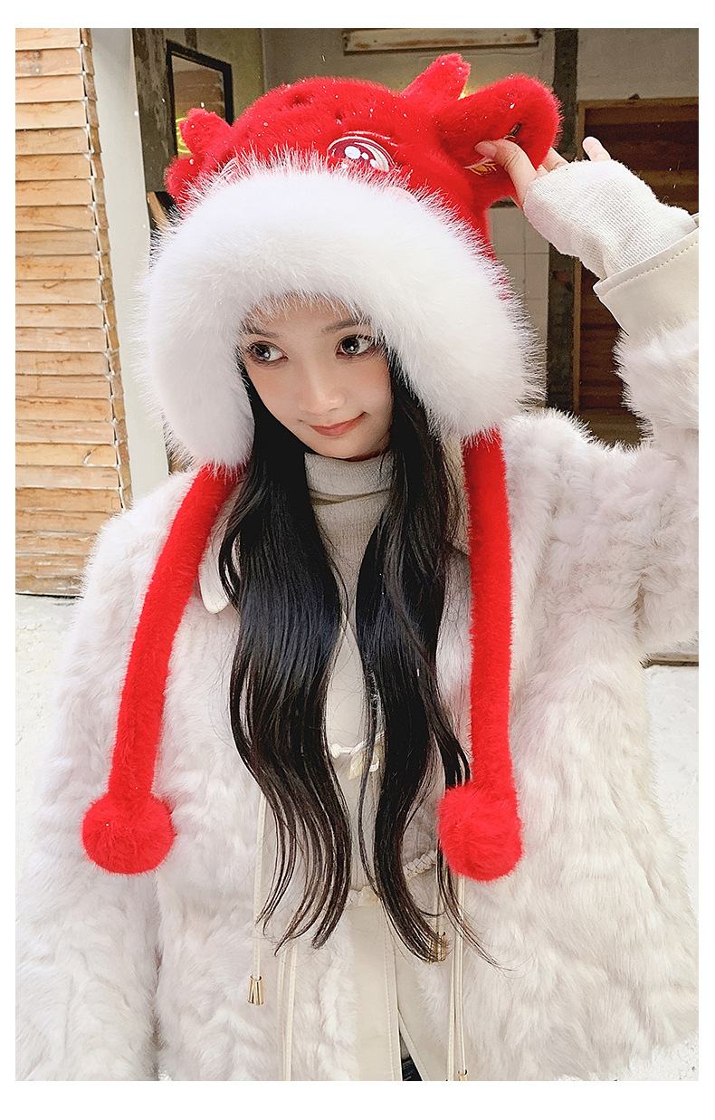 国潮麒麟加厚毛绒帽新年刺绣护颈帽