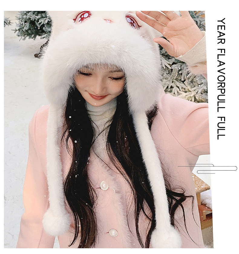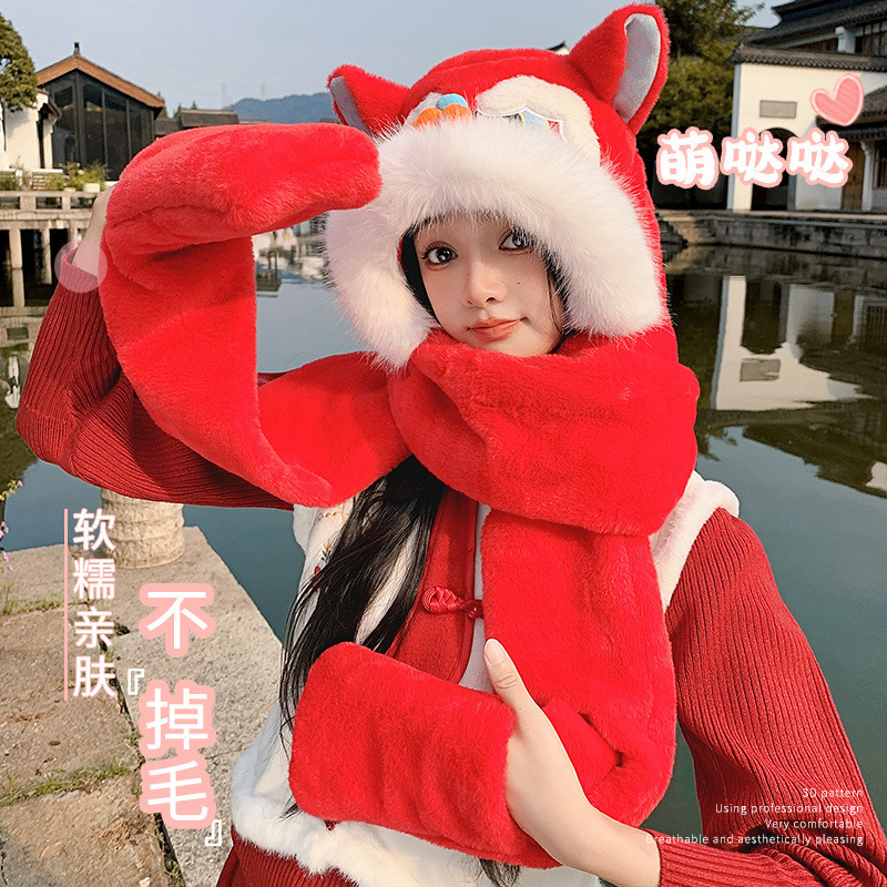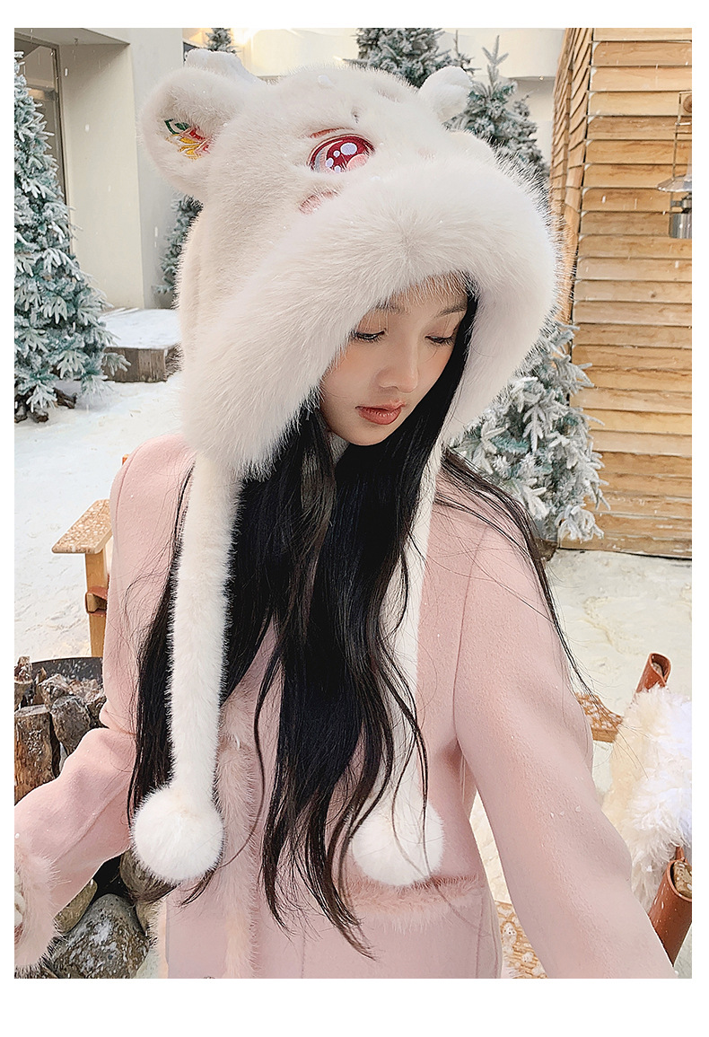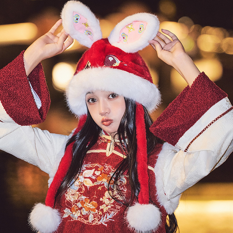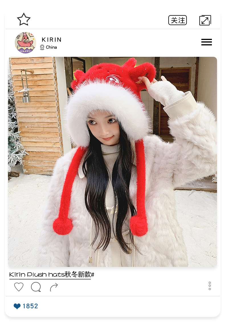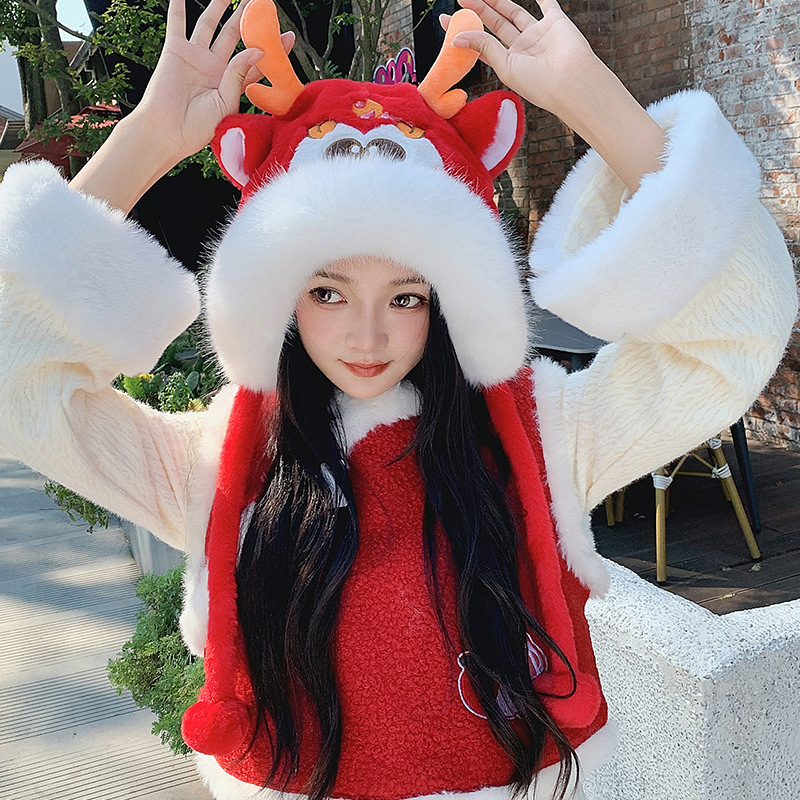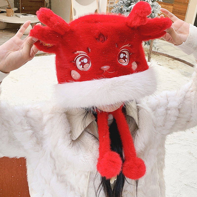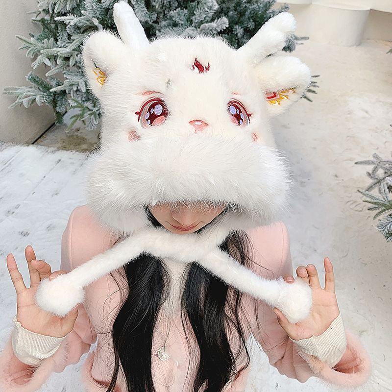 国潮麒麟加厚毛绒帽新年刺绣护颈帽