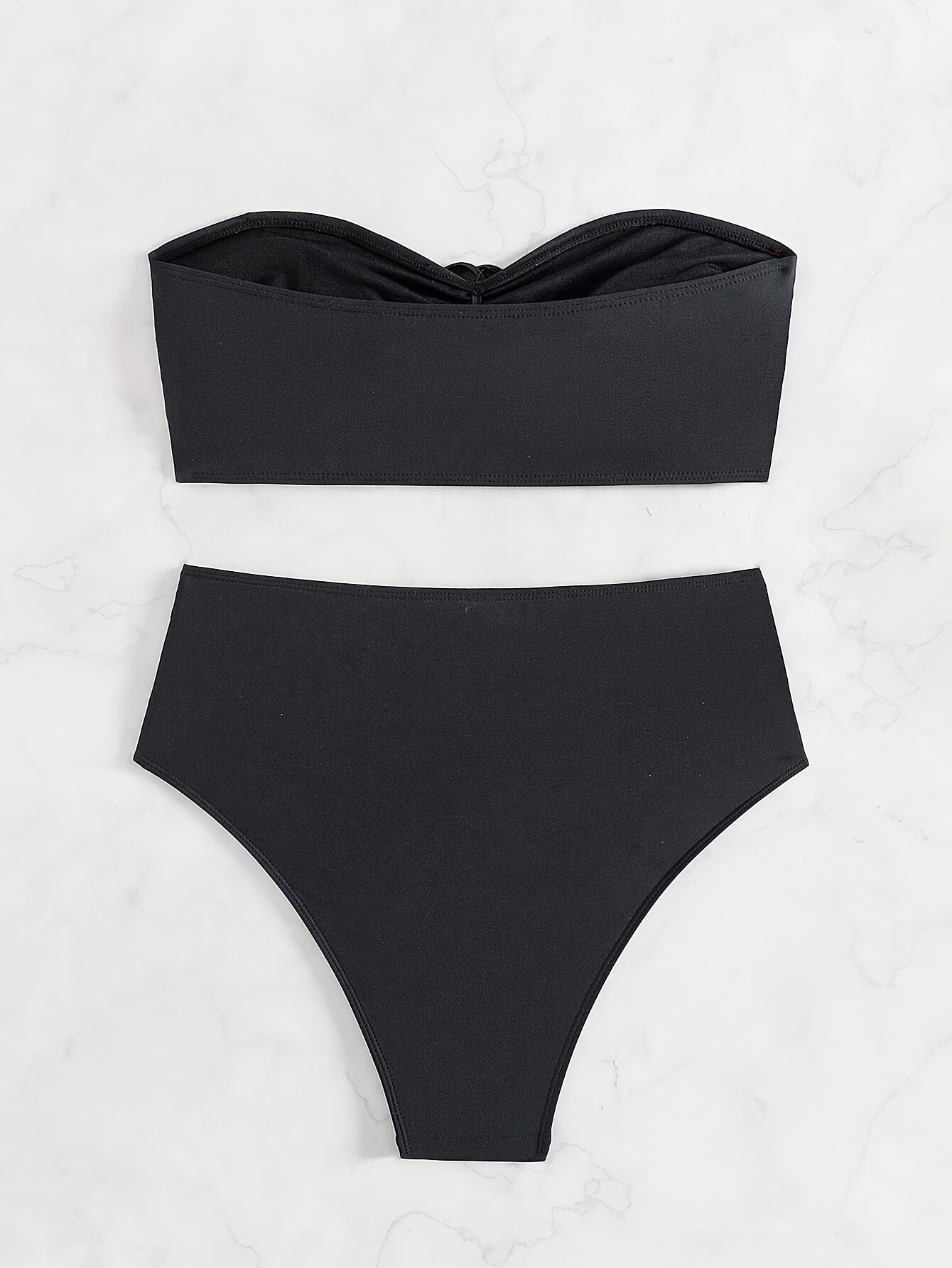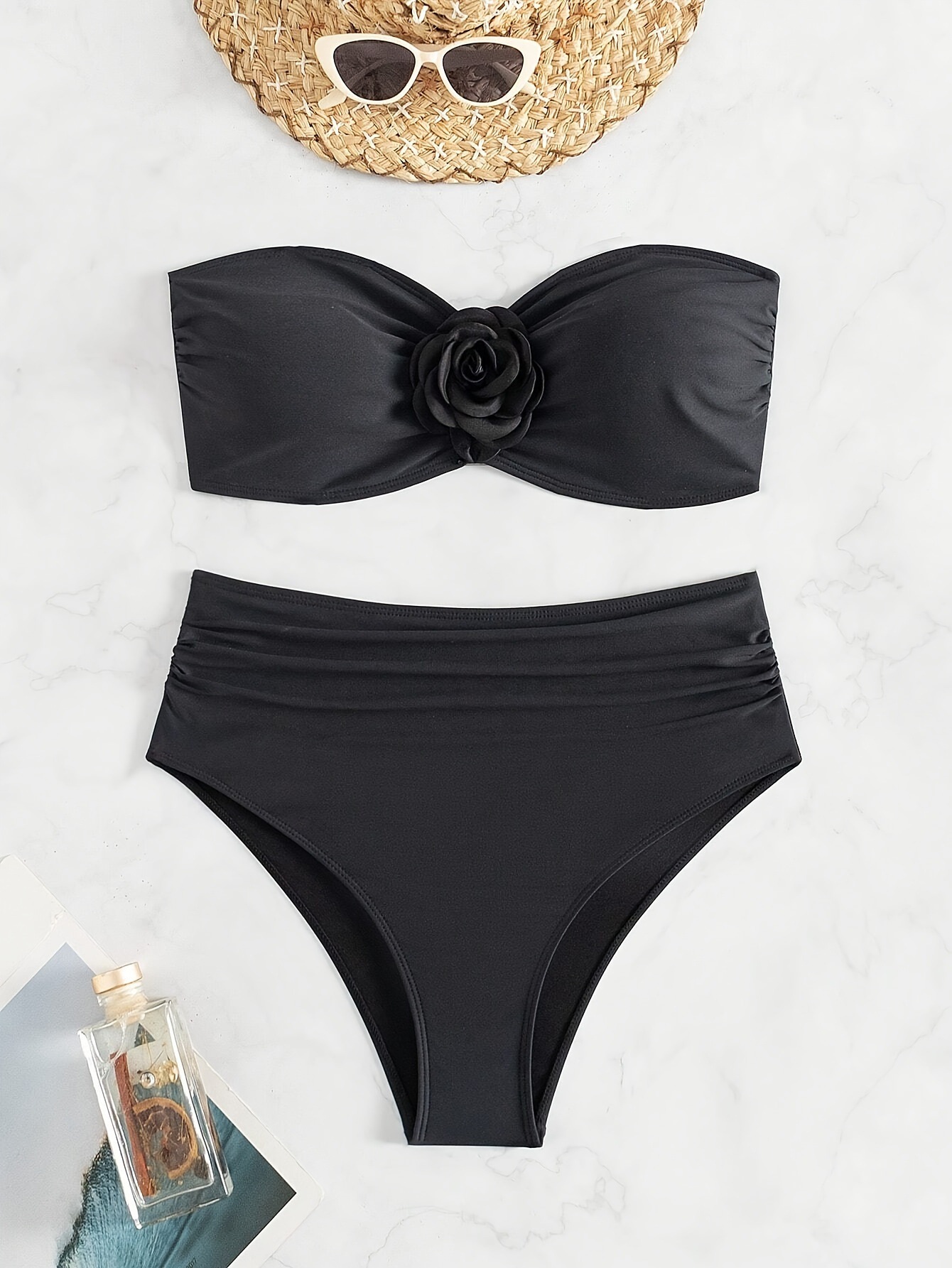 Qian Mo 2024 새로운 유럽과 미국의 검은 꽃 투피스 수영복 여성의 섹시한 분할 높은 허리 비키니 세트