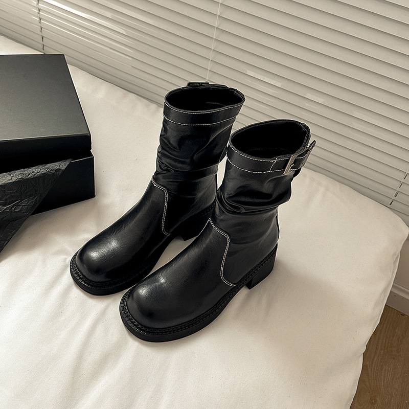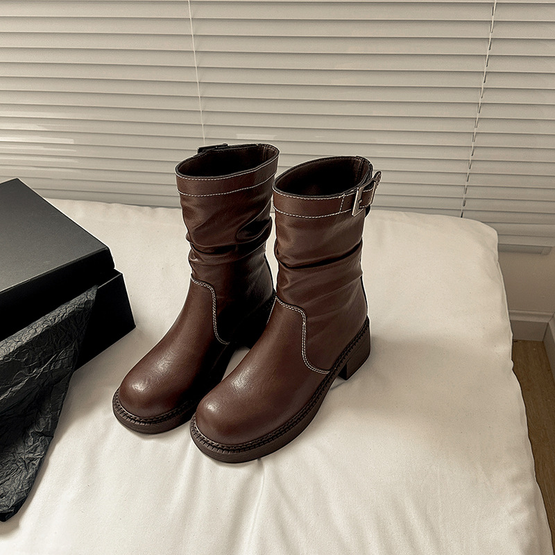 Cowhide 버전 ~ 두꺼운 힐 부츠 여성용 주름 얇은 부츠 레트로 미들 부츠 올 매치 라운드 발가락 영국 스타일 기사 부츠