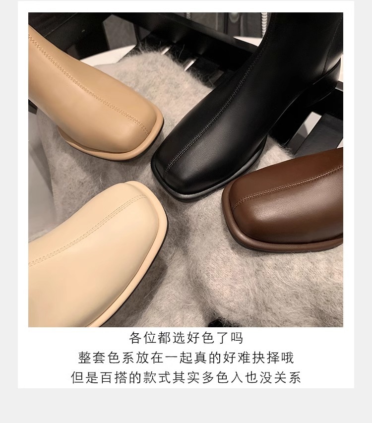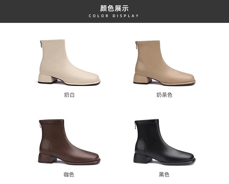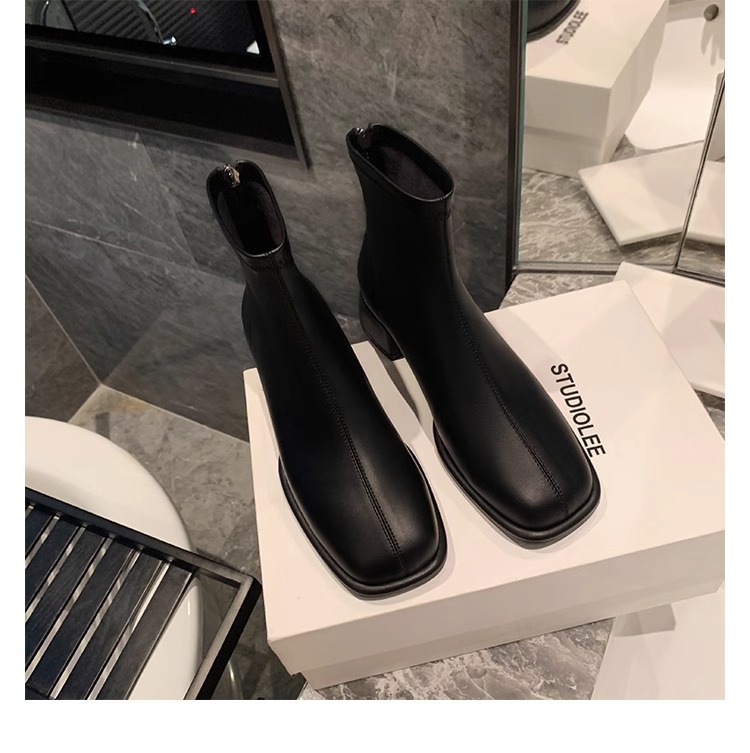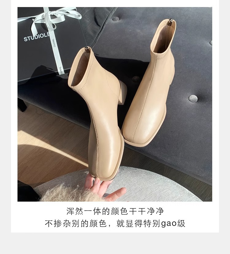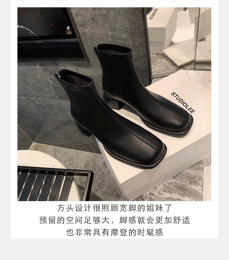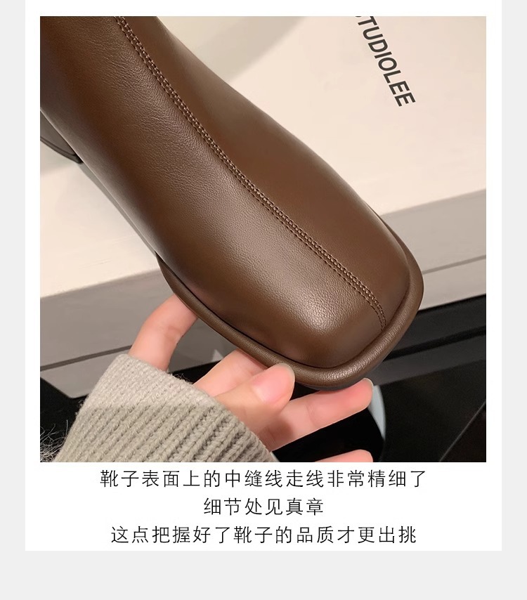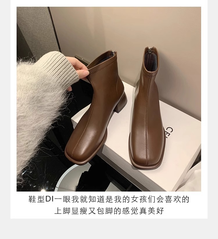 Cowhide Edition ~ 포도 엄마 같은 스타일 프렌치 스퀘어 헤드 두꺼운 힐 쇼트 부츠 여성용 리어 지퍼 얇은 부츠 가죽 마틴 부츠