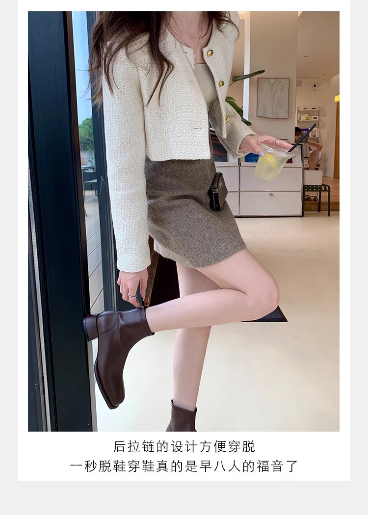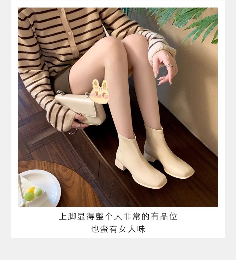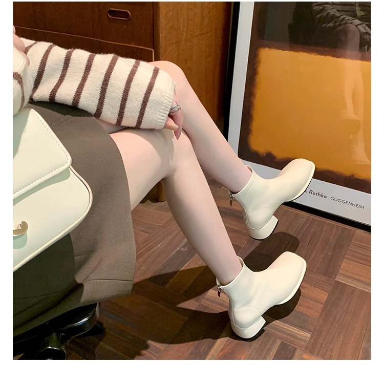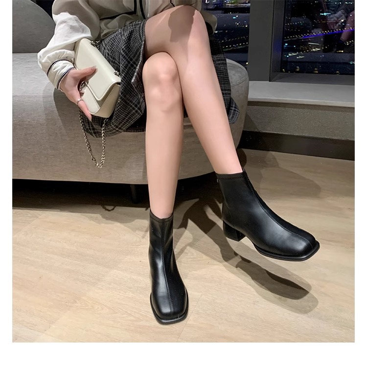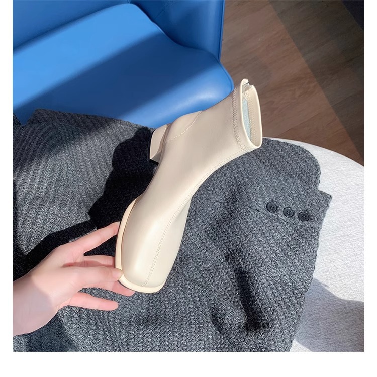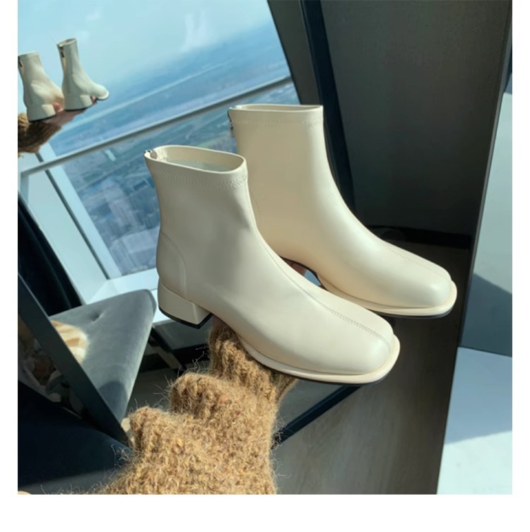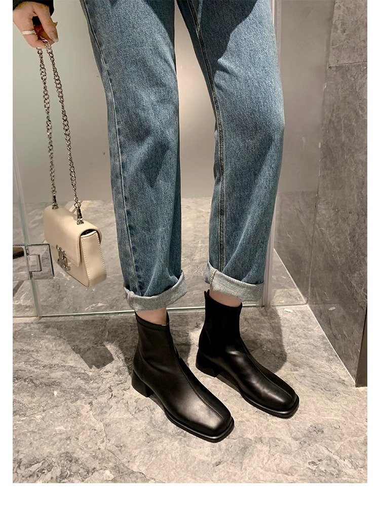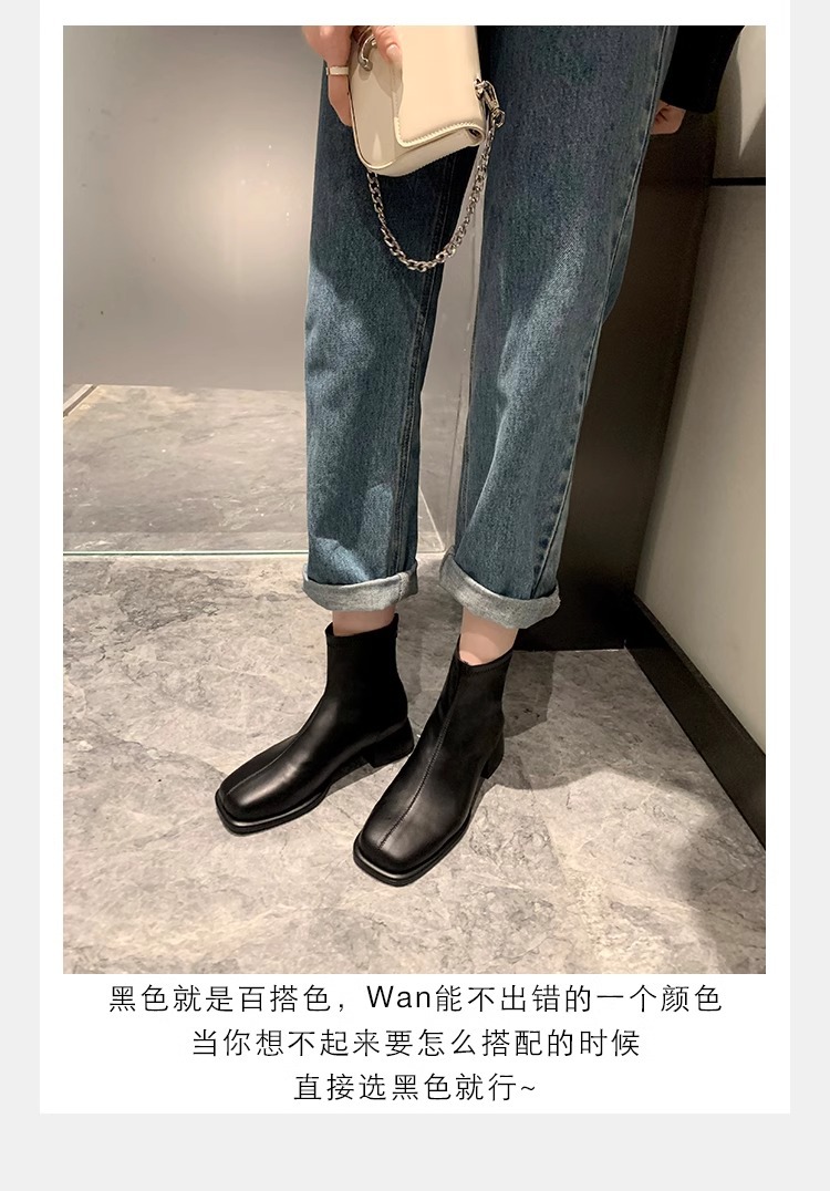 Cowhide Edition ~ 포도 엄마 같은 스타일 프렌치 스퀘어 헤드 두꺼운 힐 쇼트 부츠 여성용 리어 지퍼 얇은 부츠 가죽 마틴 부츠