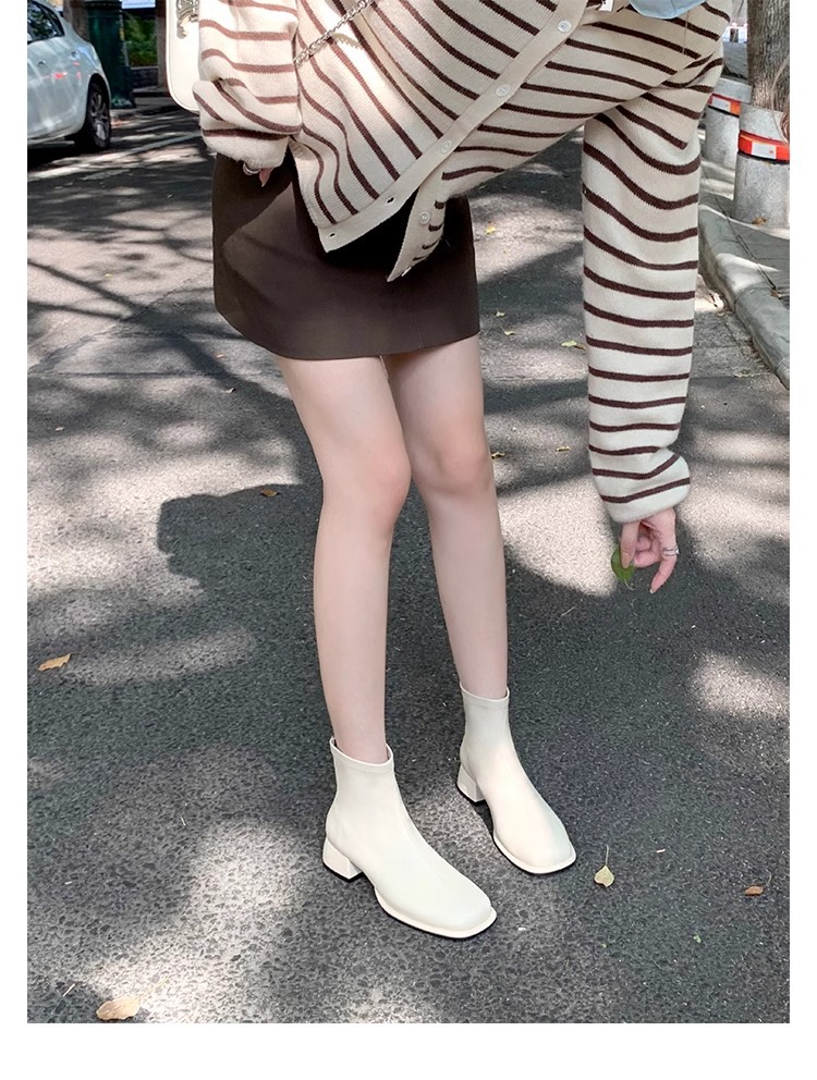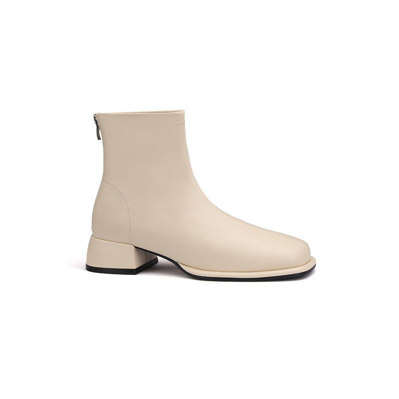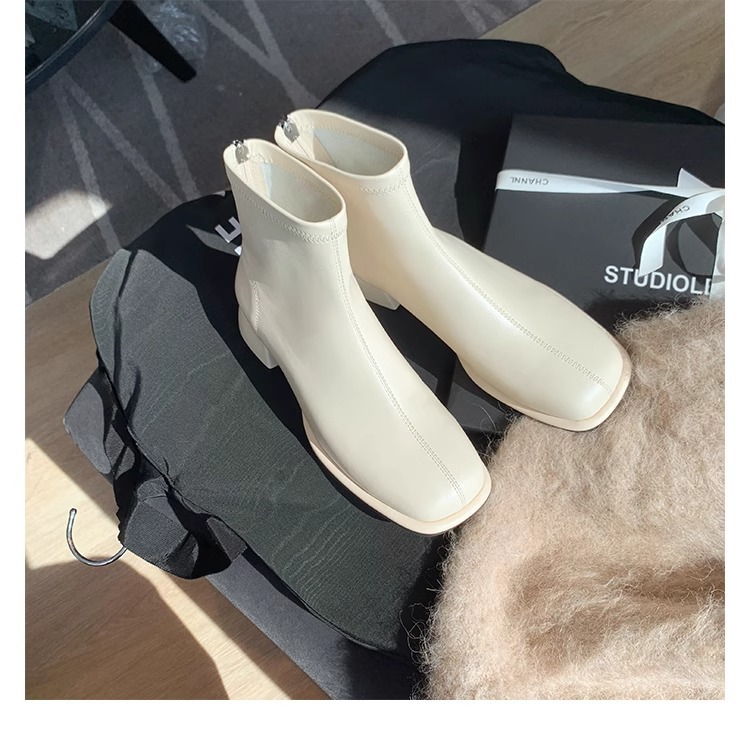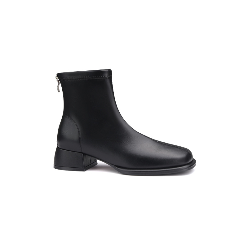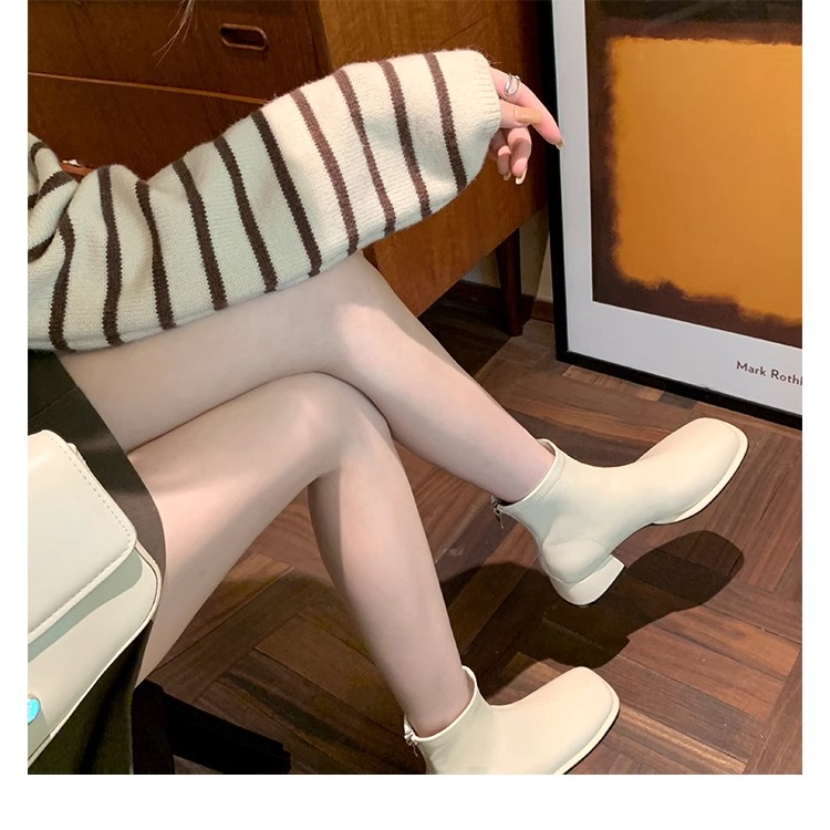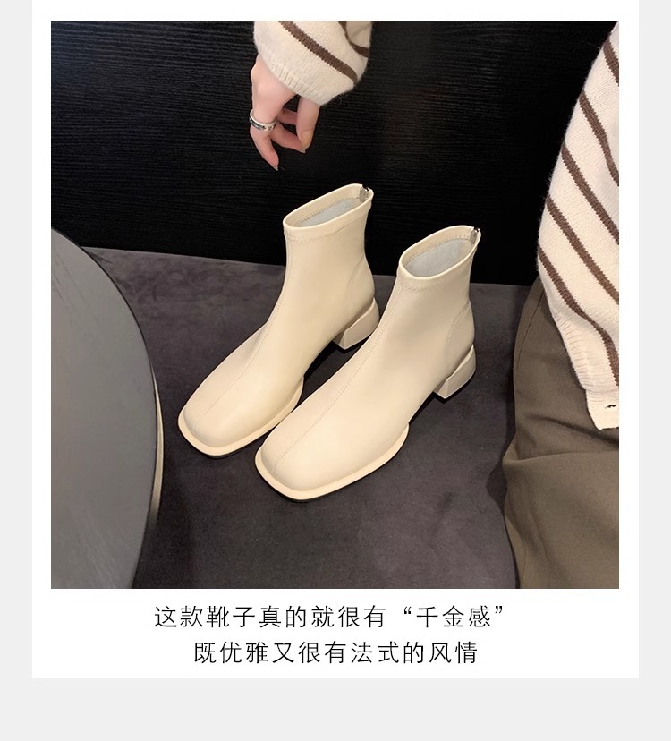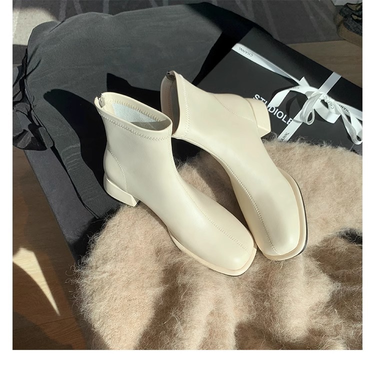 Cowhide Edition ~ 포도 엄마 같은 스타일 프렌치 스퀘어 헤드 두꺼운 힐 쇼트 부츠 여성용 리어 지퍼 얇은 부츠 가죽 마틴 부츠