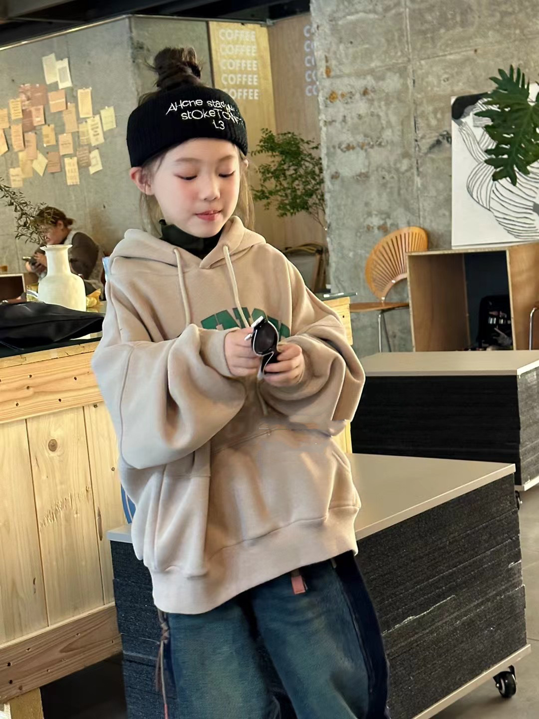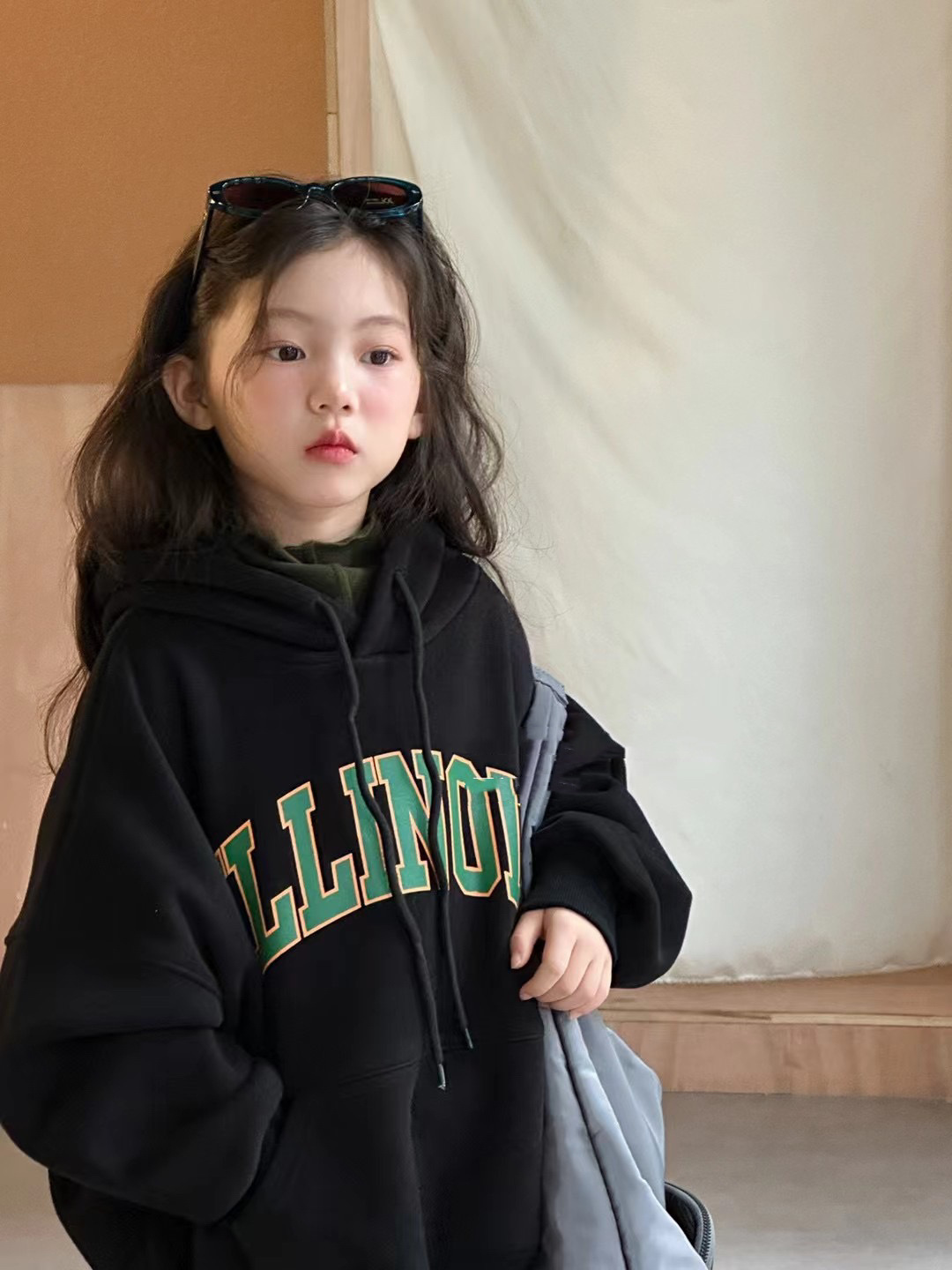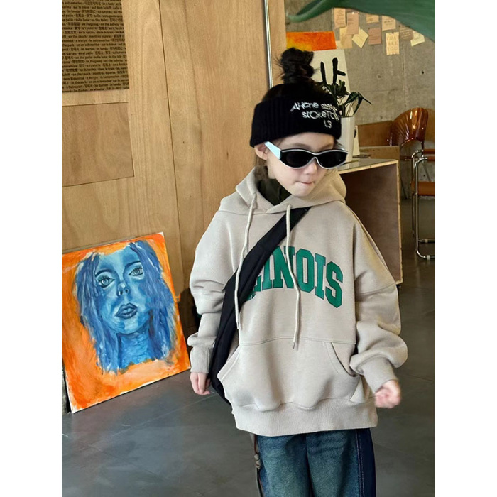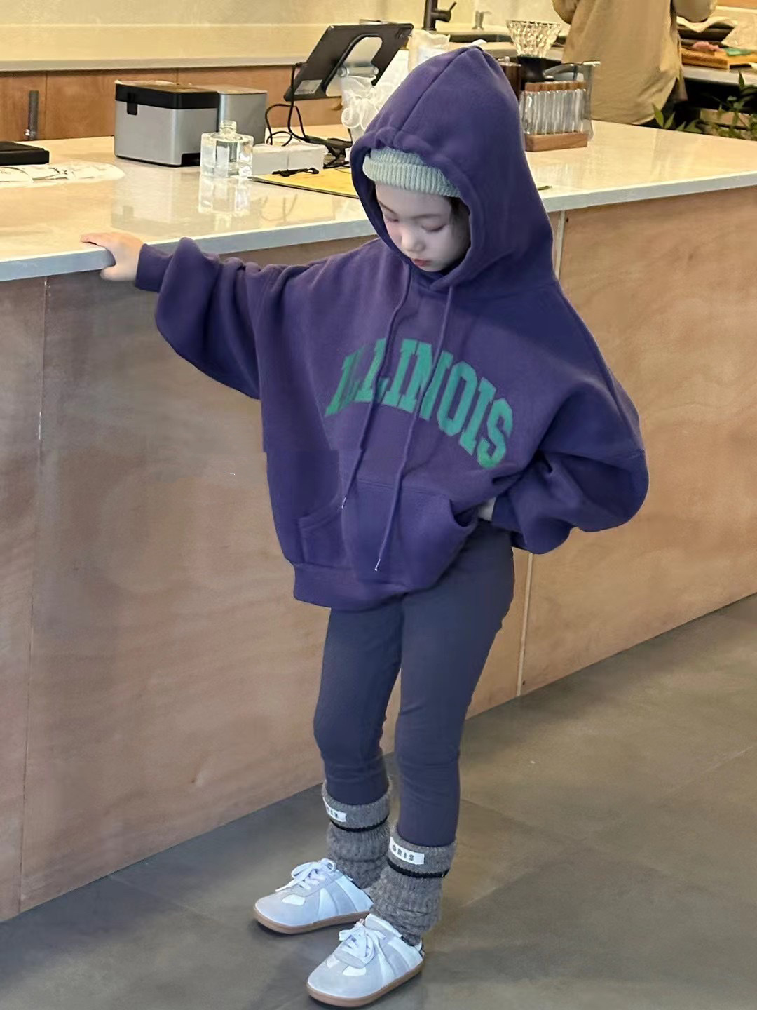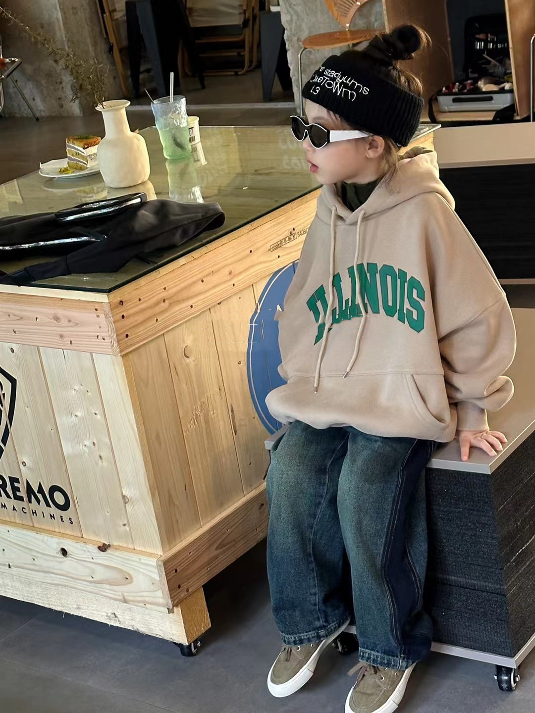 한국 아동복 소녀 편지 후드 기모 땀 2024 겨울 두꺼운 최고 유행 소녀 성격 착용스토어 가기